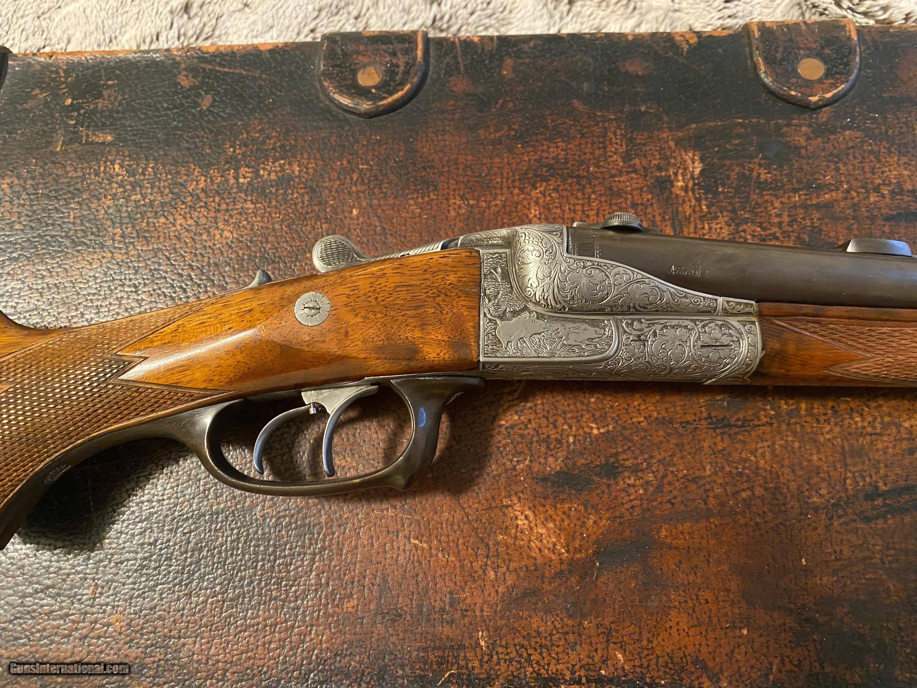 Description: German clamshell action double rifle. Is scoped in a two barrel set, one set of barrels is 8x57R 25 inches long and the other is 9.3x74R 23 inches long both barrels are in good overall condition, with light handling marks on the wood and barrels. 14 1/2 inch length of pull. $8500 or best offer. willing to do layaway SOLD Curio/Relic: Yes Rifle Caliber: 9.3x74mmR, 8x57mm JR Manufacturer: A. Losche Hof-Waffenfabrikand Serial Number: 2458-68 Barrel Length: 23in and 25in Condition: Good Metal Condition: Good Wood Condition: Good Bore Condition: Good Case: Heavily used |