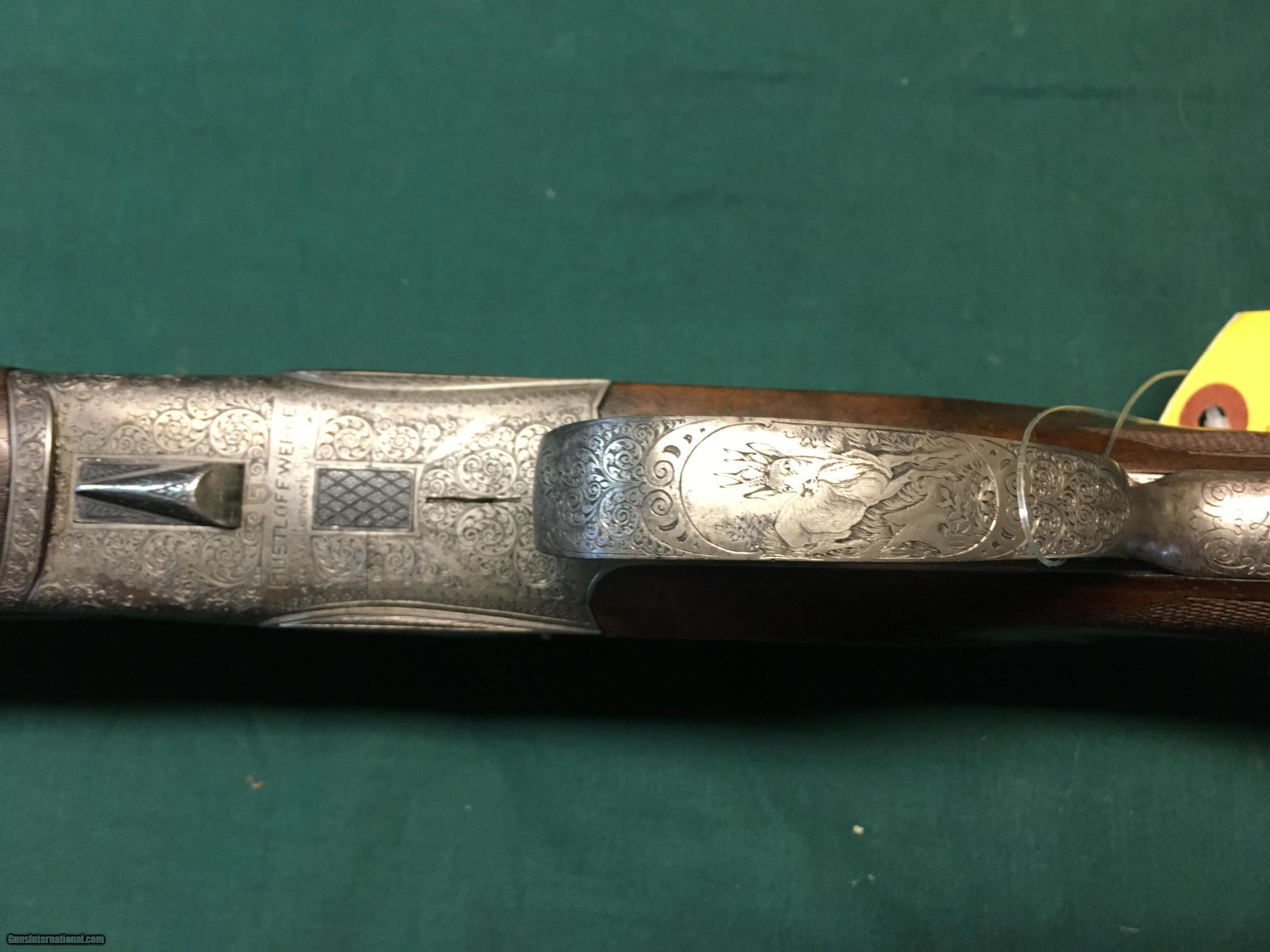 Description: For sale is a beautiful Gustloff Werke over under double rifle chambered in 9.3x74R. The rifle has 24 1/2 inch barrels, double triggers which both set,sling swivels, claw scope bases, rear sight with a standing leaf & 1 folding leaf, extractors, and locks with a double underlug & Kersten bolt. The wood is dark with very pretty grain and fine checkering. The finest feature of the rifle is the beautiful engraving. Much of the detail is so fine I need magnification to see the very fine almost Bulino style shading. It has fine scrolls, relieved oak leaves but the game scenes are just stunning. The left side scene is wild boar, hounds and ducks. The right game scene is stag and pheasants. The trigger guard has roe deer and the grip cap has grouse. There is also a round inlay in the stock with with a crest of which I haven't found the meaning. The rifle was manufactured by Gustloff Werke, Waffen Werke, Suhl, Germany, June of 1939. Along with the Gustloff Werke I also have a BSW O/U 16 ga. 7x65R and a Simson BSW O/U 12 ga. These were all made in the Simson factory of Suhl, Germany between 1937 and 1939. SOLD Curio/Relic: Yes Manufacturer: Gustloff Werke Model: Double Rifle Serial Number: 46180 Caliber Info: 9.3x74R Condition: Excellent Barrels: 24 1/2 inch |