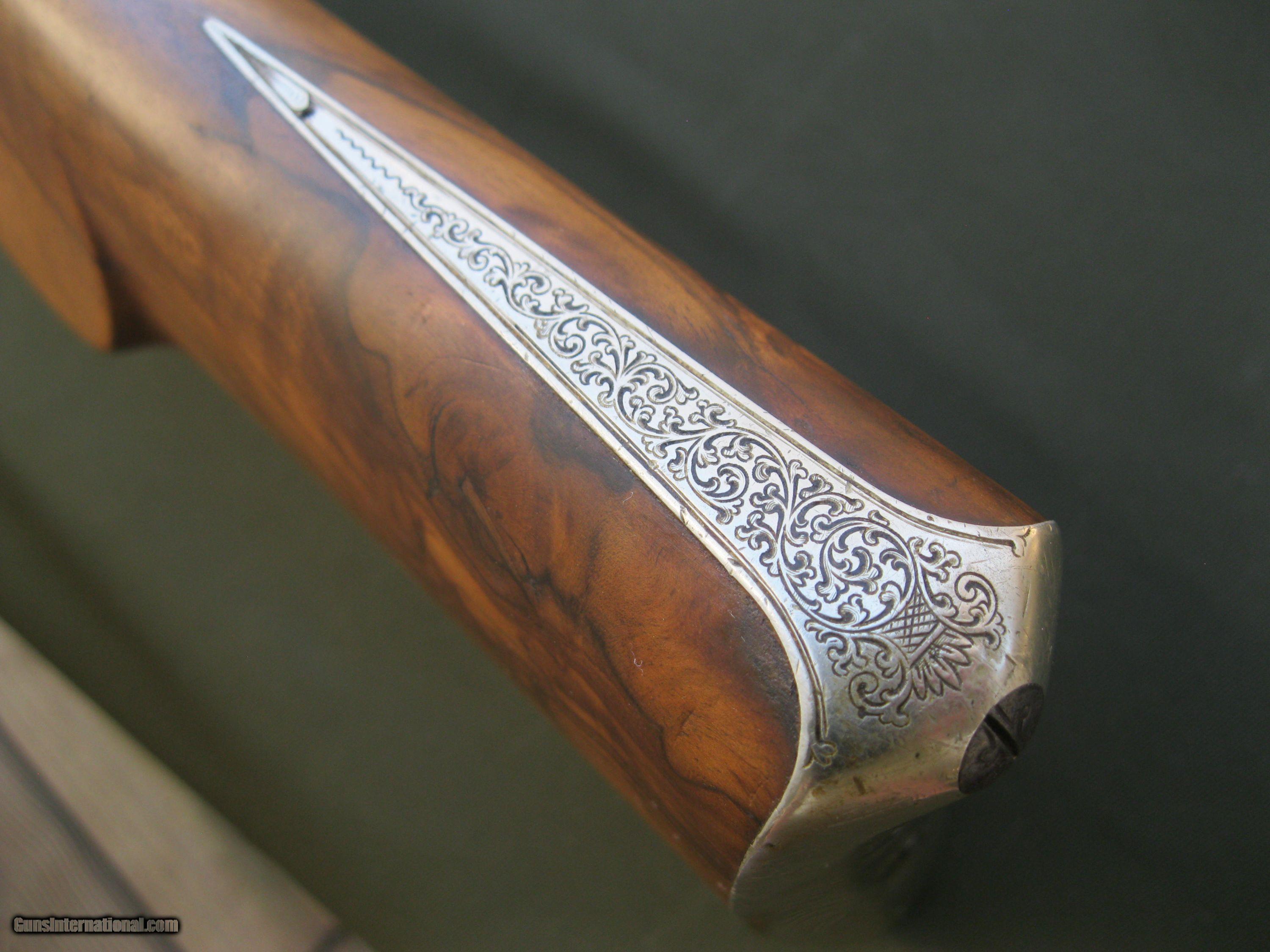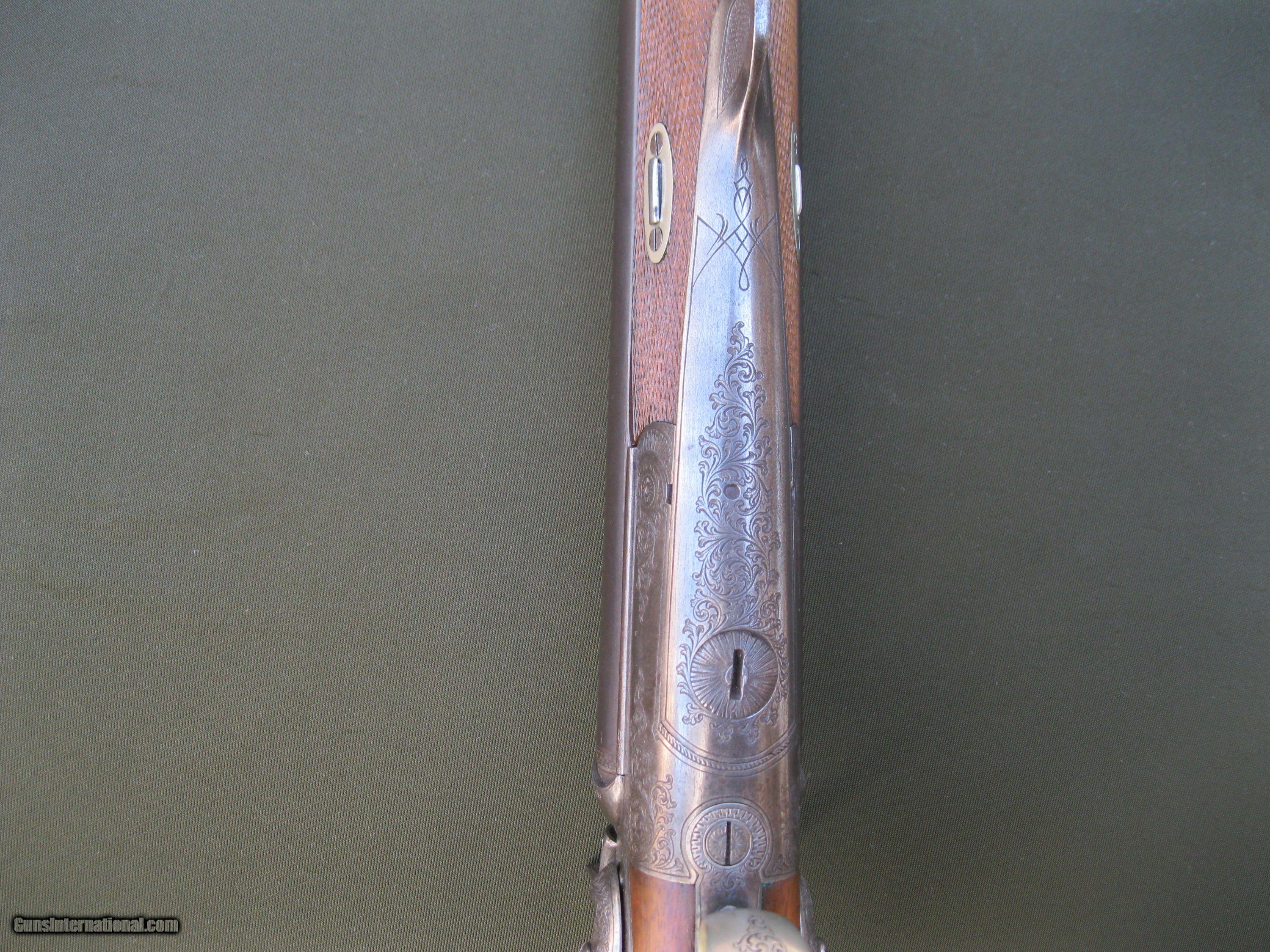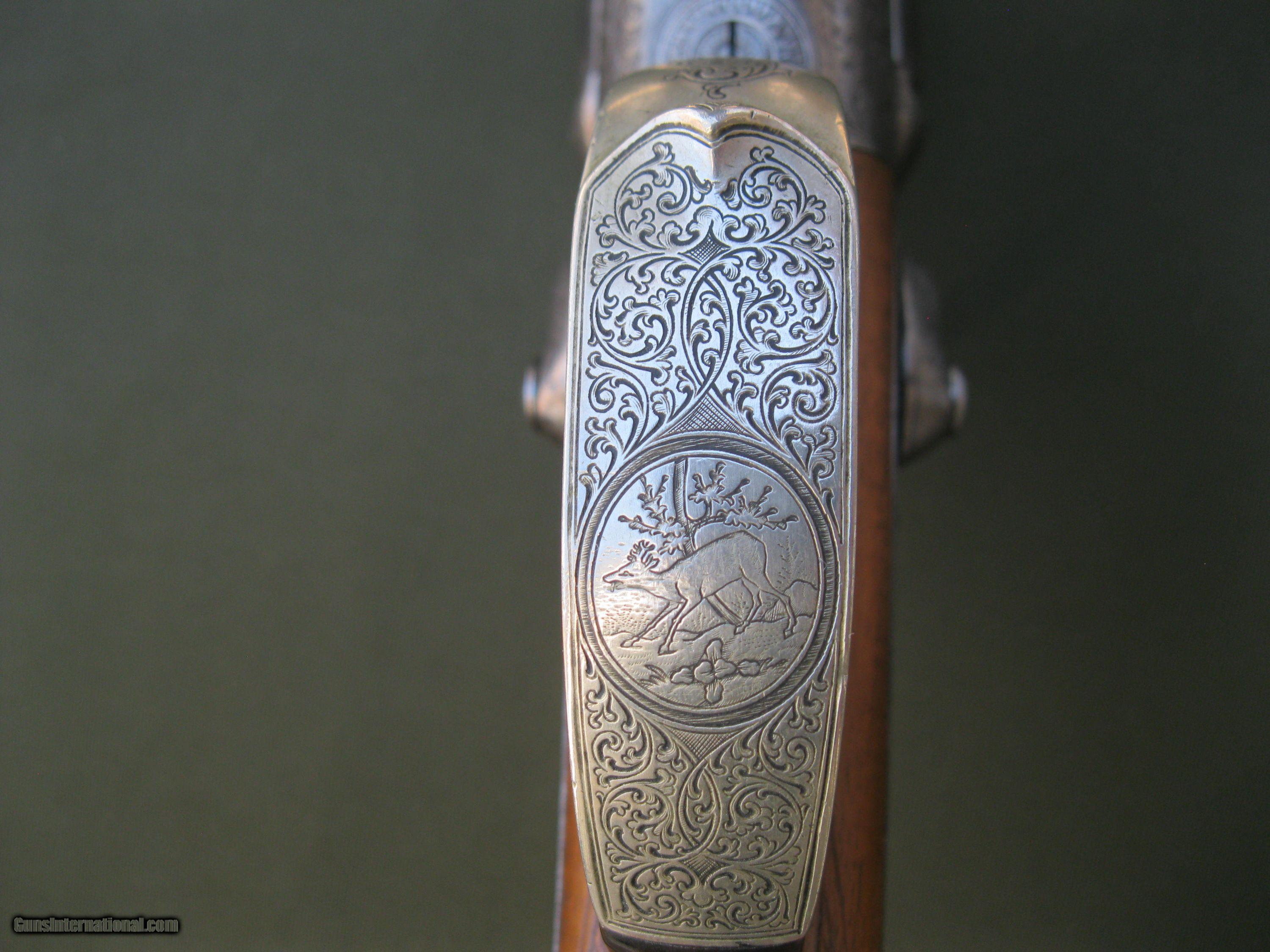Description: This underlever back-action sidelock double rifle by Schmidt & Habermann of Suhl is a nice example of the quality and craftsmanship from a past era of German gunmaking. The 25" barrels are .42 cal and have a nice brown patina. They feature a standing rear sight and one flip up sight. The bores are in good shape with strong rifling still present. The action locks up tight, testament to the skill of the gunmaker. There is some very nice detailed work put into the external hammers. The double triggers include a set feature for a very light trigger pull on the front trigger. The action has very complete engraving coverage for a gun of this age with small panels of game scenes on both sides of the action. The well figured stock has a 14 1/4" LOP to a German silver curved buttplate. The stock also has an engraved, inletted patch box on the right side. The stock is in very solid condition with no cracks. Function is still good though I noticed the right hammer has a little more play to it than the left one does. The firing pins are of the rebounding type and I noted that the right one is sometimes a little sticky. The gun weighs in at 7 lbs 8 oz. This fine old double rifle is from my collection of German guns that I am offering for sale as I reduce the size. Please take a look at my other listings for more unique creations of the German gunmaker's art. SOLD Antique: Yes |