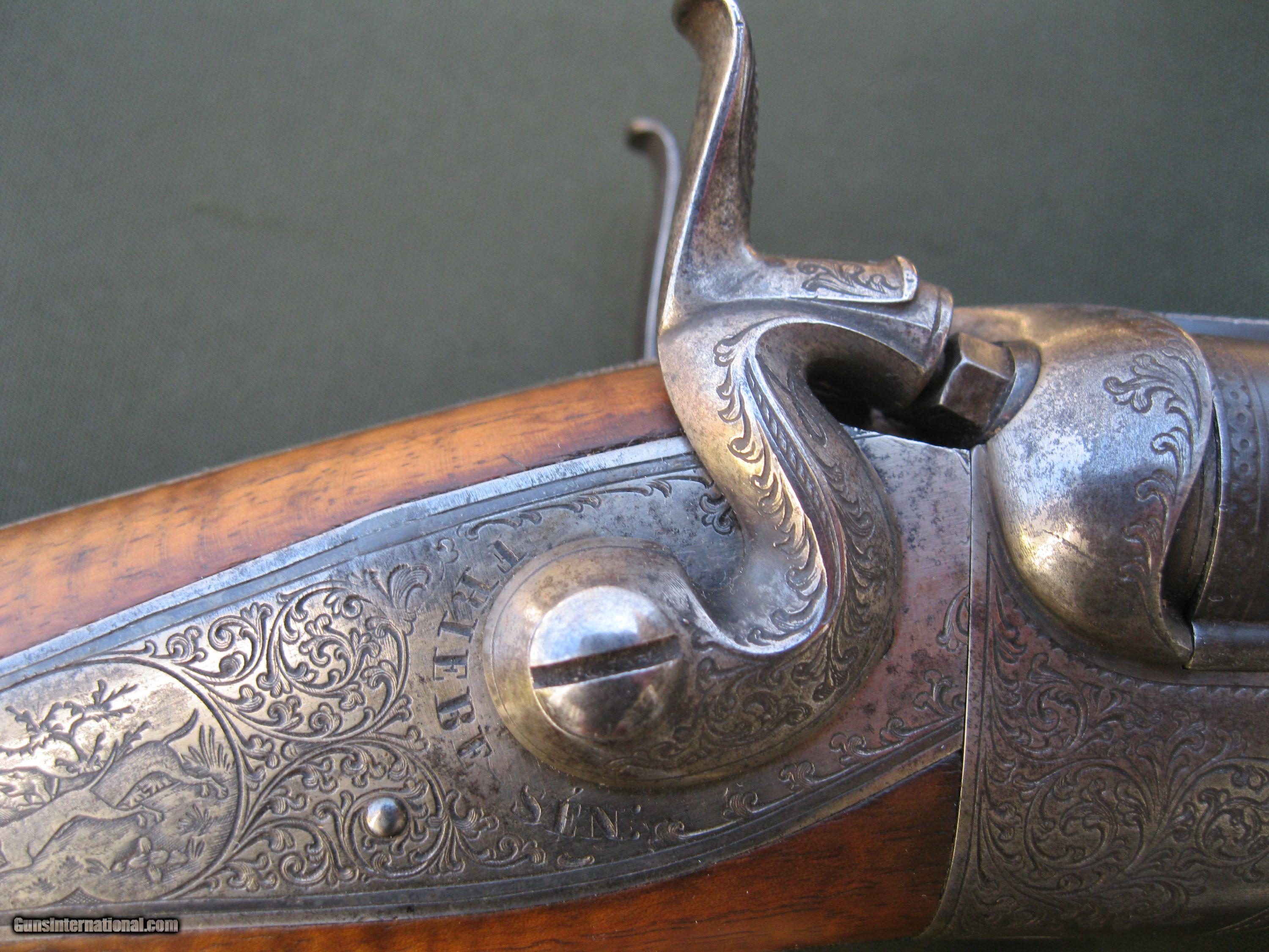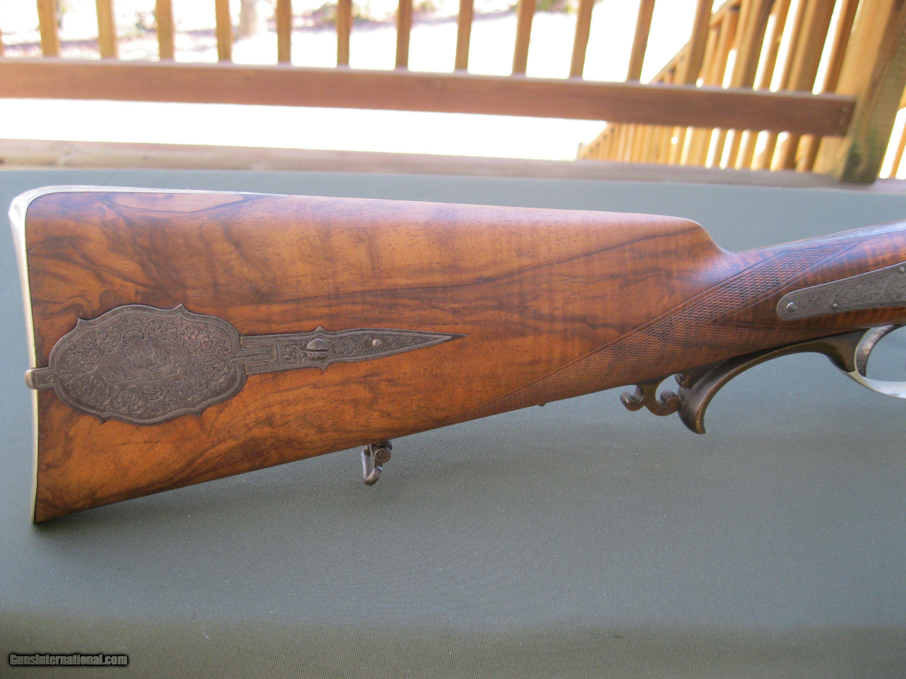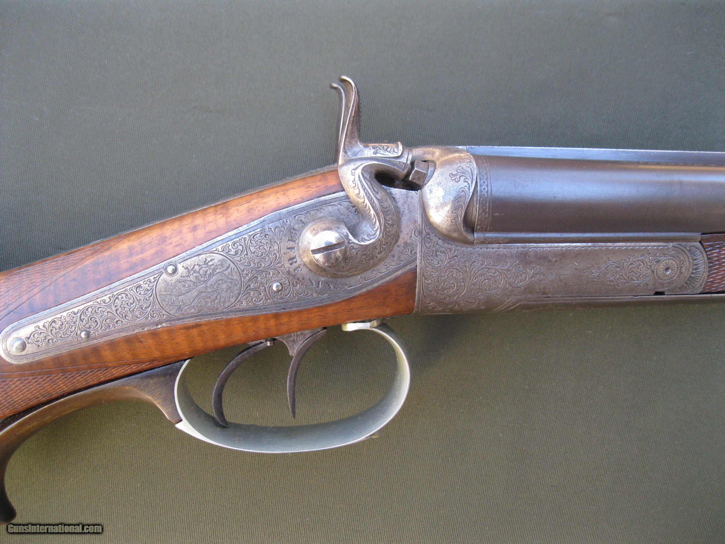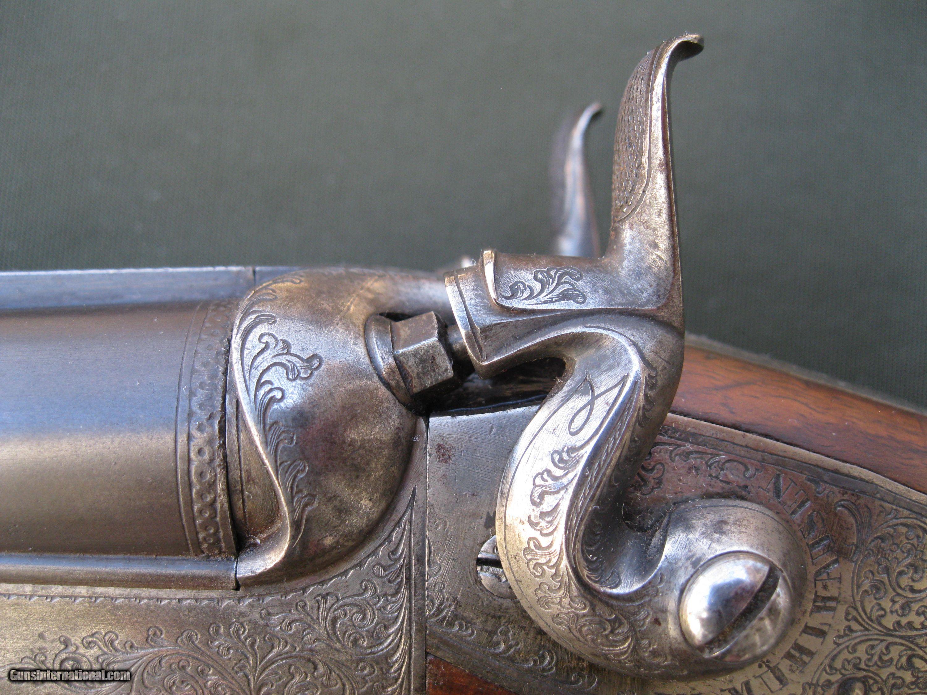 Description: This underlever back-action sidelock double rifle by Schmidt & Habermann of Suhl is a nice example of the quality and craftsmanship from a past era of German gunmaking. The 25" barrels are .42 cal and have a nice brown patina. They feature a standing rear sight and one flip up sight. The bores are in good shape with strong rifling still present. The action locks up tight, testament to the skill of the gunmaker. There is some very nice detailed work put into the external hammers. The double triggers include a set feature for a very light trigger pull on the front trigger. The action has very complete engraving coverage for a gun of this age with small panels of game scenes on both sides of the action. The well figured stock has a 14 1/4" LOP to a German silver curved buttplate. The stock also has an engraved, inletted patch box on the right side. The stock is in very solid condition with no cracks. Function is still good though I noticed the right hammer has a little more play to it than the left one does. The firing pins are of the rebounding type and I noted that the right one is sometimes a little sticky. The gun weighs in at 7 lbs 8 oz. This fine old double rifle is from my collection of German guns that I am offering for sale as I reduce the size. Please take a look at my other listings for more unique creations of the German gunmaker's art. SOLD Antique: Yes |