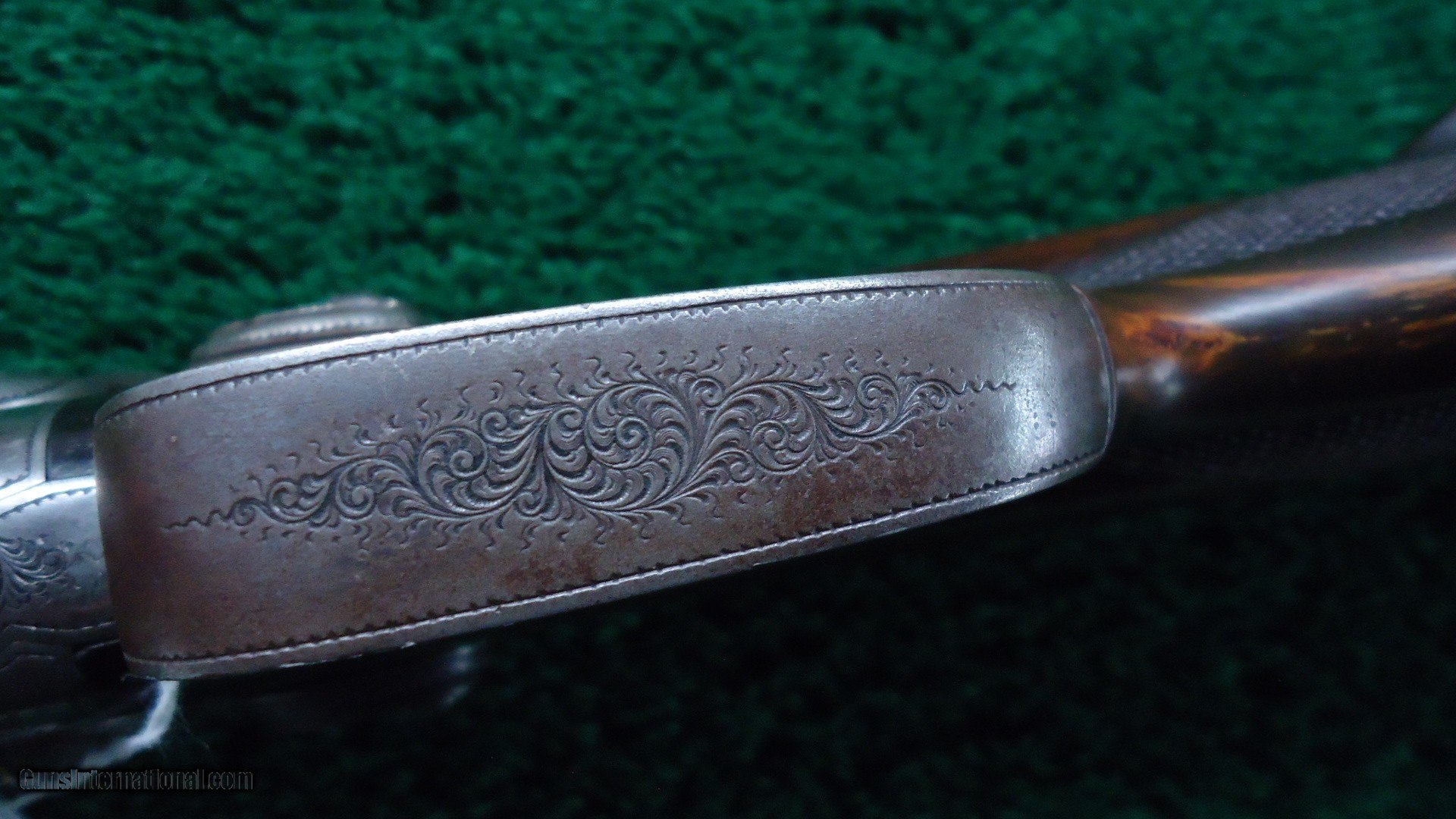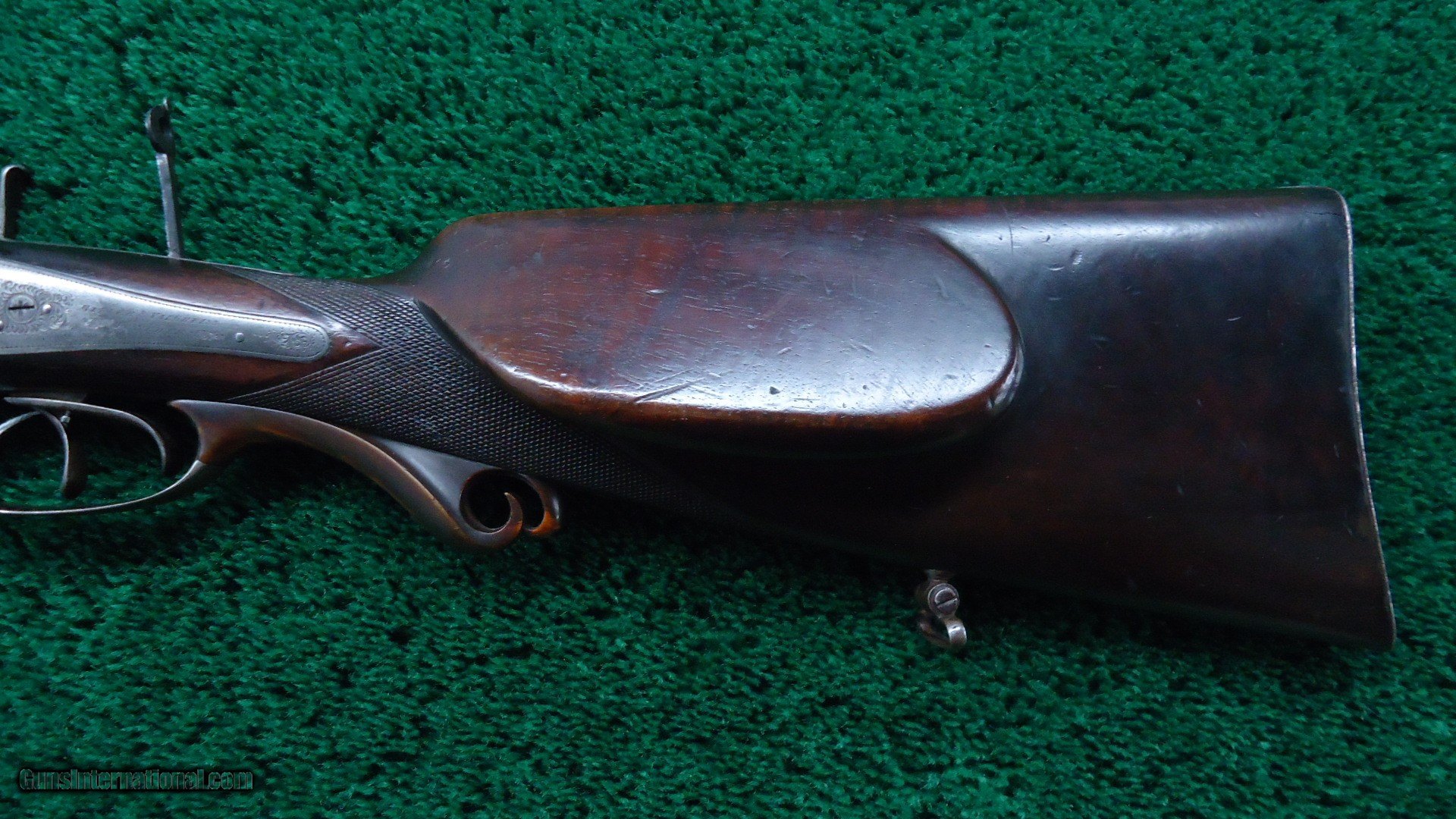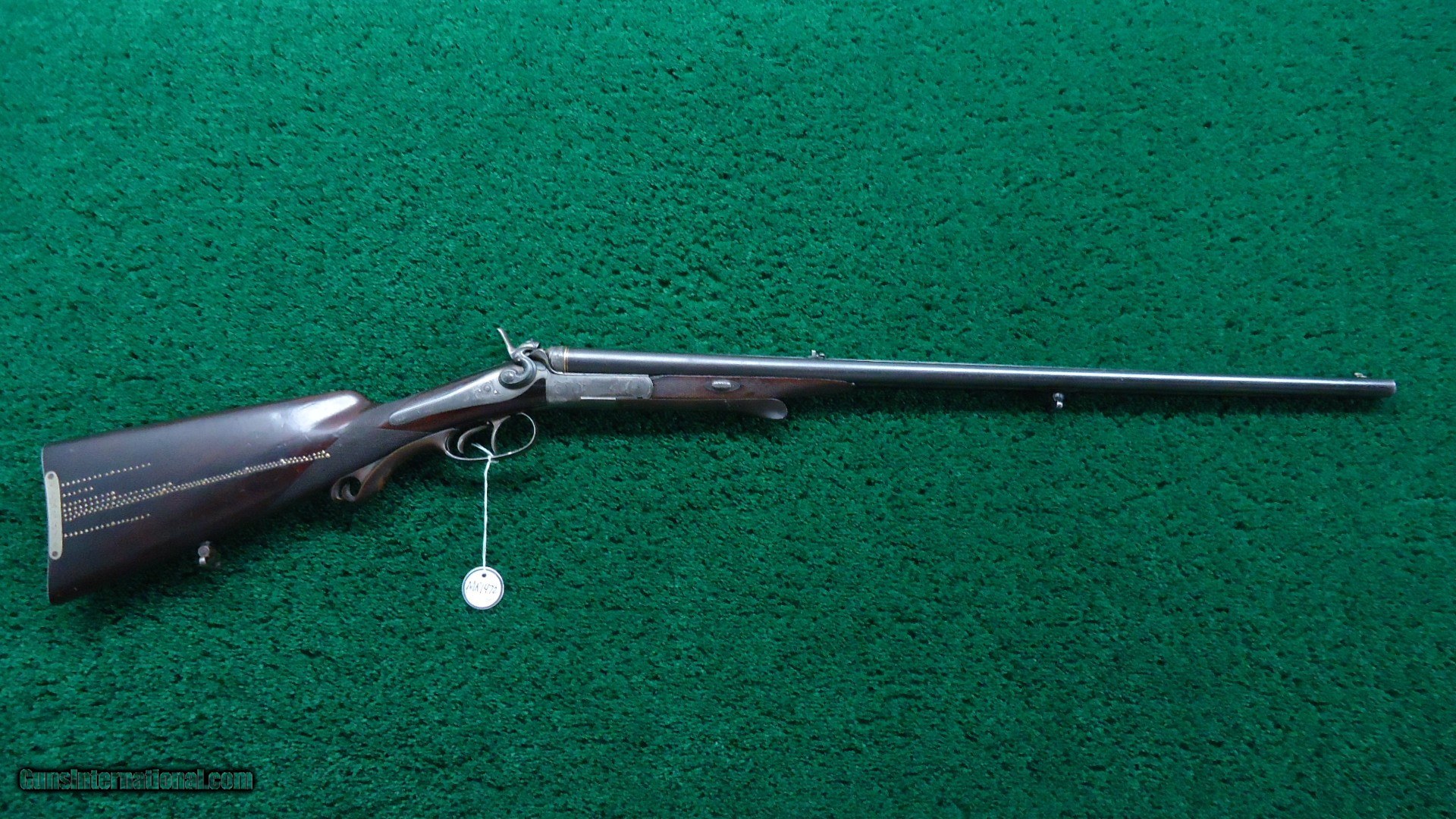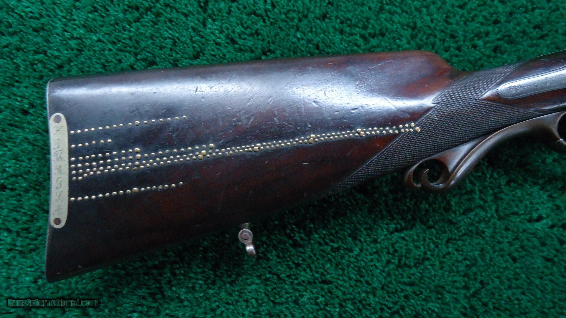 Description: The entire gun is attractive with an elaborately done raised rib, doll head extension, silver plated frame and back action locks and decorative hammers. Correct sling swivels. Caliber 9.3mm. About 25 inch barrels that appear to be relined with very good bores. Double set triggers. Marked on the side is an inlaid German silver plaque that has an "H D G L A and R" which must designate African game animals. There is a stud as achievement counters. Some lines have upwards of 100 studs. This gun was apparently used a lot but it is still in very fine condition. It shows some wear to the wood but is still sound and solid. It has a unique horn pistol grip. Checkered steel buttplate. Receiver end of the barrels have gold bands. Under lever break open. Leroy Merz Antique Firearms specializes in antique and vintage Winchesters and other fine American firearms. Since 1965 Mr. Merz has taken part in the world of firearms and has been a contributor to many well known reference books. We have hundreds of additional guns in every price range at our home online. Search for Merz Antiques in google. SOLD Antique: Yes |