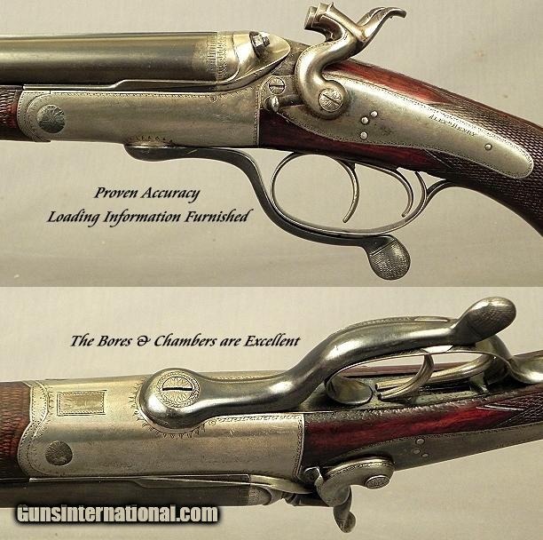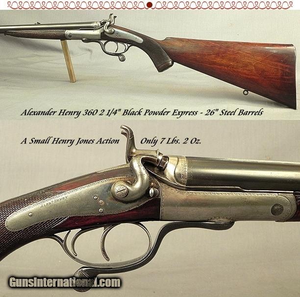 Description: #5929, Alex'r Henry, Edinburgh and London: A Small Jones Action Underlever Back-Action Non-Rebounding Bolted Lock Hammer 360 2 1/4" Black Powder Express Double Rifle Made in 1890, It is with 26" steel barrels with Henry's patent rifling of Patent #2802 of November 15, 1860, London proved; Full length rib with 1 standing & 2 folding express sights, Non-Rebounding locks, Hammer safeties, Percussion style fences, Snap forend release with a friction roller mounted underside the forend iron, Horn grip cap, Sling eyes, No cheekpiece, 15 3/16" LOP over a checkered butt with engraved steel heel & toe plates, Neutral stock which is ideal for the right or left hand without a cheekpiece, A neat small action weight of 7 lbs. 2 oz., Border engraving, I am most certain the barrels have original blue and it remains at 85%, Traces of original case colors, I also feel the stock has the original oil finish at 80%, The checkering is at 75%, The wood is very solid and ready for extended shooting, The bores and chambers are absolute excellent with very light pitting only just ahead of the chambers, The rifling is sharp the entire way from throat to muzzle, The rifle is a proven shooter with very good accuracy and all the loading information will be provided by a very experienced rifleman. This is Alexander Henry romance from a great period at the pinnacle of sporting guns in the last years of the 19th century. This piece embodies classic Alex Henry from a firm that appreciates all things Edinburgh and Scottish. //////////////////////////////////// Alexander Henry was born in 1828 and became the inventor of the gun barrel that revolutionized small arms as it was a new principle in rifling a barrel. In the brief on his patent in 1860 it stated "The rifled bore is of polygonal cross-section, and is provided, in addition, with curved, square, or angular spiral projections or grooves, so as to increase the bearing points of the projectile." His barrels became the very part of the Martini-Henry rifle; in 1874 the War Office realized how good his invention was and issued it to the British army. Mr. Henry died in Edinburgh on January 27, 1894 at the age of 76. /////////////////////////////////////// If you like you're hunting rifle; you can keep your hunting rifle. We will keep this Promise to the American people. SOLD Antique: Yes |