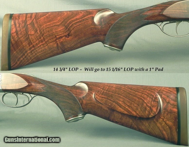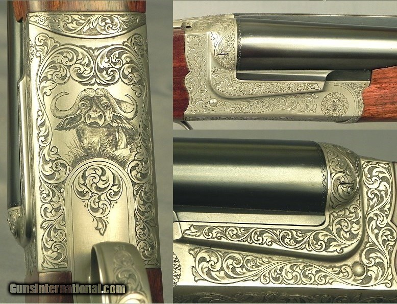 Description: #26749, Chapuis Model African PH II in 470 Nitro Express, Hand cut engraving, 23 5/8" Ejector Barrels with Quarter rib 1 standing & 3 folding sights, Bolstered frame, Bushed strikers, Scalloped action back, Double triggers, Open pistol grip stock, Cheekpiece, Beavertail forend, Trapdoor grip cap with spare strikers, Rolled trigger guard edge with the strap to the grip cap plus 3 tiedown screws in the guard strap, 14 3/4" LOP over a 3/4" Decelerator pad, It will go 15 1/16" with a 1" pad, 10 lbs. 1 oz., Hand cut engraving that is very well done by M. Granger with 90% coverage of floral engraving with a well cut Cape Buffalo on the bottom, The barrel blue remains at 99%, Coin finished frame remains at 98%, The stock finish is at 98%, The checkering at 100%, The bores are as new, We feel so strong about these guns mechanically that we will take care of any problems for as long as you own it, except the wood. We have had every current made boxlock double rifle in our shop, have shot them all, worked on all, had all of them apart and we know for fact that you can't buy a better one for the money than a Chapuis. We regulate, re-joint, do triggers, re-barrel and hunt with and shoot a lot of double rifles. We flat know this is one tough, attractive, high precision, go to Africa and have money left for the second Buffalo type of gun. I challenge you to show me a better current double rifle for the money. SOLD |