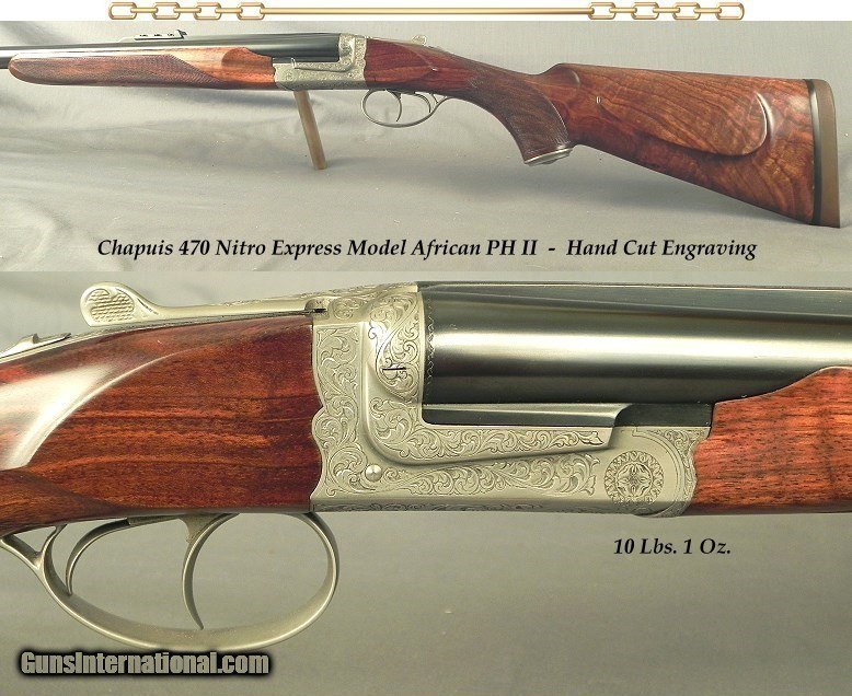 CHAPUIS 470 N. E. MOD AFRICAN PH II- EXC. HAND CUT ENGRAVING w/ 90% COVERAGE- VERY NICE WOOD- OVERALL 98%- 14 3/4" LOP- 10 Lbs. 1 Oz.- 23 5/8" Bbls.