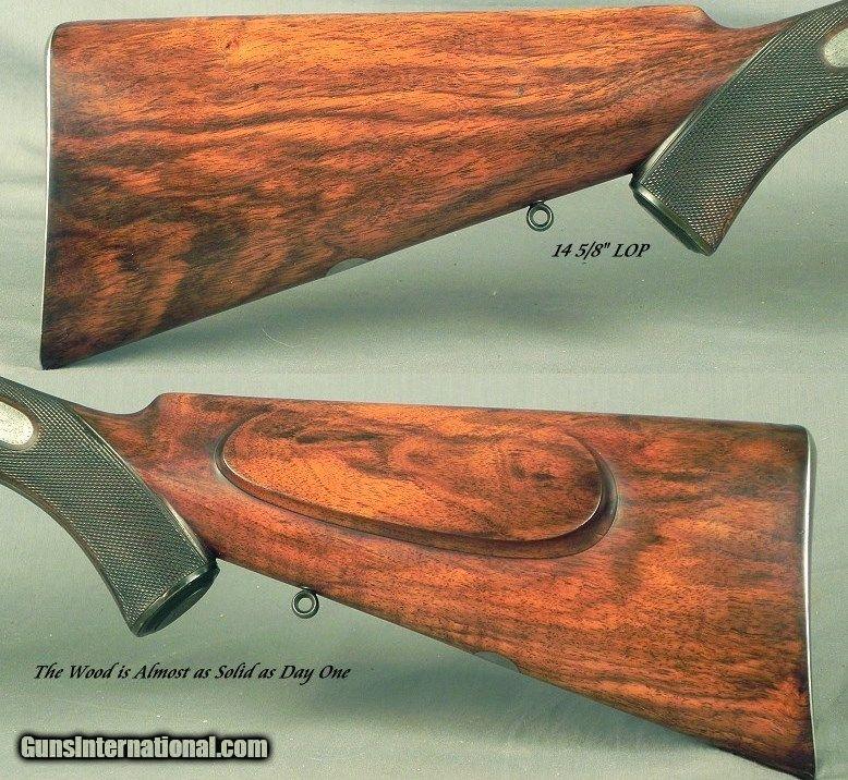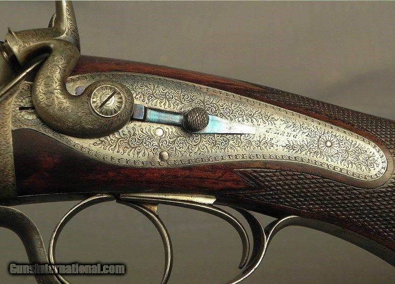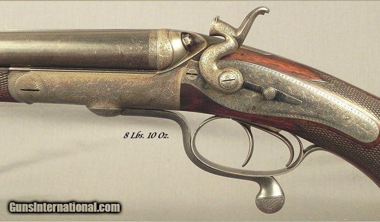 Description: #10346, James Lang, 18 Brook Street, New Bond Street, London: A James Lang (Son of Joseph Lang) 450 3 1/4" BPE, A very nice 19th Century Jones Action Underlever Back-Action Non-Rebounding Hammer 450 3 1/4" Black Powder Express Double Rifle with excellent bores, Made in 1891, 28" damascus barrels, Alexander Henry's Patent A&T barrels numbered 3668 & 3669 that most likely were done in house as they are stamped J. L., Full length rib with 1 standing & 2 folding express platinum lined rear sights, Proofed in London, Carved percussion fences, Rear hammer sliding stalking safeties, Swing lever forend release, A neat horn grip cap, Sling eyes, Nickel Silver escutcheon without initials, 14 5/8" LOP over a steel buttplate, 8 lbs. 10 oz., Very Nice wood, Shadowline cheekpiece, 95% coverage of very well cut period scroll engraving that remains sharp and crisp and includes the hammers, top strap, lever, trigger guard and forend, 30% original case colors remain, The damascus barrels have been blacked but a very long time ago, The original wood finish is an honest 85%, The checkering is at 95%, The stock & forend are as solid as the day it was delivered, The metal remains in excellent to excellent plus condition, The bores and chambers are absolutely excellent to near excellent plus & on a scale of 1 to 10 they remain a 9, The rifle is accurate and will produce 2 1/4" groups at 100yards. It has 2 each front sights, 1 the original and a very nice and well-done replacement in the original dovetail cut. This is flat-out one solid 127-year-old gun that has a lot of mileage left in it. SOLD Antique: Yes |