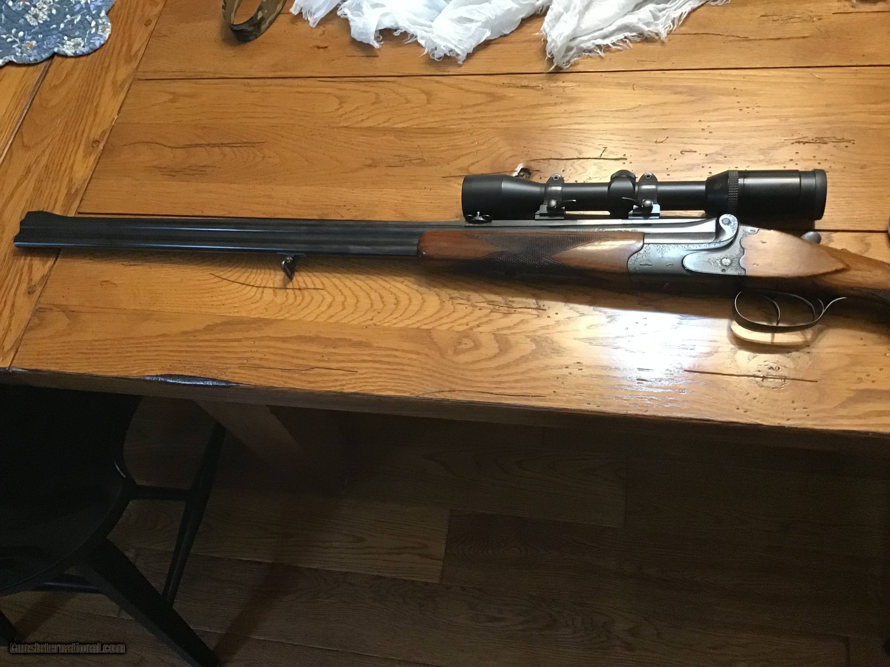 Description: Manton & Co O/U double rifle in caliber 350 #2 Express . Exceptional shape with excellent condition bores and very good wood , metal . Showing very few handling marks. Serial number 233xx . Nitro proof for 43 grains of Cordite and 310 grain bullet MAX . Cases are made from 9.3 x 74r cases cut to 2&3/4”. Swarovski 3 x 9 Habitch in quick release mounts . Shoots .358 dia bullets . 310 grain bullet at 2000 FPS and 2700 fpe! feel free to ask questions. $3500.00 SOLD Curio/Relic: Yes |