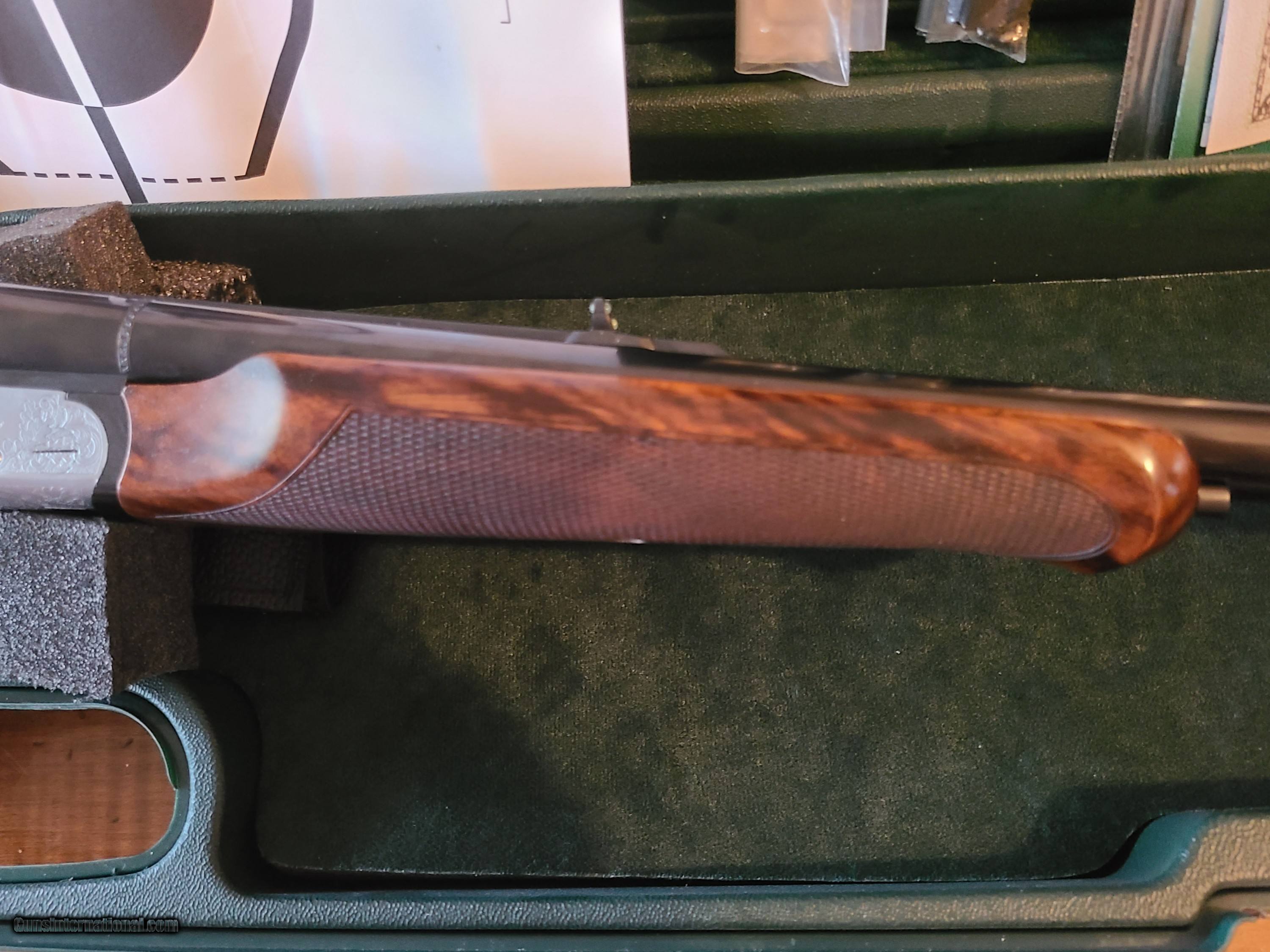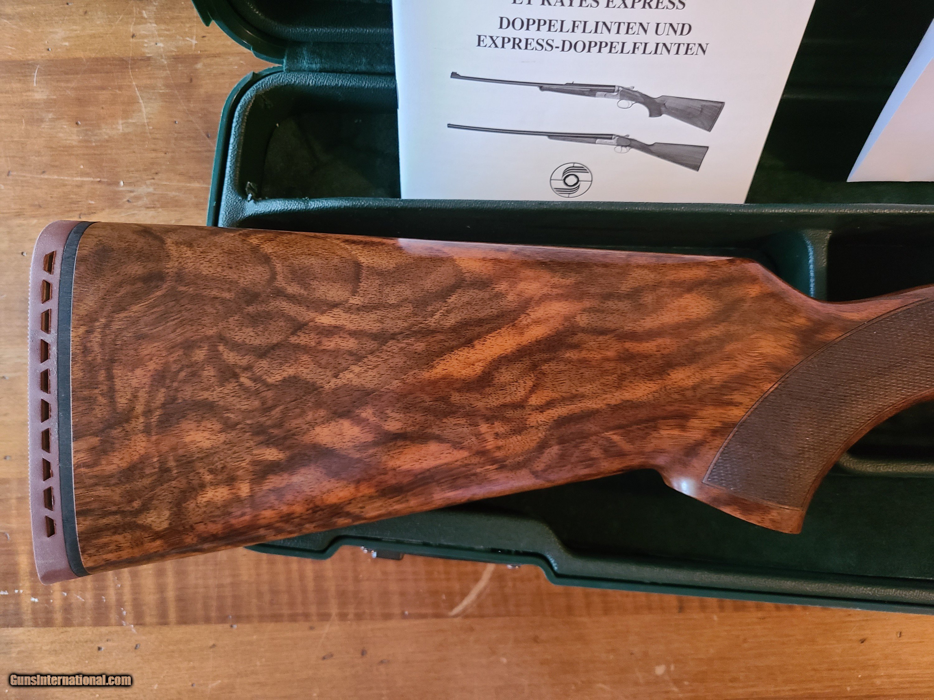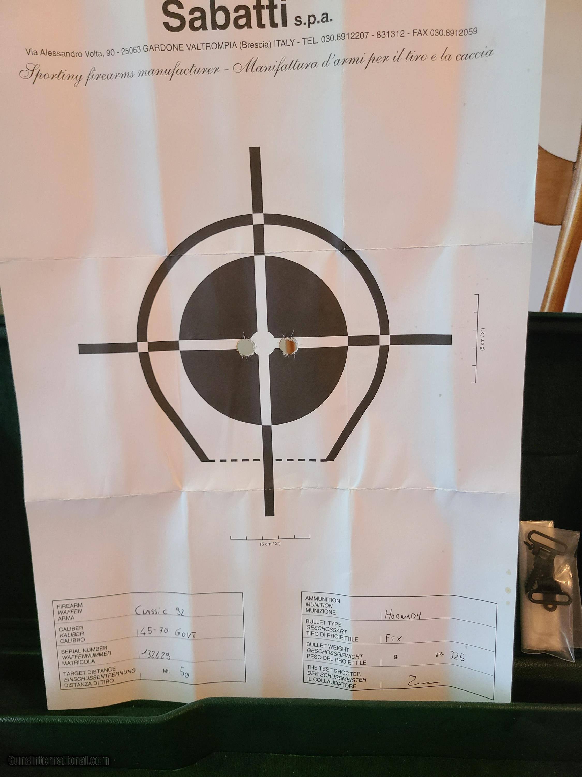 Description: Very nice 98% condition Sabatti Classic 92 in 45-70. 24" barrels with fiber optic front and rear sights. Though this rifle isn't a "deluxe", Sabatti did not hold anything back on their wood selection for this one. This is one very beautifully figured walnut stock. Which is not present on new standard production guns. This model has double triggers and very strong ejectors. Beavertail forearm and weighs roughly 7.5lbs. The negrini case contains all factory documents including the barrel regulation, the front and rear sling swivels, and the scope base. All items in their plastic never opened. There is a impression on the stock that I have photographed to ensure you know what you are receiving. This is the only flaw that I have found. I'd like to point anyone Interested in this rifle specifically to the rifles regulation target. This target was set at 50 meters and tested to ensure the barrels are relatively in line. For those that may not know much about double rifles, this is where a bulk of the cost goes. As each set of barrels has to be shot, heated, and rejoined or moved so they can consistently shoot together. This target shows these barrels are outstandingly regulated. I can not stress this enough. Insured shipping cost is roughly $125 though this will vary depending on your location. A true shipping price will be provided. As always thanks for your business. SOLD Rifle Caliber: .45-70 Government Manufacturer: Sabatti Model: Classic 92 Barrel Length: 24 Bore: Excellent Ejectors: Yes Condition: Excellent Metal Condition: Excellent Wood Condition: Very Good Bore Condition: Excellent Action: Break action Triggers: Double Stock: Deluxe Walnut Finish: Hand oiled Weight: 7.5lbs Sights: Fiber Optic Engraving: Wild boar on the left and right and a Stag or elk on the bottom. Extras: Scope base, sling swivels Case: Negrini Item Location: NC |