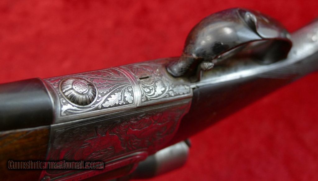 Description: Idiosyncratic typical Collath action fortunately in a non-proprietary caliber, all original and functional including the Gerard 4x scope in claw mounts! 25 1/2" Steel barrels, rifle barrels with good rifling for 43 Mauser groove .452; bright shotgun barrel is 16ga-2 5/8", 666/642 Mod. Sound original wood, LOP 13 3/4" through original horn plate, drops 1 3/4" and 2 1/2" with slight cast off, horn grip cap. See thru scope mount, (replacement) folding rear sight. Front trigger adjustable. Beautiful game scenes, horn trigger guard with repair.8 1/2 lbs. SOLD |