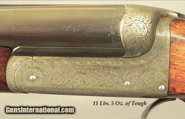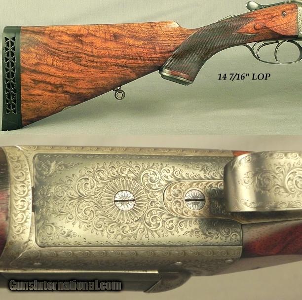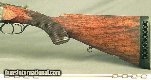 Description: #55517, Wilkinson, Pall Mall, London: A Pre-1925 470 Nitro Express by Wilkinson built on a large and stout action body with Sideclips, 26" Krupp Steel Extractor Chopper Lump barrels with a Dolls head extension plus a Third Bite, Sideclips, 26" Extractor Chopper Lump barrels with a Dolls head extension plus a Third Bite, 1/4 rib with 1 standing & 3 folding, Birmingham proved at 75 cordite with a 500 grain bullet, Bushed strikers, Double triggers, Extended trigger guard tang to the steel grip cap, No cheekpiece, Sling eyes, 14 7/16" LOP over a 1" pad, A beefed up rifle with the proper 470 weight of 11 lbs. 5 oz., Swing lever forend release, 95% coverage of broad scroll engraving, Very nice wood that remains very solid and stout with a lifetime of use left in both the butt and forend, The barrels have been reblacked and now are at 96%, 25% original case colors, The wood finish at 92%, The checkering at 96%, 100% case colors remain inside the forend, The great news is the bores as they remain virtually as new, It is smack on the face of the breech. This is a very solid double rifle that has nearly all of its mechanical life left in it and built with a large frame for comfortable 470 shooting at 11 lbs. 5 oz. This is flat out one nice British boxlock that is in excellent condition for extended hunting and shooting. /////////////////////////////////// This piece is most likely a James Wilkinson of the Wilkinson Sword Co. Ltd. From 1906 to 1920 Wilkinson put no serial numbers on their guns until after 1920. This gun is numbered 55517 and most likely built about 1922. They quit selling guns in 1939. Guns of all kinds from all periods were made that have an association with Wilkinson; flintlock's, percussion muzzleloaders and modern pieces such as this double rifle. SOLD Curio/Relic: Yes |