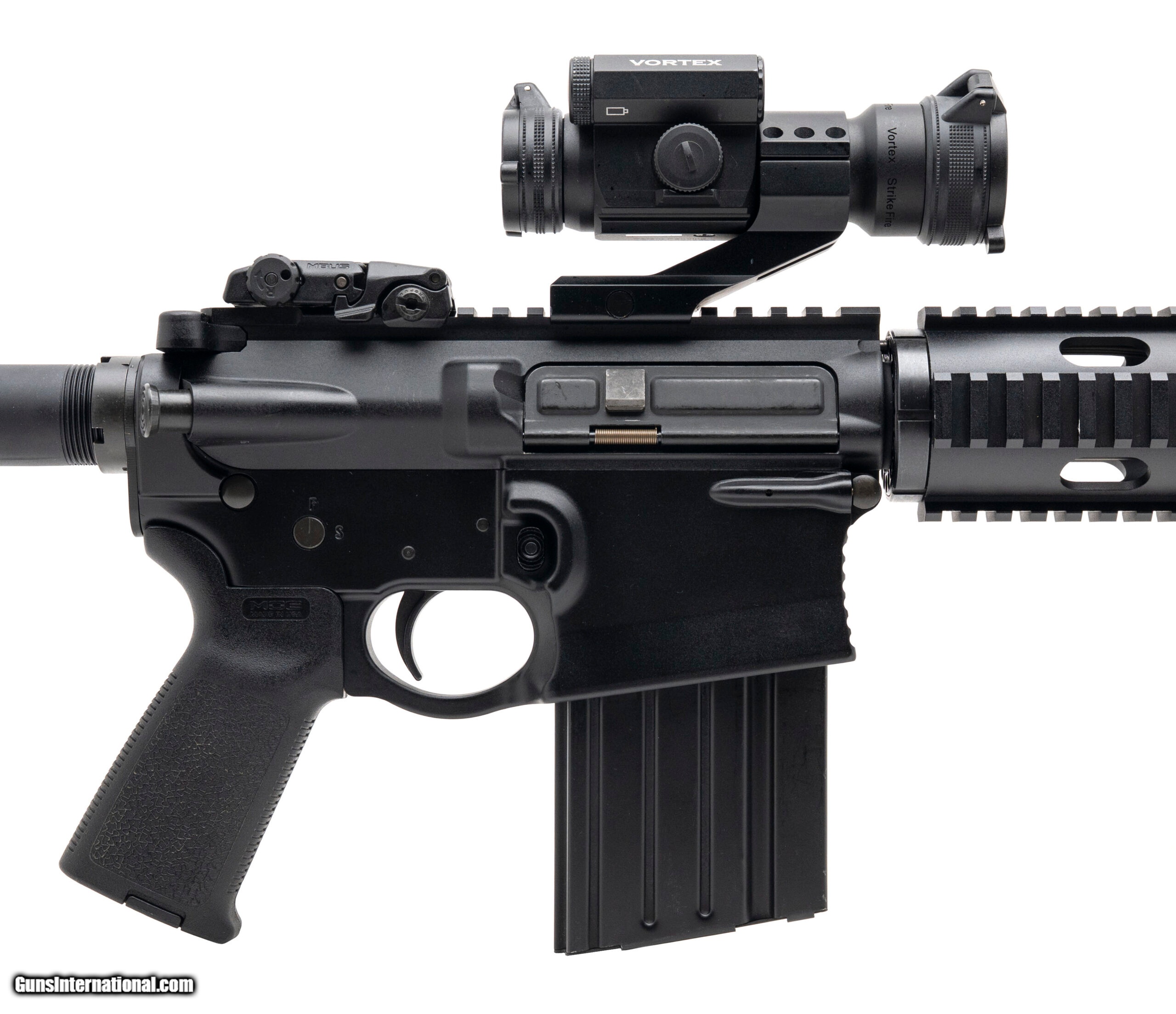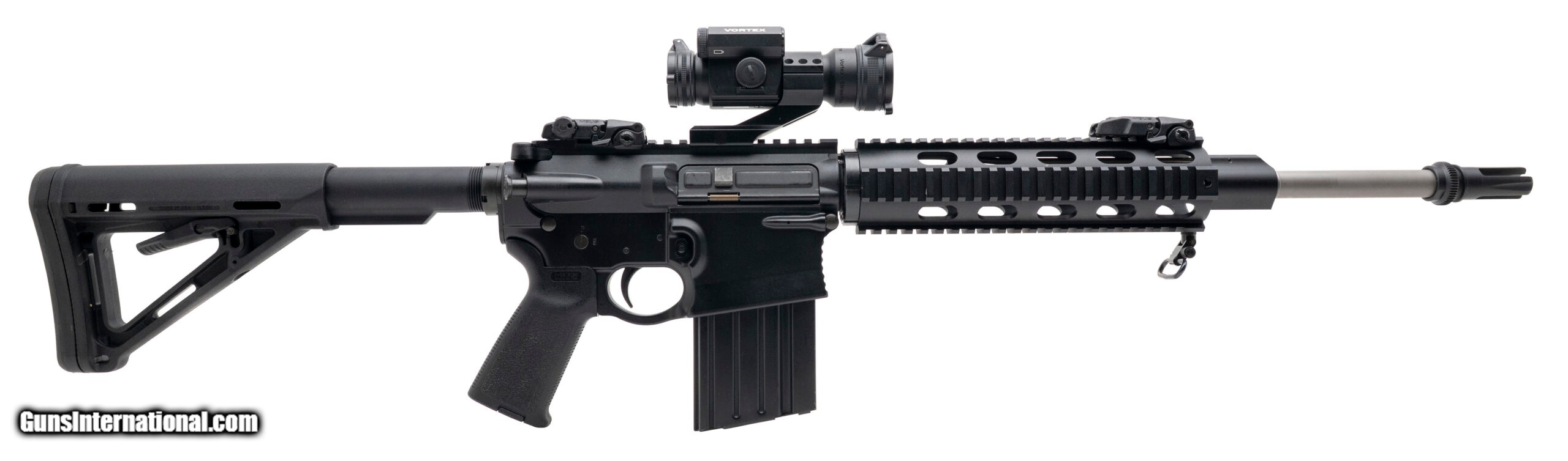 Description: "SN: EH015574. Modern production, 7.62 Nato with a 16"" barrel w/three prong flash hider. Semi-auto tactical rifle with a Vortex Striker Force red dot optic and Magpul pop-up sights. Overall condition is near excellent. Comes with box and an extra magazine. SOLD |
