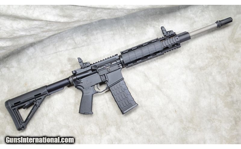 Description: Basic AR-15 rifle with mounts for lots of accessories. Features include stainless barrel, telescoping stock, and folding open sights. 5.56x45MM NATO SOLD Chambers: "Magazine dependent, 30-round magazine provided Metal Condition: Excellent. Wood Condition: Excellent Bore Condition: Shiny and sharp rifling. Barrels: "Satin stainless steel, 1:9-inch twist, 17-1/2 inches including the flash hider. Triggers: Factory trigger. Stock Dimensions: Telescoping stock from 10-1/2 to 14-1/4 inches. Fore End: Heat shield with 4-way rail. Butt Pad: Black pad. Weight: 7 lb - 14 oz Sights: "Folding military style post and peep, mounted on Picatinney type top rail. Item Location: Rogers |