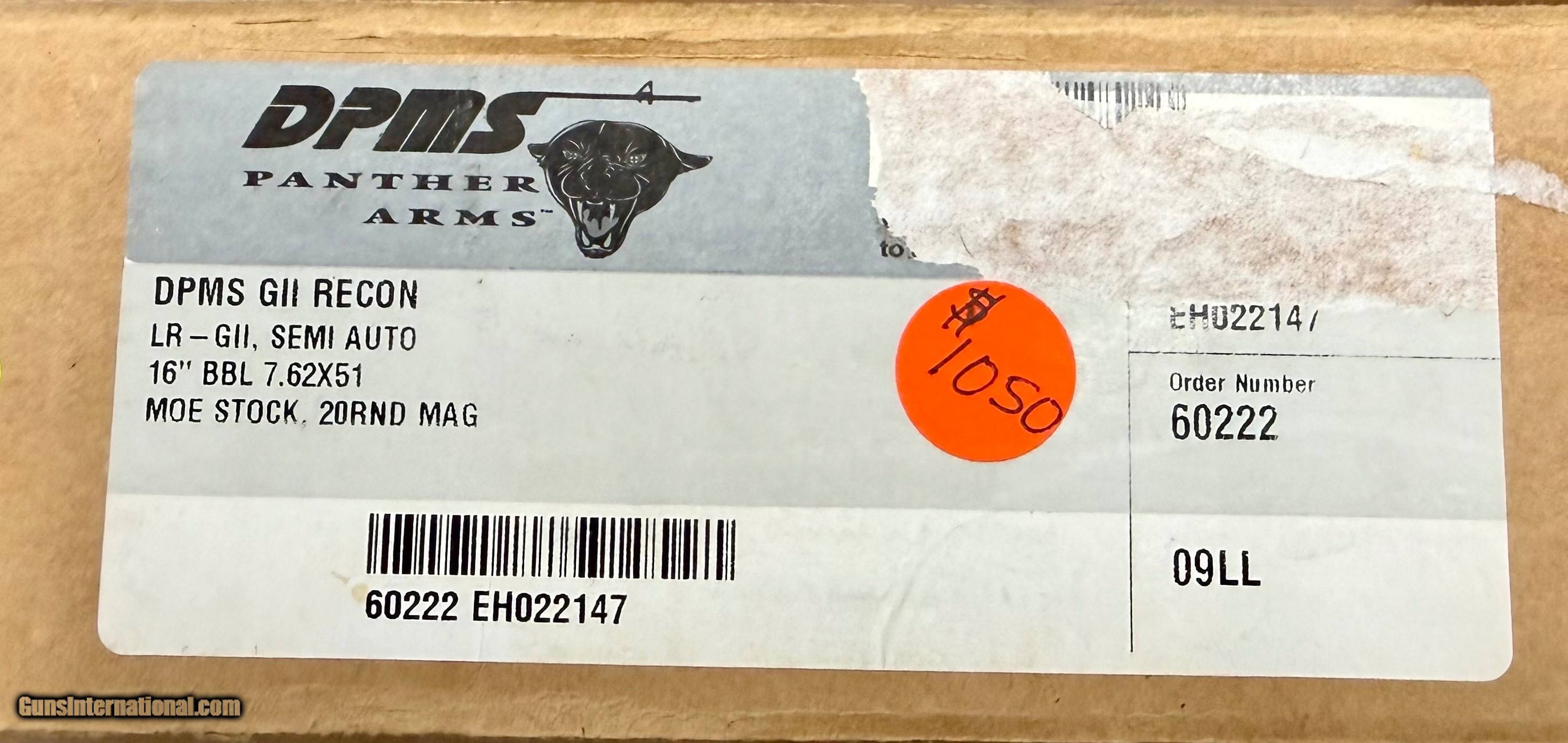 Description: This rifle has never been fired. It was purchaed with intent of using and never made it to the range. This is the G2 model which is a shorter lighter receiver than the orginal DPMS 308 rifles. It comes with upgraded dual ejecters in the bolt. This is the Recon model which came eqipped with a 416 stainless beadblasted 16" barrel and AAC flash hider. Rifle Caliber: .308 Winchester Manufacturer: DPMS Model: LR GII Recon Serial Number: EH022147 Barrel Length: 16 Condition: LNIB Metal Condition: LNIB Bore Condition: New Unfired Stock Dimensions: Adjustable MOE stock Sights: Magpul Price: $799.00 Shipping: $35.00 Pay with