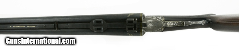 Description: Champhau DRI .16 Gauge shotgun. H. Champhausen drilling .16 gauge that shoots 2 9/16” shells NOT 2 ¾”. Rifle caliber is 6.5X58R Sauer. Barrels are 26 3/4”. Gun is extensively game scene engraved. Door to bullet trap in buttstock depicts a hunter with rifle in a woodland setting. Frame shows wild-fowl on right side and a stag with 2 doe on left side. All scenes are accentuated with a floral and leaf motif. Rifle barrel is activated by push lever on top tang. Rear side pops up upon activation. Gun has adjustable set trigger. Trigger plate is engraved with both German and Austrian patents. Grip lower tang is made of horn. Shotgun bores are excellent and chokes are modified and cylinder. Rifle bore is very good with strong rifling. Barrels have approximately 95% of an old rust blue and look very good. Breech end has some gold bands and filigree gold inlays. Fore end used to be checkered and has been made smooth. Pistol grip has very good checkering. Gun has cocking indicators. Over all the gun is very good plus condition. This gun has many features.