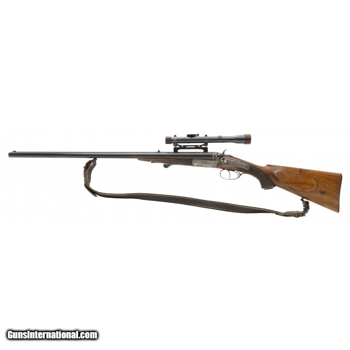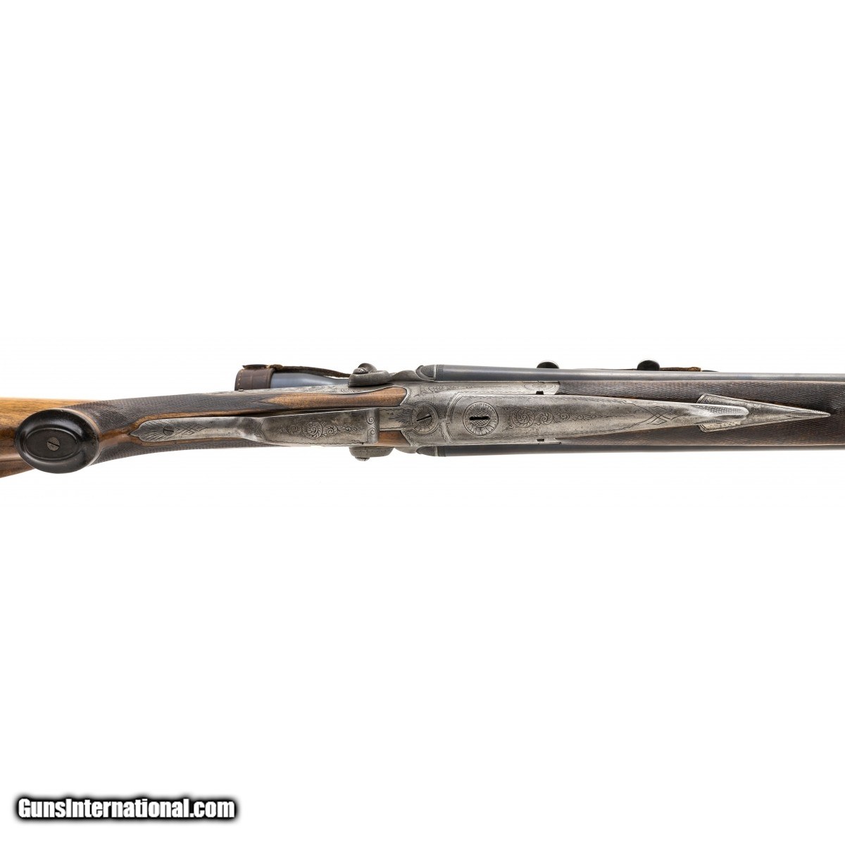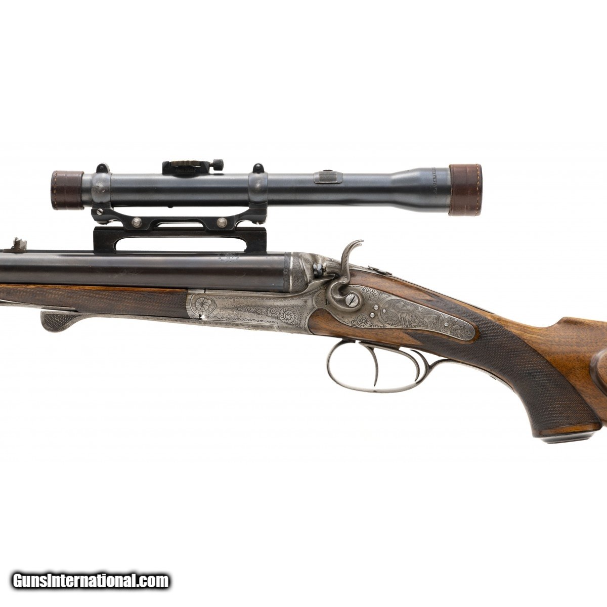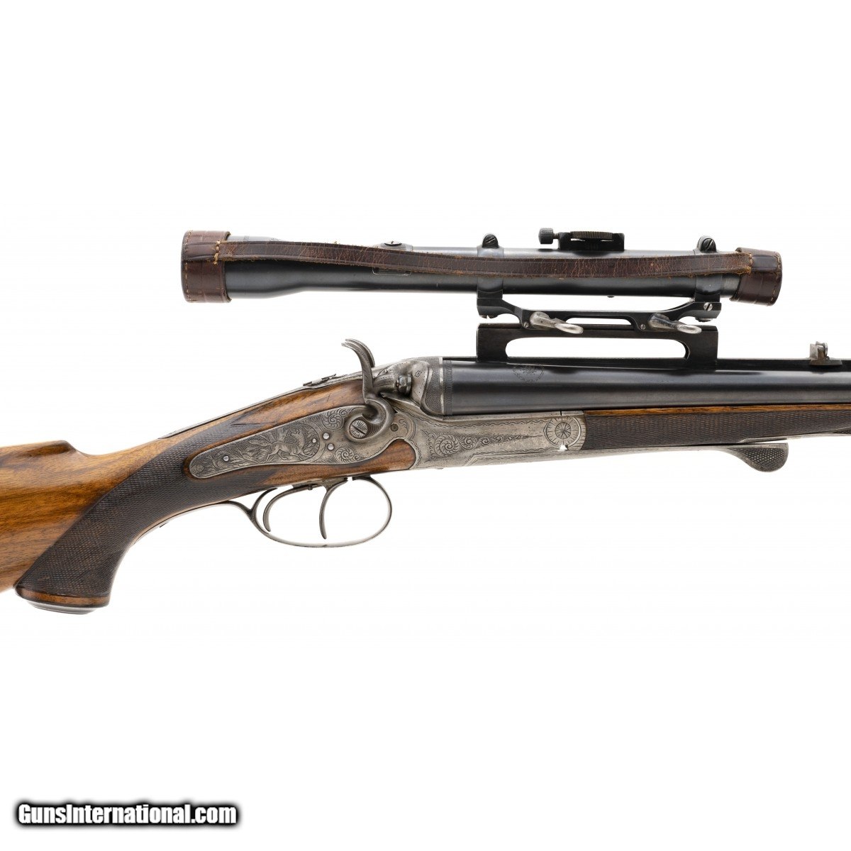 Description: " SN: 779. Unmarked German guild made side-by-side combination gun. Has a backlock action with underlever. The locks are game scene engraved. Bores are excellent. The wood is very good. Has a German ""Jack"" scope mounted on quick release base. A classic German sporting gun. SOLD |