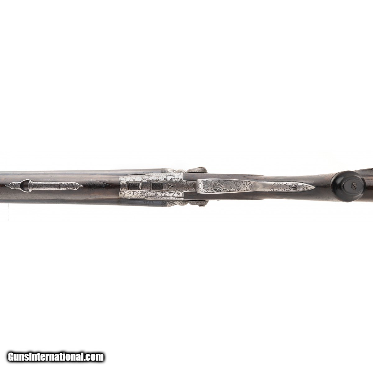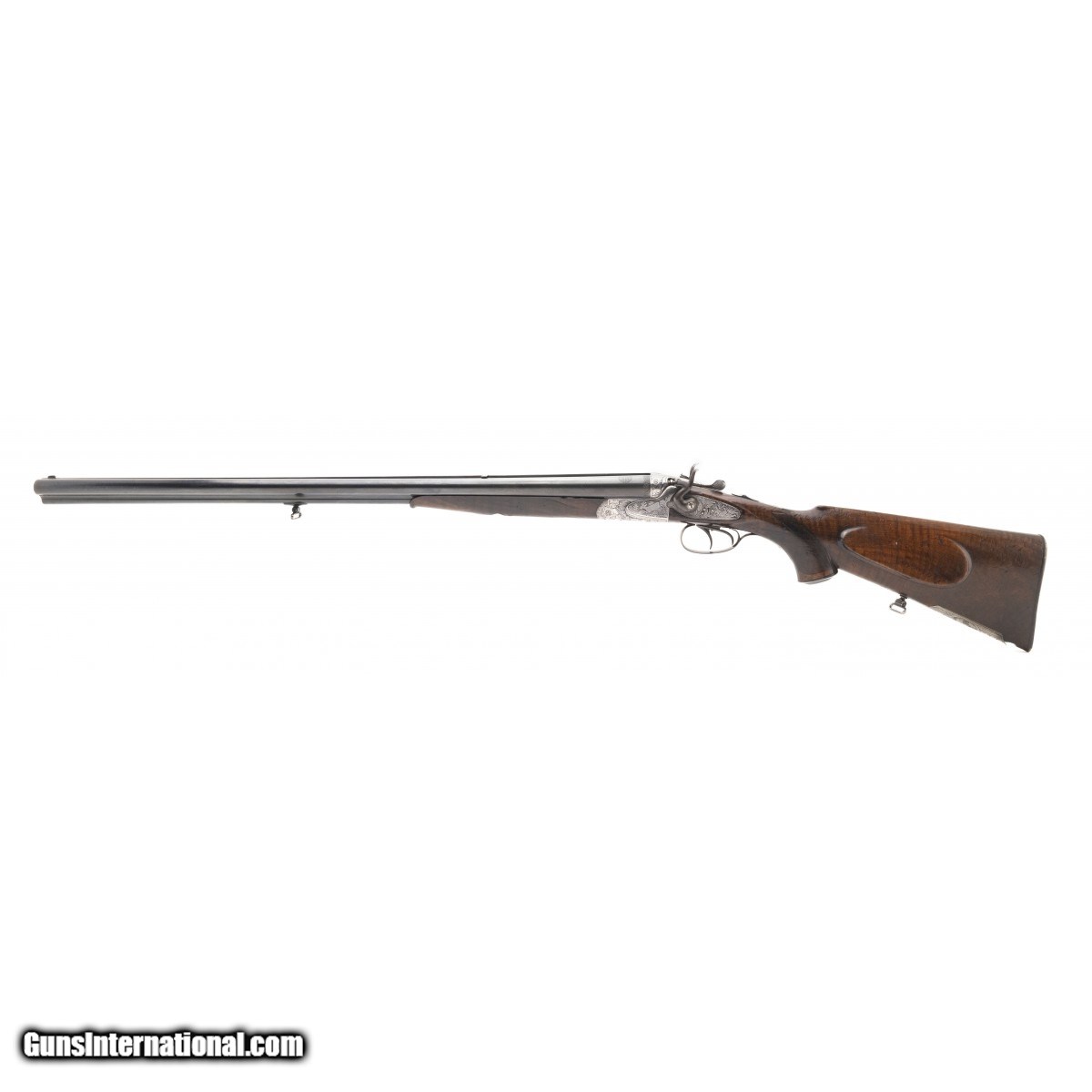 Description: " Manufactured by W. Spillner in Coesfeld (in Munsterland) approximately during the early 20th century. Barrels are 28"". Shotgun barreks are choked full and modified. Rifle bore has strong rifling with frosting. Rear barrel sight raises when activated by pushing the thumb safety forward. Receiver and locks are engraved with floral motifs. The left lock is engraved with partridges. Right lock is is of pheasants. Right side of receiver has a dog on point. Left side of receiver is a running stag in a woodland setting. The trigger guard bow is a cameo of a stag. The cartridge door on the underside of the stock is of a pheasant in flight with a tree in the background. Butt plate is horn and has no chips or cracks. An attractive drilling. SOLD |