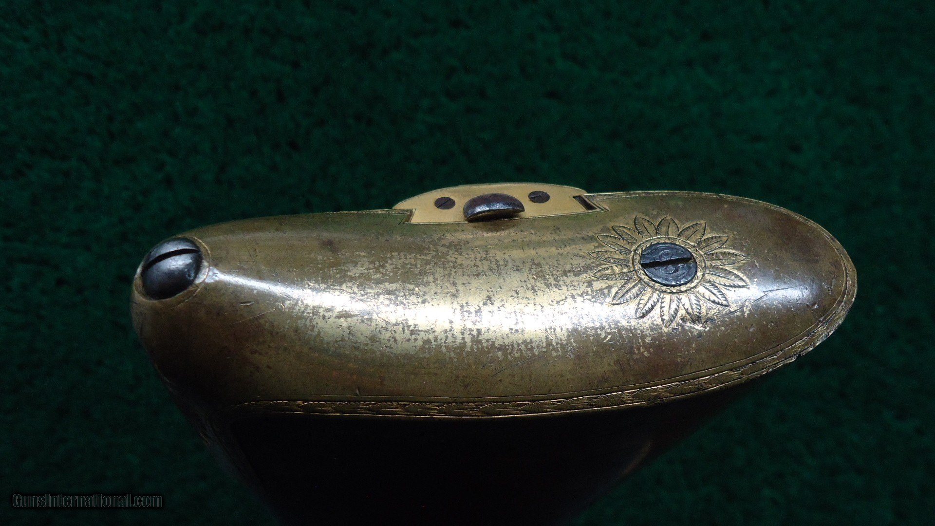 Description: An interesting gun. Wood has most original varnish with some dings and mars. Features a cheek piece that is elaborately carved all around it. Nicely checkered wrist. There is a wolf’s head with Mother of Pearl eyes where the ram rod goes into the forearm. The buttplate and trigger guard are gold gilded brass. Side plates have turned a gray color. Part octagon barrels. Very good bores that are about 16 gauge. Action has a pivoting safety that slides over the nipples. Right lock has had some work done. This good looking gun would make quite the conversation piece. Leroy Merz Antique Firearms specializes in antique and vintage Winchesters and other fine American firearms. Since 1965 Mr. Merz has taken part in the world of firearms and has been a contributor to many well known reference books. We have hundreds of additional guns in every price range at our home online. Search for Merz Antiques in google. SOLD Antique: Yes |
