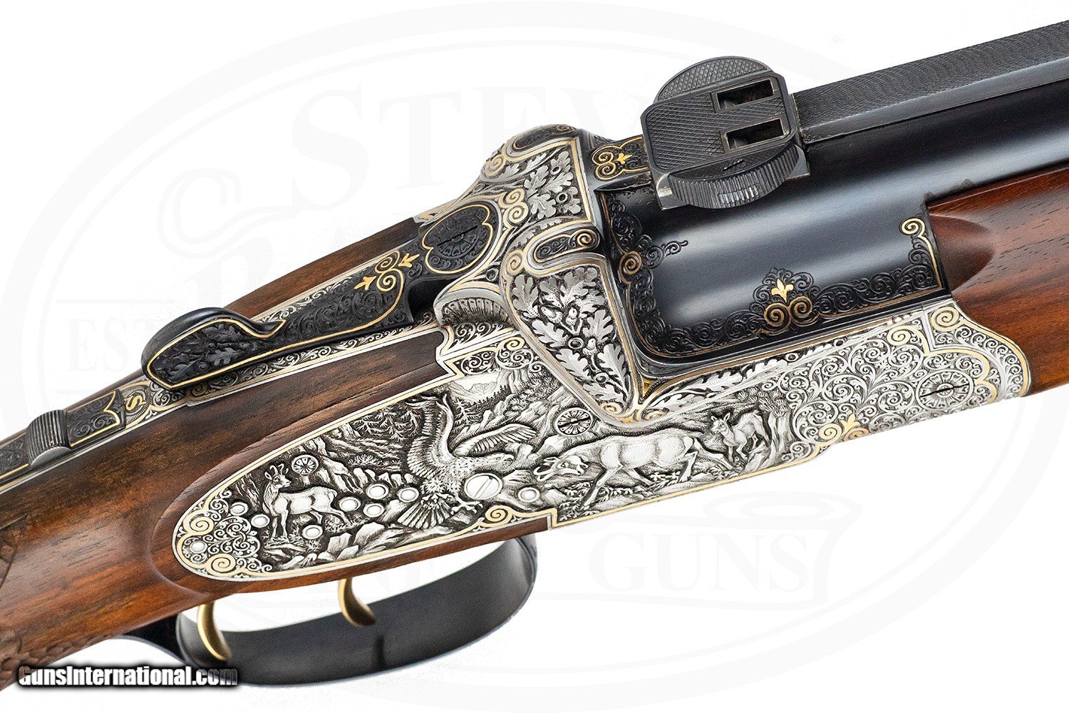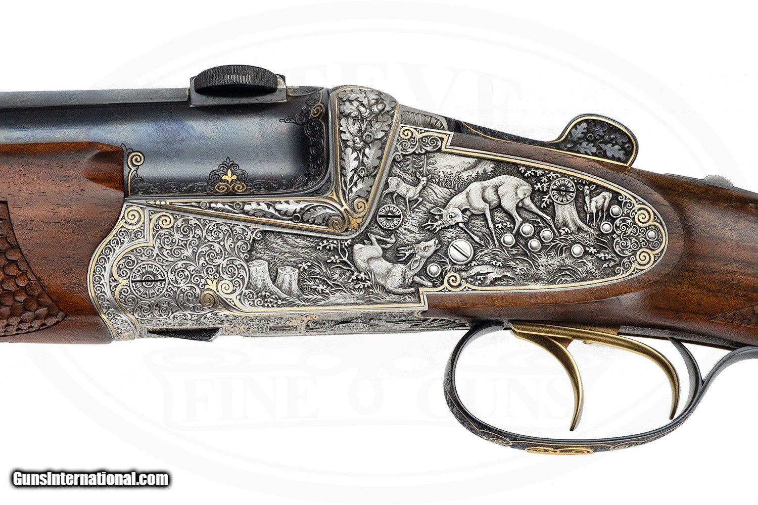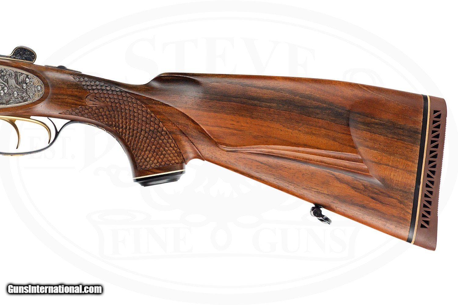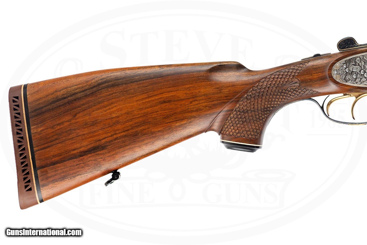 Description: SN# 19XXX PROOFED 1987 ENGRAVED AND GOLD INLAID 25 5/8" BOHLER RASANT STEEL BARRELS WITH RAMPED FRONT SIGHT AND FLIP UP REAR CLAW MOUNT ZEISS DIAVARI-Z 1,5-6X42 T* SCOPE EJECTOR DOUBLE SET TRIGGER TANG SAFETY FISH SCALED CHECKERED FIELD FOREARM RAISED CHEEKPIECE SLING SWIVELS WHITE LINE RECOIL PAD GUN IS IN EXCELLENT CONDITION WITH LIGHTEST OF HANDLING TO WOOD AND METAL FINSIHES FROM CARFEUL STORAGE AND LIGHT USE 8BLS 12 OZ 14" LOP Price: $12,500.00 Buy Now Contact Seller |