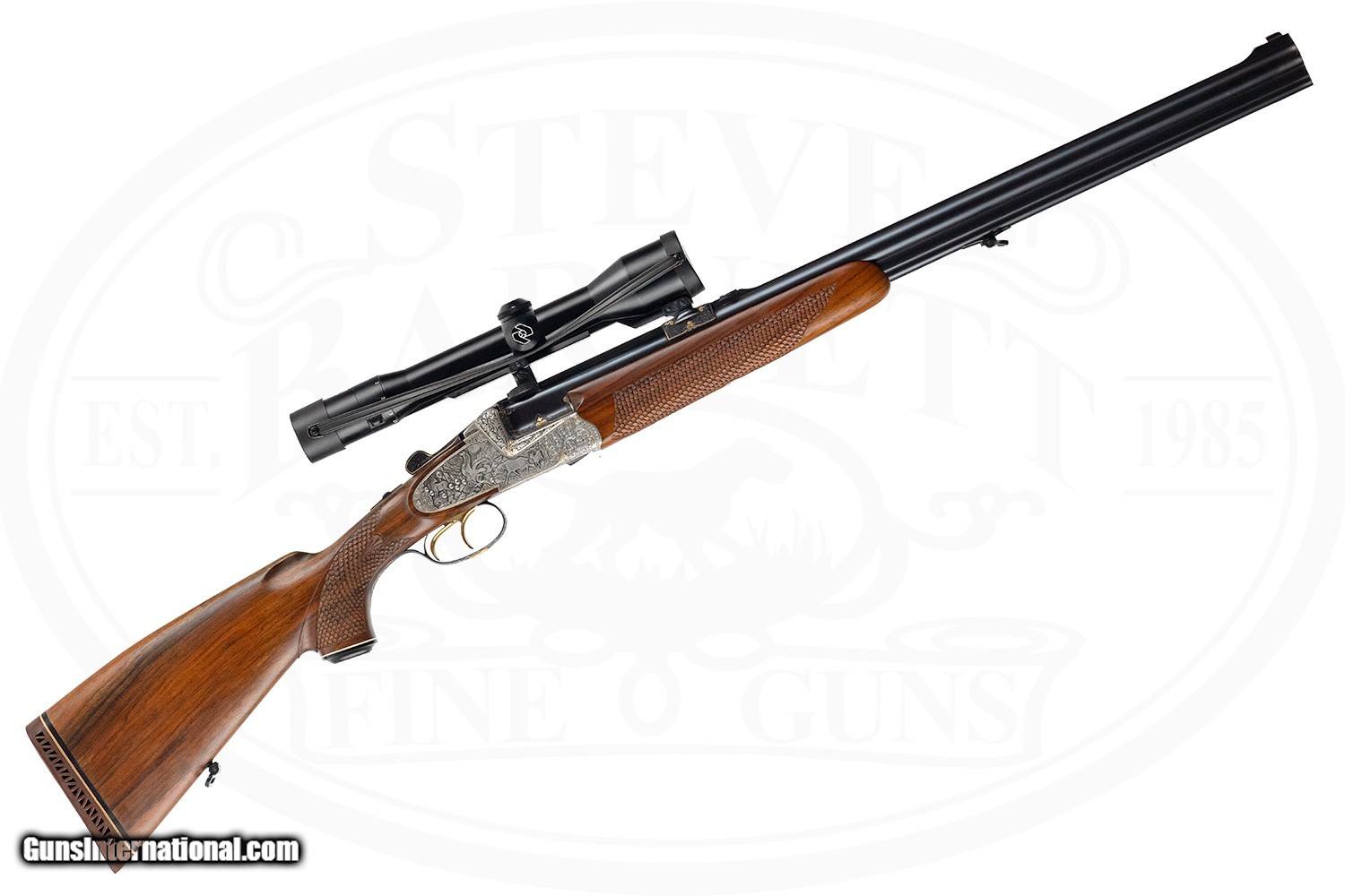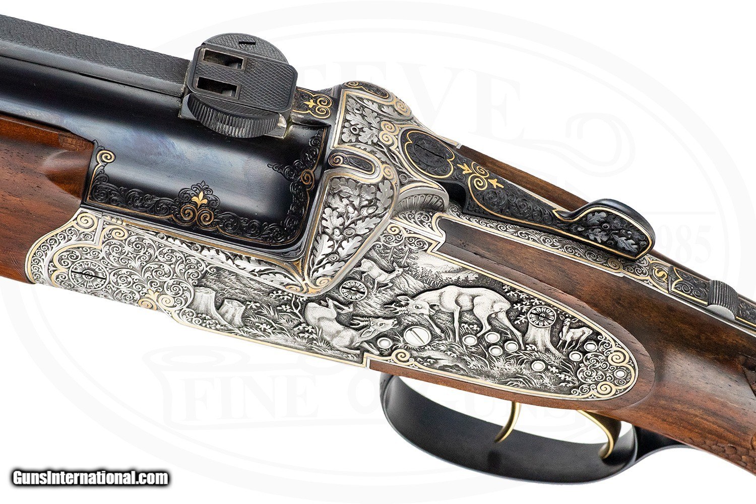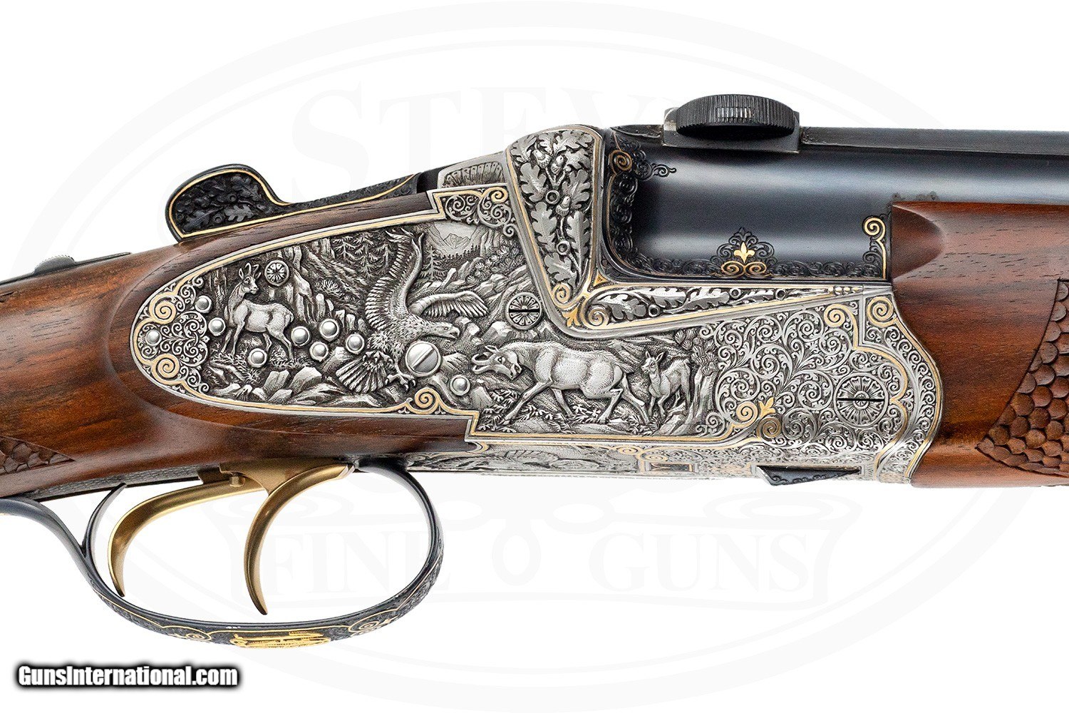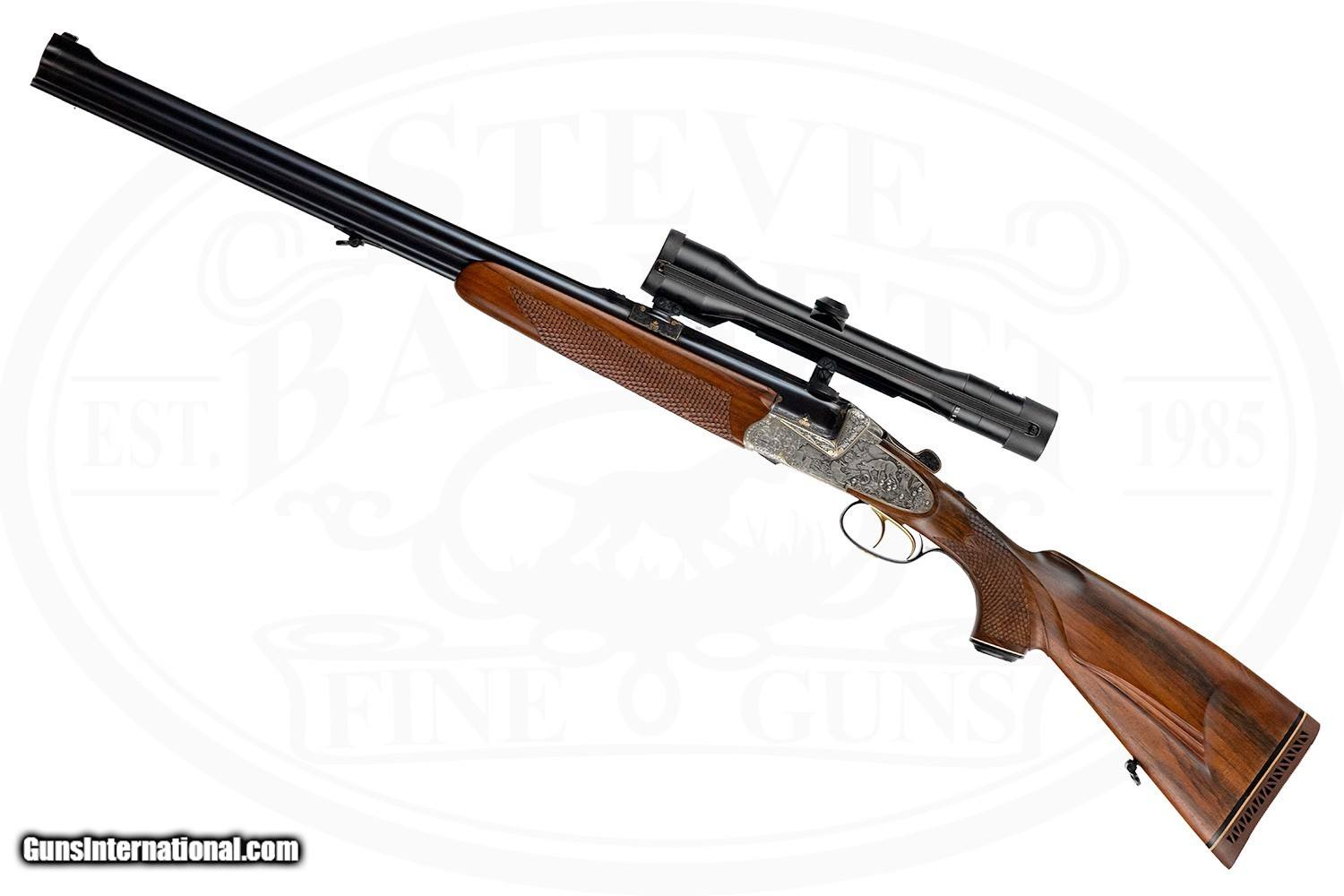 Description: SN# 19XXX PROOFED 1987 ENGRAVED AND GOLD INLAID 25 5/8" BOHLER RASANT STEEL BARRELS WITH RAMPED FRONT SIGHT AND FLIP UP REAR CLAW MOUNT ZEISS DIAVARI-Z 1,5-6X42 T* SCOPE EJECTOR DOUBLE SET TRIGGER TANG SAFETY FISH SCALED CHECKERED FIELD FOREARM RAISED CHEEKPIECE SLING SWIVELS WHITE LINE RECOIL PAD GUN IS IN EXCELLENT CONDITION WITH LIGHTEST OF HANDLING TO WOOD AND METAL FINSIHES FROM CARFEUL STORAGE AND LIGHT USE 8BLS 12 OZ 14" LOP Price: $12,500.00 Buy Now Contact Seller |