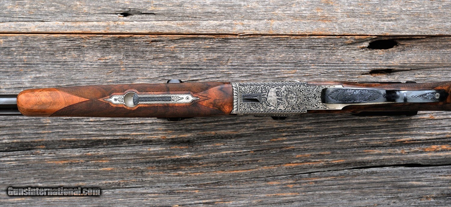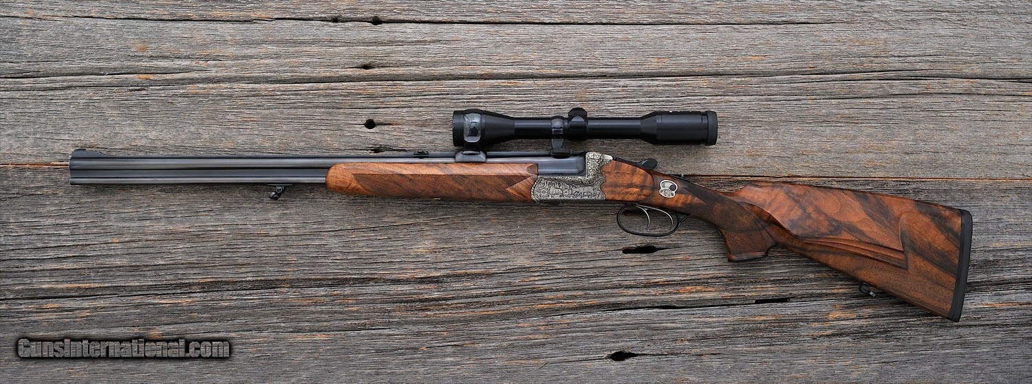 Description: Benedikt Winkler - 41 - 20, 6.5x57R, .22WMR caliber - Item Number: BEN448 Rifle type: Drilling Action: Boxlock Barrel length: 24 Sights: Factory Sights Scope: Swarovski Power: 6 Weight: 8 lbs, oz Overall condition: Very Good Stock condition: Very Good Metal condition: Very Good Stock: Original finish Metal: Original finish Type of Case: none Finish: Coin & Black Type of Butt: Factory Pad thickness: 0.5 " Manufactured in: Austria Lop: 14 1/4 " Hand: Right Comments : Rifle is in very good condition with a few light blemishes. R-63 SOLD |