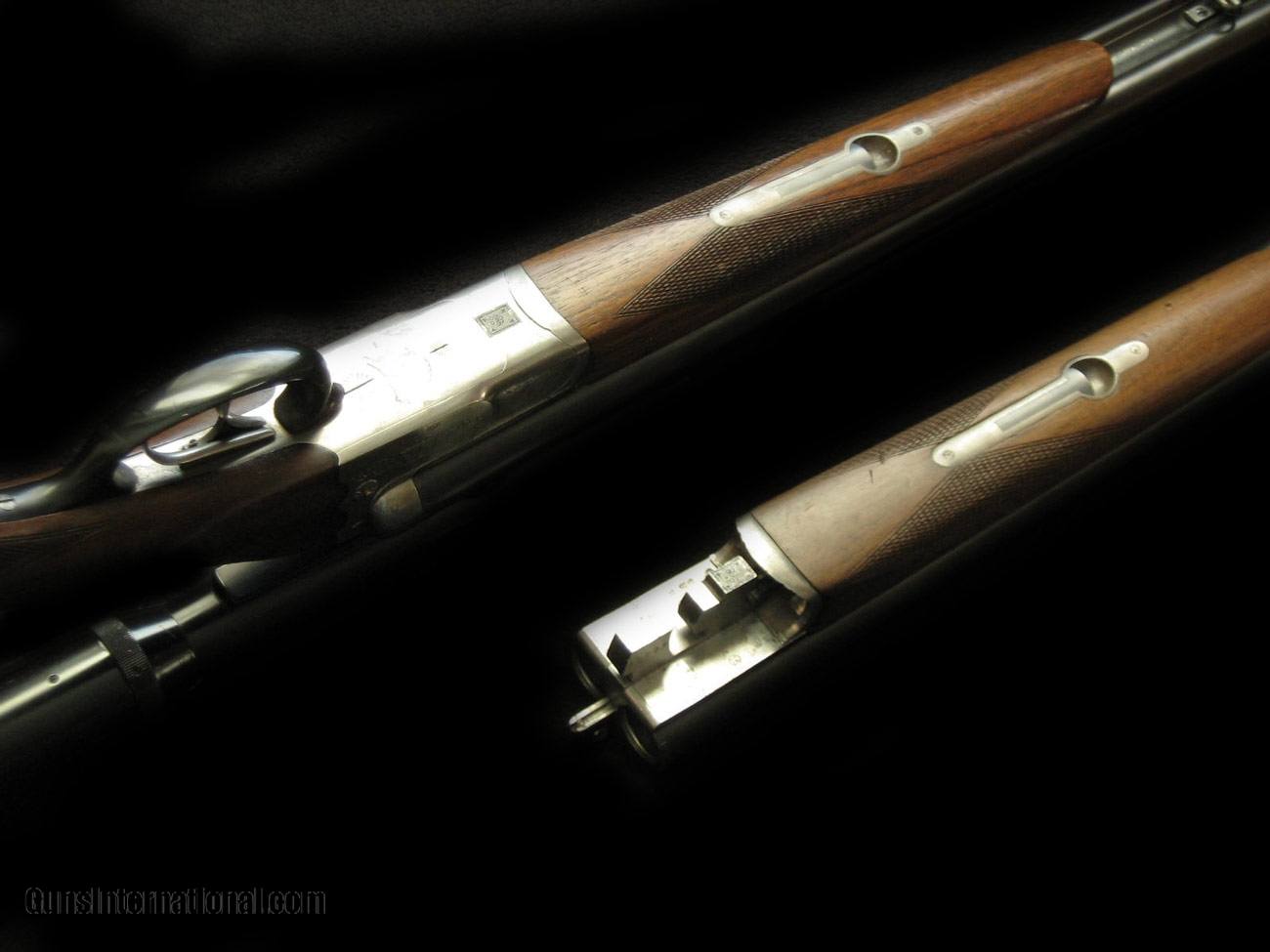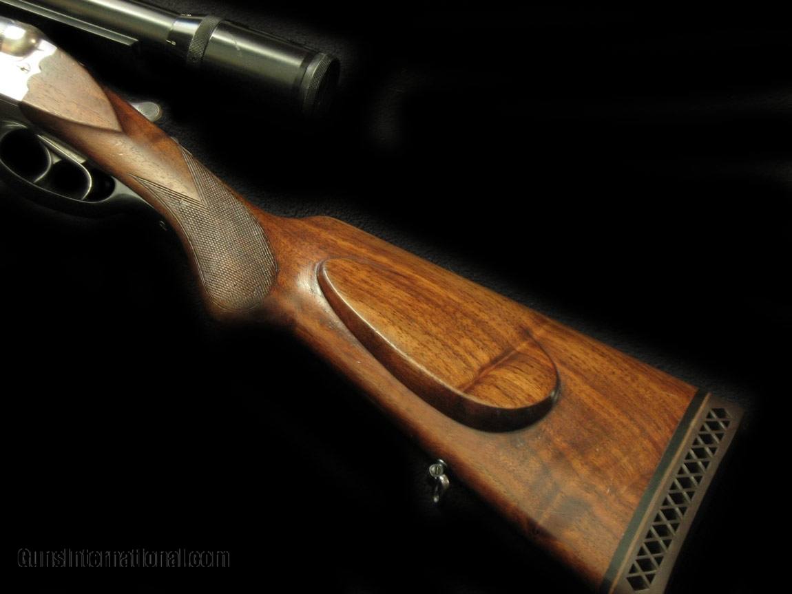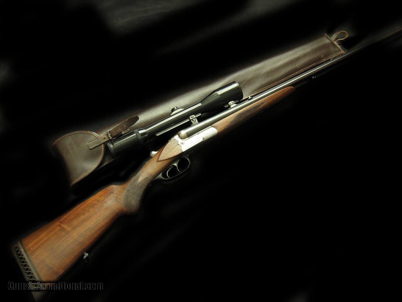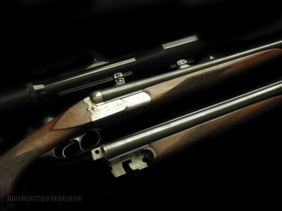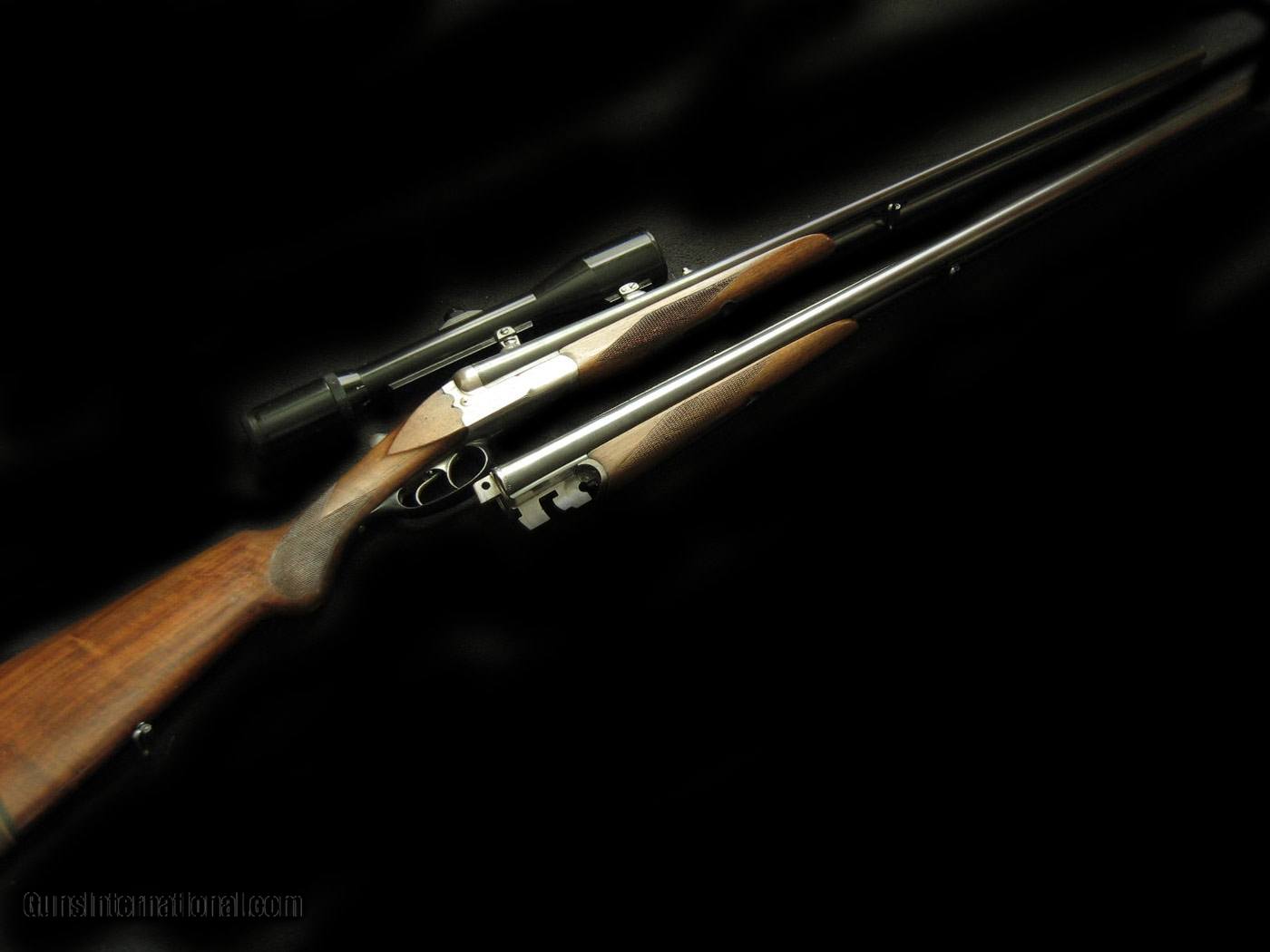 Description: Sturdy boxlock with a set of 16ga 28x2 1/2" barrels, and a set of 26 1/2" 16ga/8x57JR combo barrels with a Geco 2.5-8x rail scope in claw mounts. All bores nice and clean. Useful travel combo. SOLD |