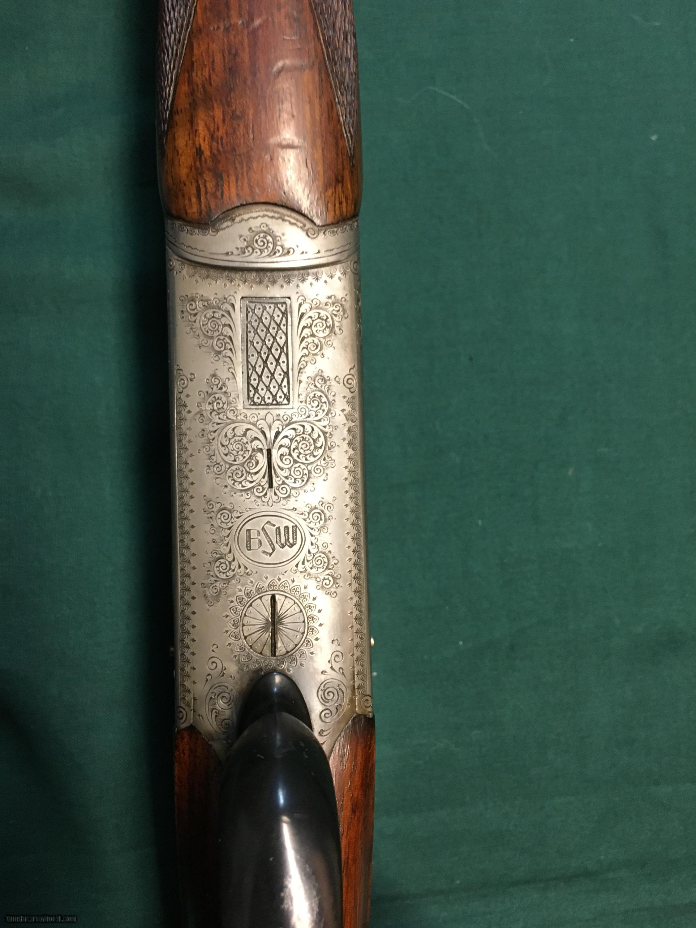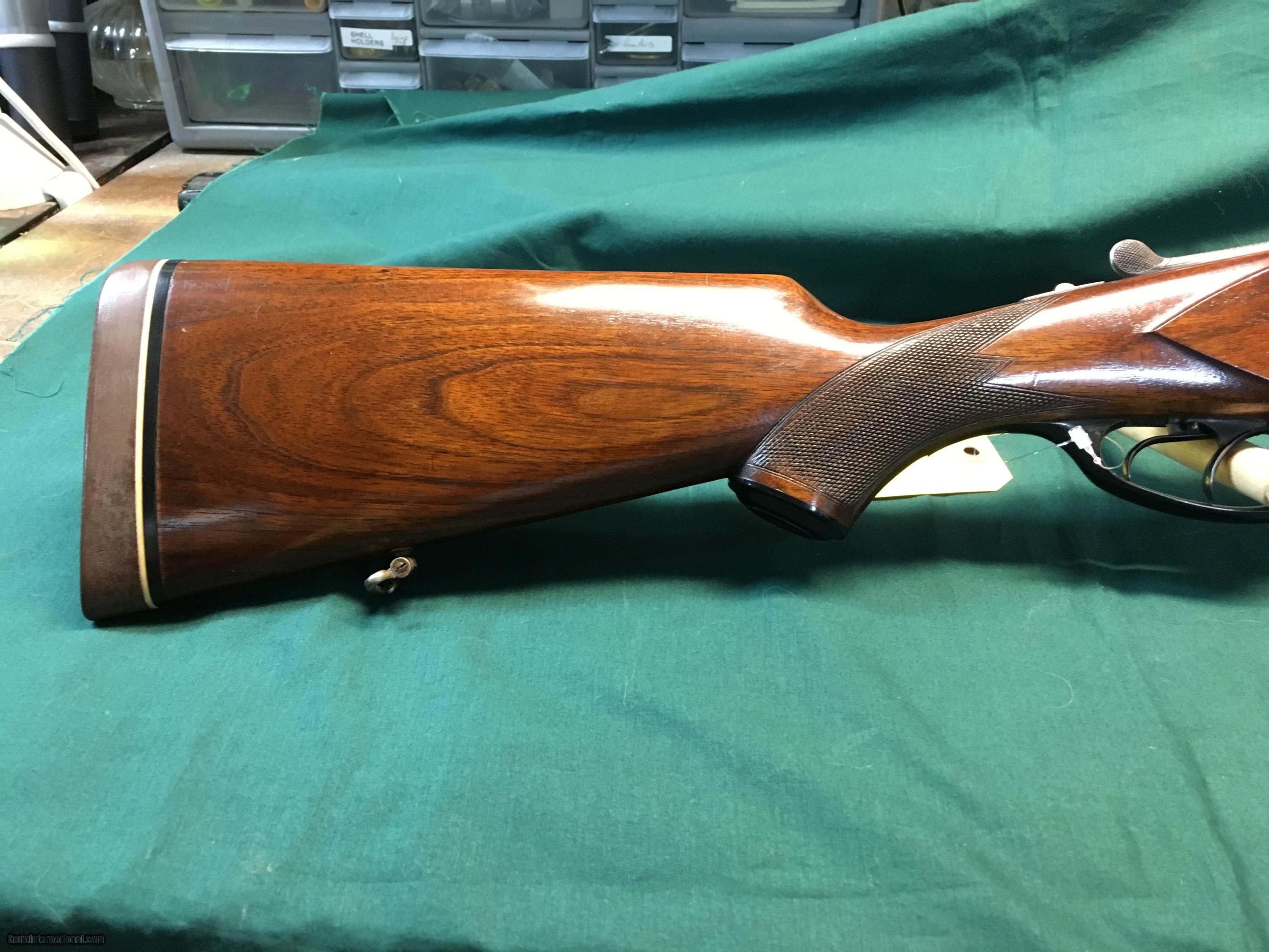 Description: For sale is a very nice BSW over under Bockbuschflinte or combo chambered in 16 ga. 2 3/4 and 7x65R with a Swarovski 1.25x4x24 scope. The BSW has 25 3/4 inch Fluss Stahl Krupp Essen barrels, flip up rear sight, double triggers with the front being a set trigger, claw mounts, horn trigger guard, and cocking indicators on the receiver. The wood is very nice but the stock has a small crack on each side next to the receiver.I have fired the BSW several times and the stock is very solid. The engraving is very nice and well done with stag on the left side, ducks on the right side and scrolling on the bottom. It locks up fine and functions perfectly. The Swarovski 1.25x4x24 scope has the German number 4 reticule and is as new. The scope mounts were made by yours truly and carefully fitted to the claw bases. The rings are Leupold. The scope may be removed and reattached with no loss of zero. The gun was manufactured by BSW in may of 1938 in the Simson factory, Suhl, Germany after the Simson name was changed to BSW. SOLD Curio/Relic: Yes Manufacturer: BSW Model: Bockbuschflinte Serial Number: 43667 |