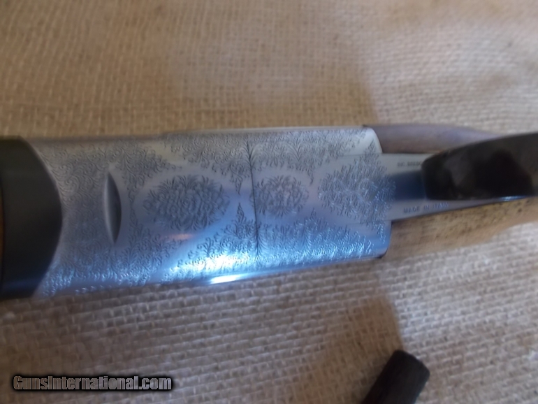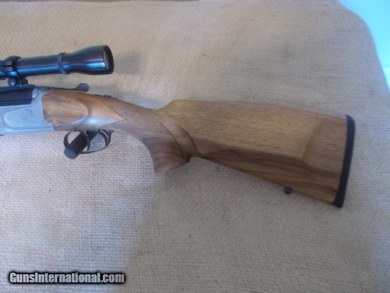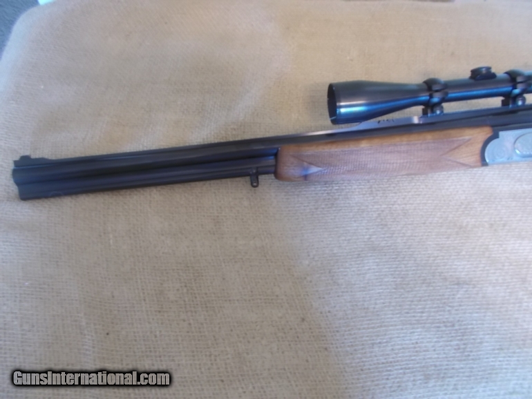 Description: 2 3/4" or 3" mag chamber, 23 1/2" bbl., quater rib, folding rear, Dt's, hand engraved exotic gamescenes of American Elk & Bison on satin siver receiver with natural habitat of each bordering, checkered Belgium blond hand checkered walnut (nicely figured), Weaver K6 WA all steel scope, factory 1/2" solid pad, shot little 98% as new SOLD |