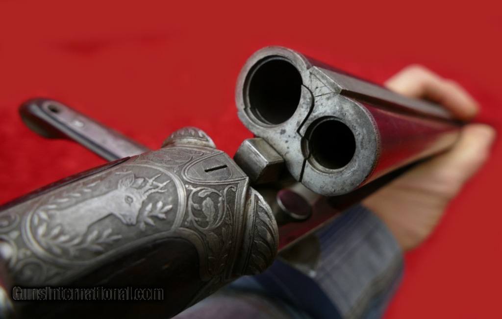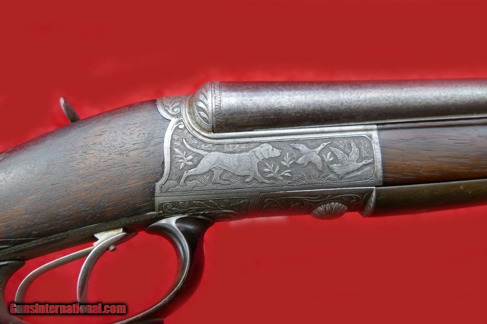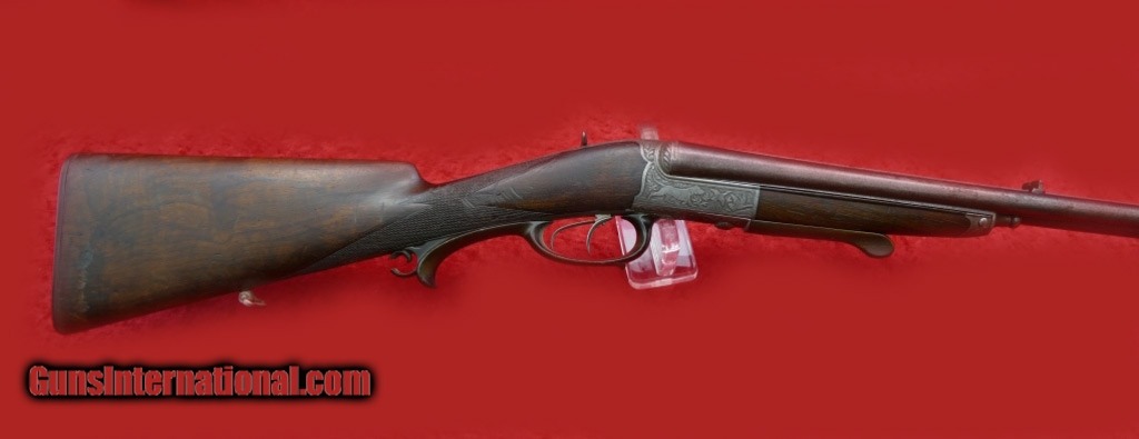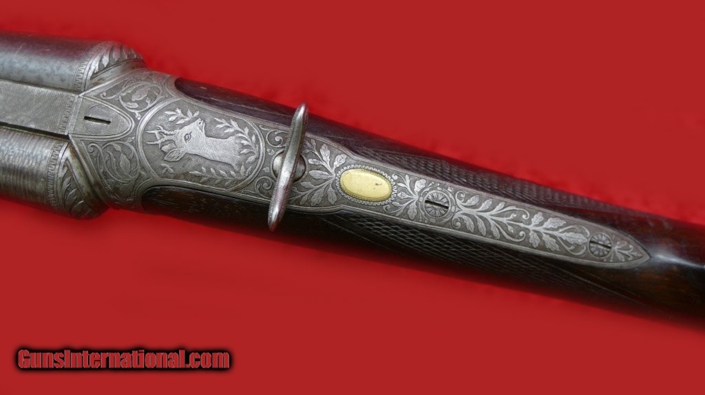 Description: Very high grade damascus gun, fortunately in non-proprietary calibers and not markedas to maker but has to be Collath, not the first Collath gun I have seen without the Collath marking. File cut rib w fixed blade sight.. Slim action w best game scene engraving and vacant gold oval. Bright 16ga barrel is 28 1/4" x 2 11/16" .670 bore cyl , clean Henry rifling, .429 major dia so easy reloading. Rt trigger adjustable, elaborate horn trigger bow w missing piece. 13 3/4" LOP thru original buttplate, 1 5/8" and 2 1/2" drops to sights. Barrels could use a rebrown, wood has some compression marks that will steam out. 6 3/4 lb SOLD |
