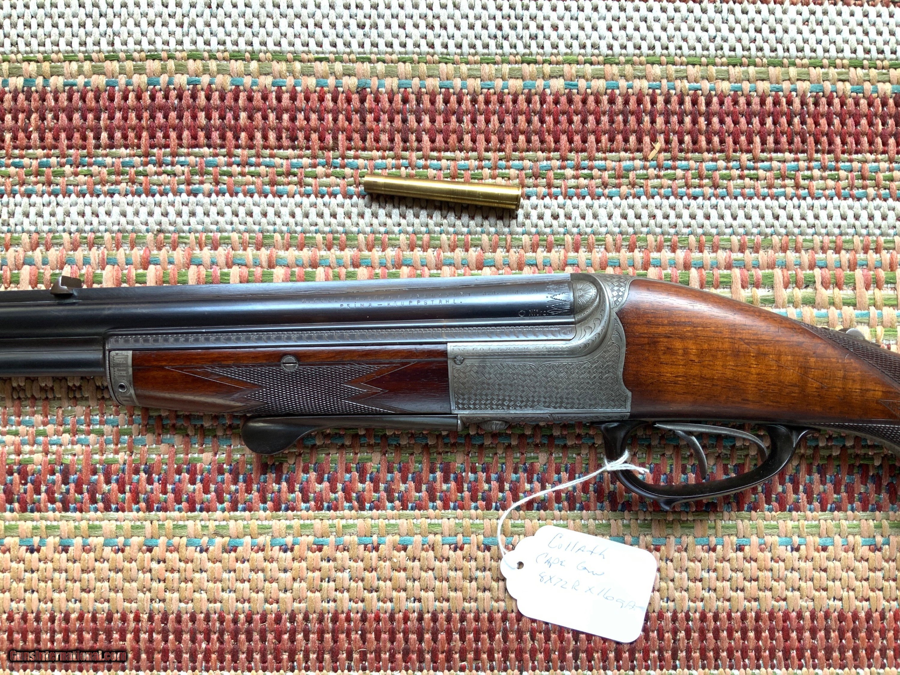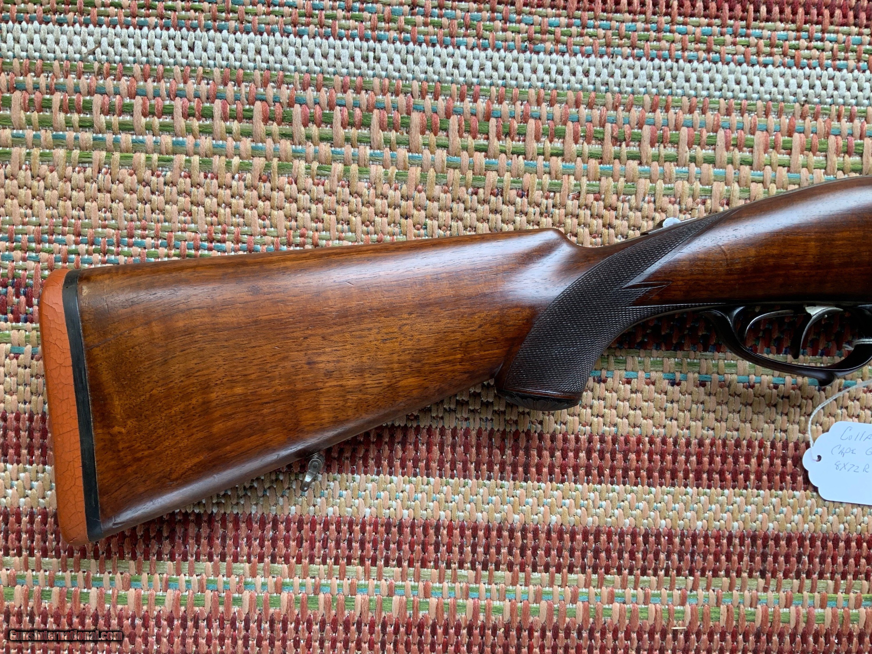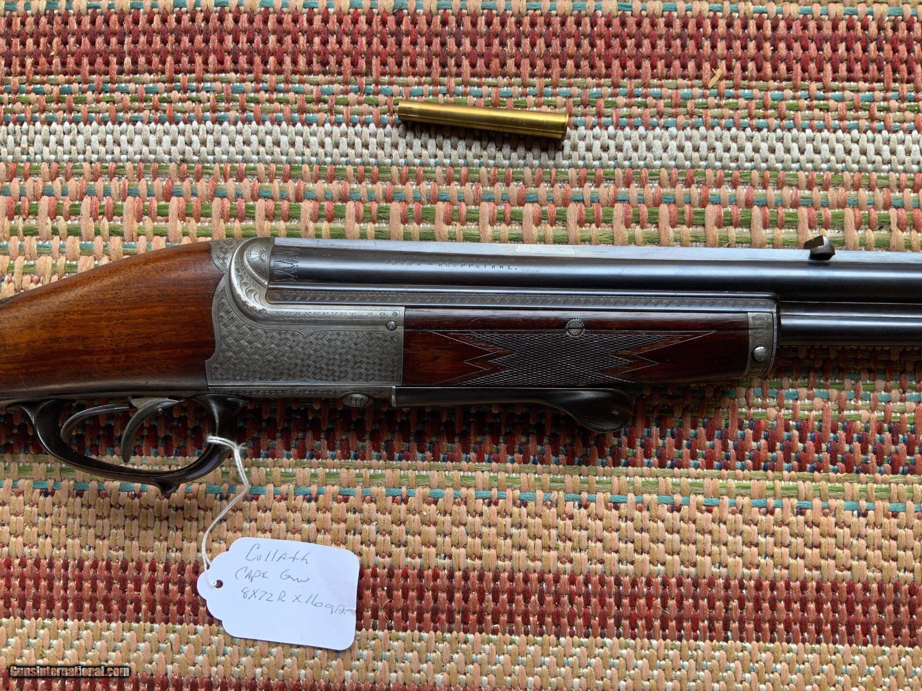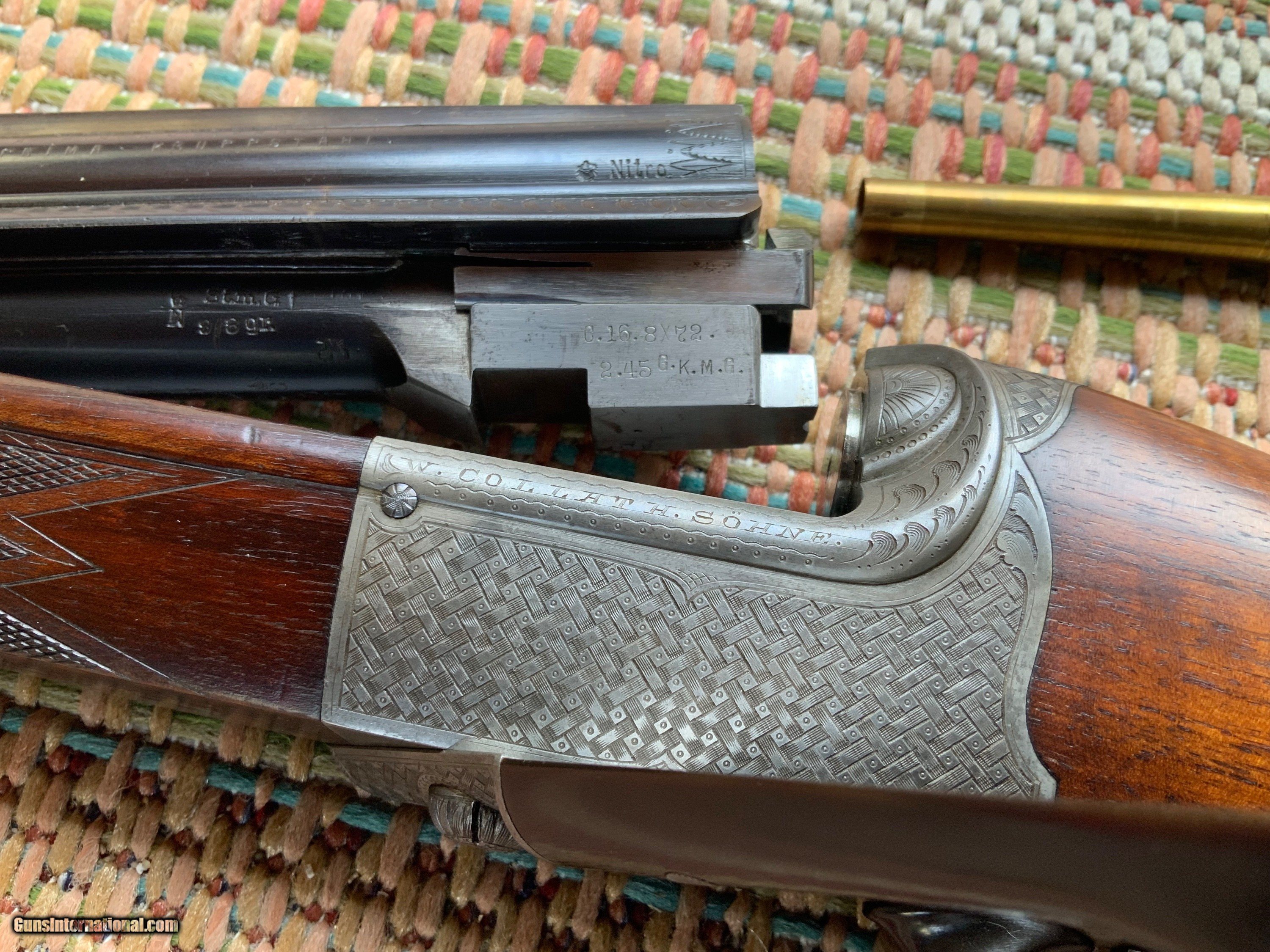 A rare Collath combination rifle in 8x72R x 16 gauge 2 1/2" chamber full choke. Rifle is in very good condition with barrels retaining 95% of their original rust blue finish and have excellent bores. Action has turned a uniform grey color with Collath signature basket weave engraving. Wood retains original finish with a couple light scratches from use. An old rubber butt pad has replaced the original horn butt plate that could easily be restored buy a confident gunsmith. Black water Buffalo horn trigger guard and under lever is in excellent shape with no cracks. For anyone collecting this iconic makers rifles this is a very nice representation of their over under combination gun which is hard to come by in this condition. 8x72R brass , dies and components as well as 2 1/2" 16 gauge shells can be purchased to make this a usable hunting rifle.