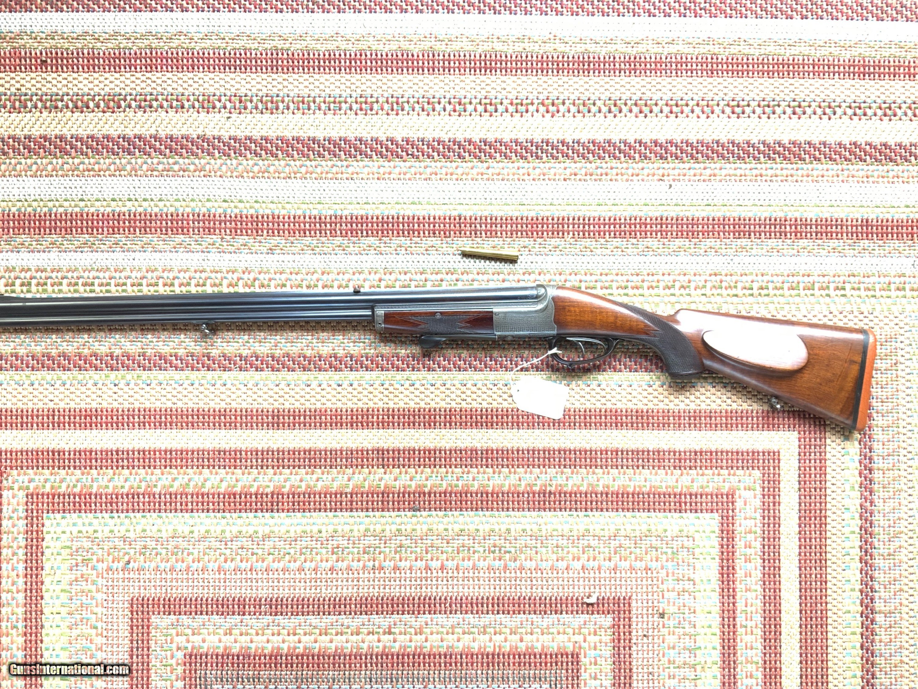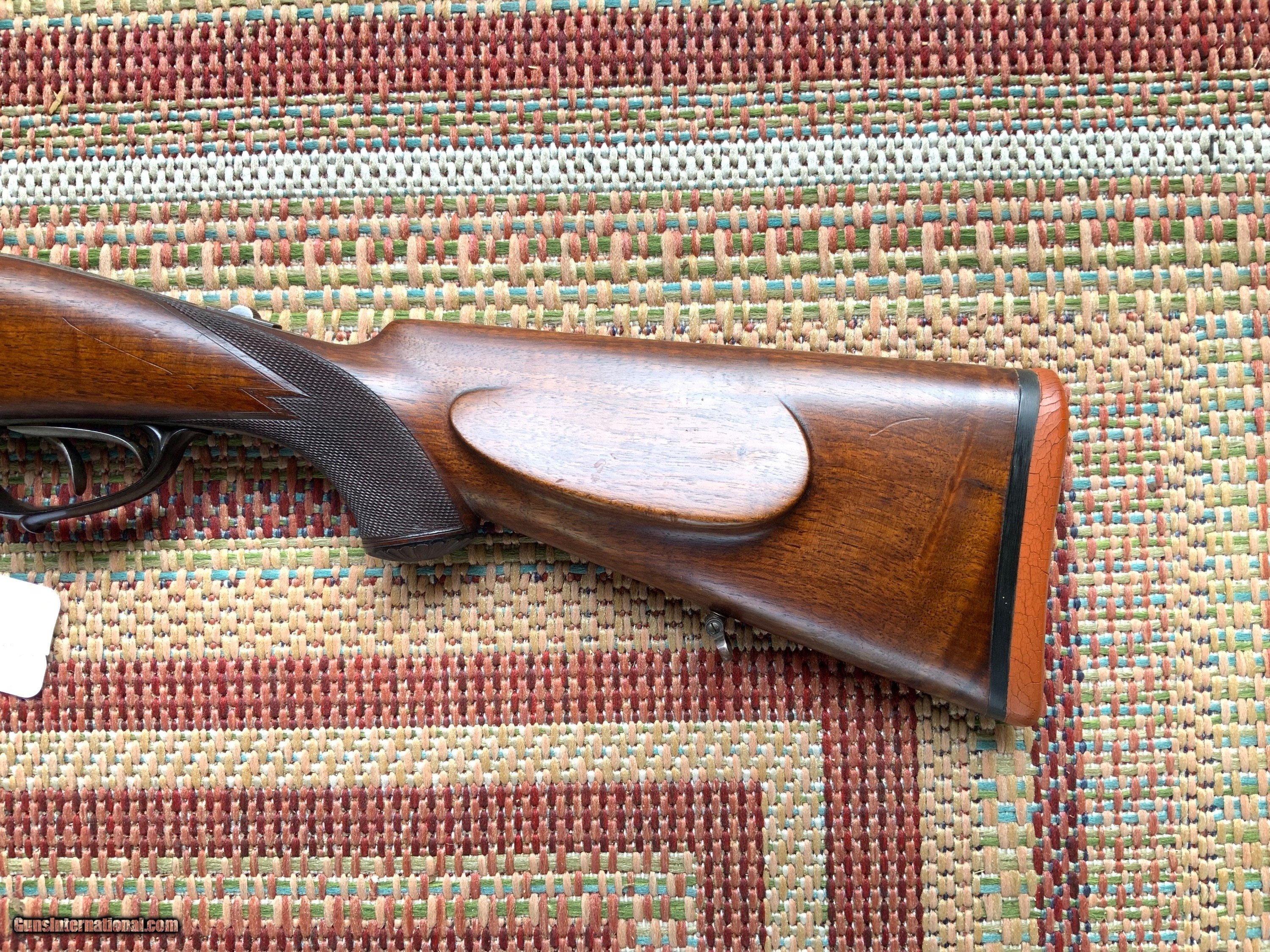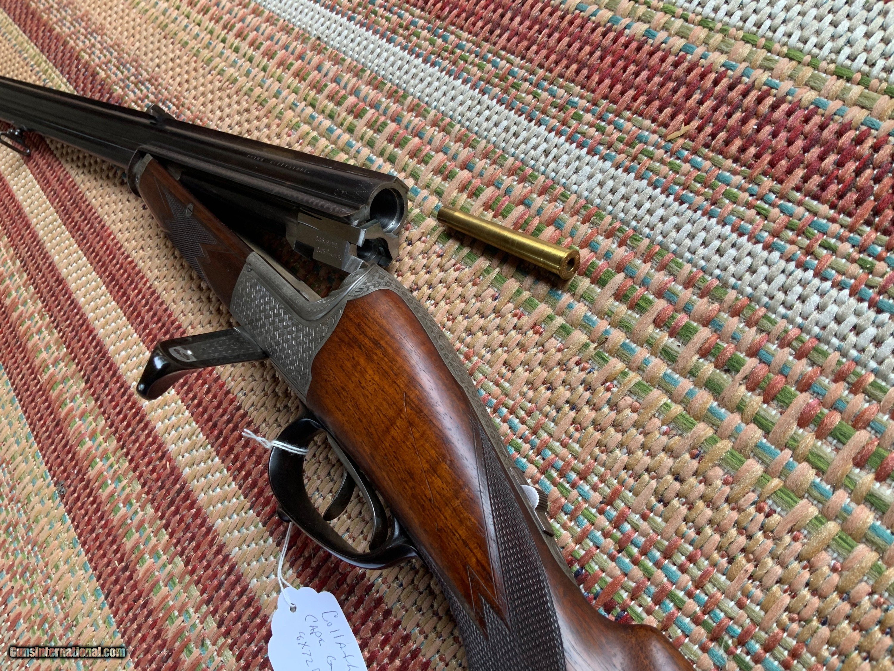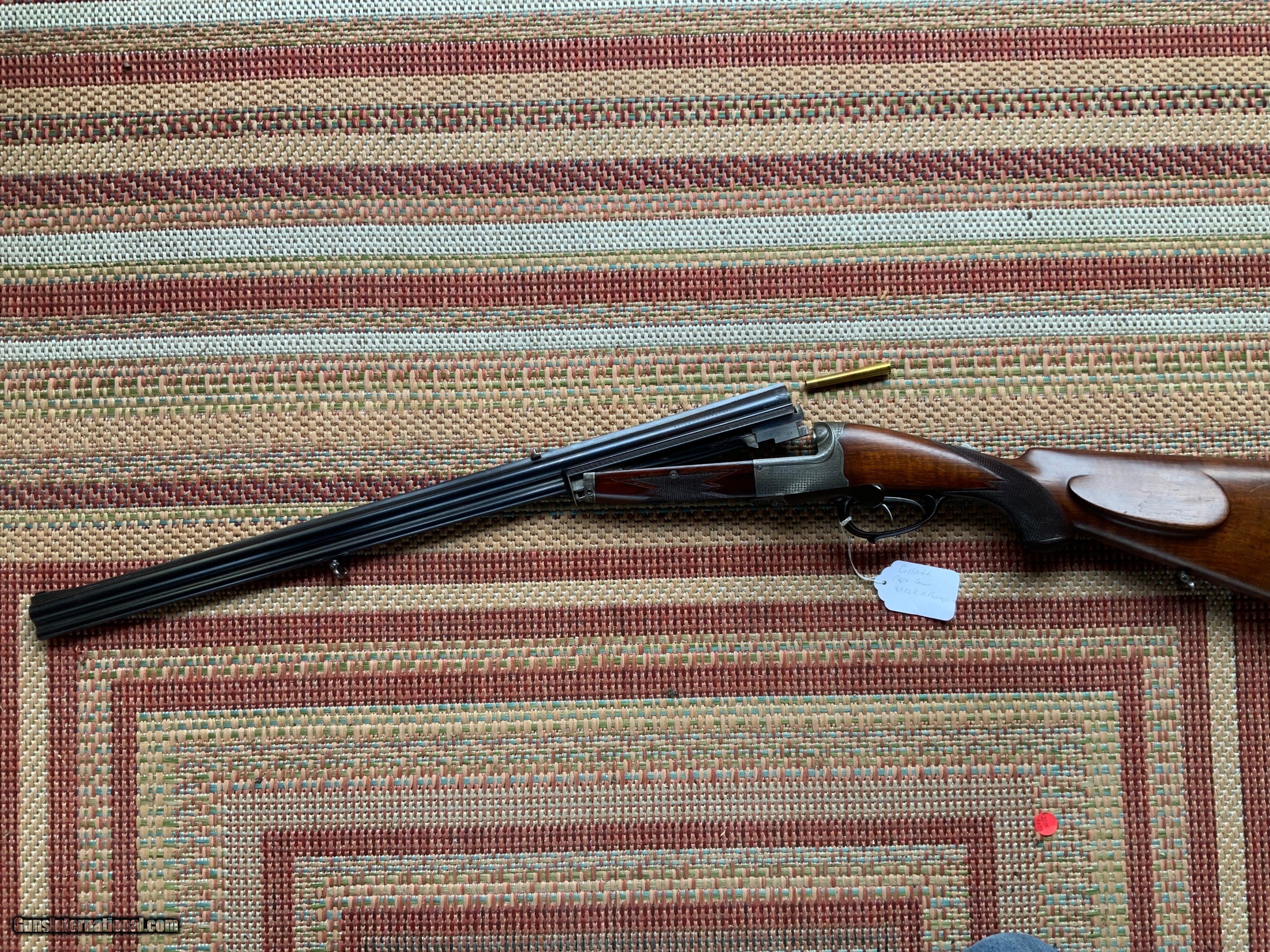 A rare Collath combination rifle in 8x72R x 16 gauge 2 1/2" chamber full choke. Rifle is in very good condition with barrels retaining 95% of their original rust blue finish and have excellent bores. Action has turned a uniform grey color with Collath signature basket weave engraving. Wood retains original finish with a couple light scratches from use. An old rubber butt pad has replaced the original horn butt plate that could easily be restored buy a confident gunsmith. Black water Buffalo horn trigger guard and under lever is in excellent shape with no cracks. For anyone collecting this iconic makers rifles this is a very nice representation of their over under combination gun which is hard to come by in this condition. 8x72R brass , dies and components as well as 2 1/2" 16 gauge shells can be purchased to make this a usable hunting rifle.