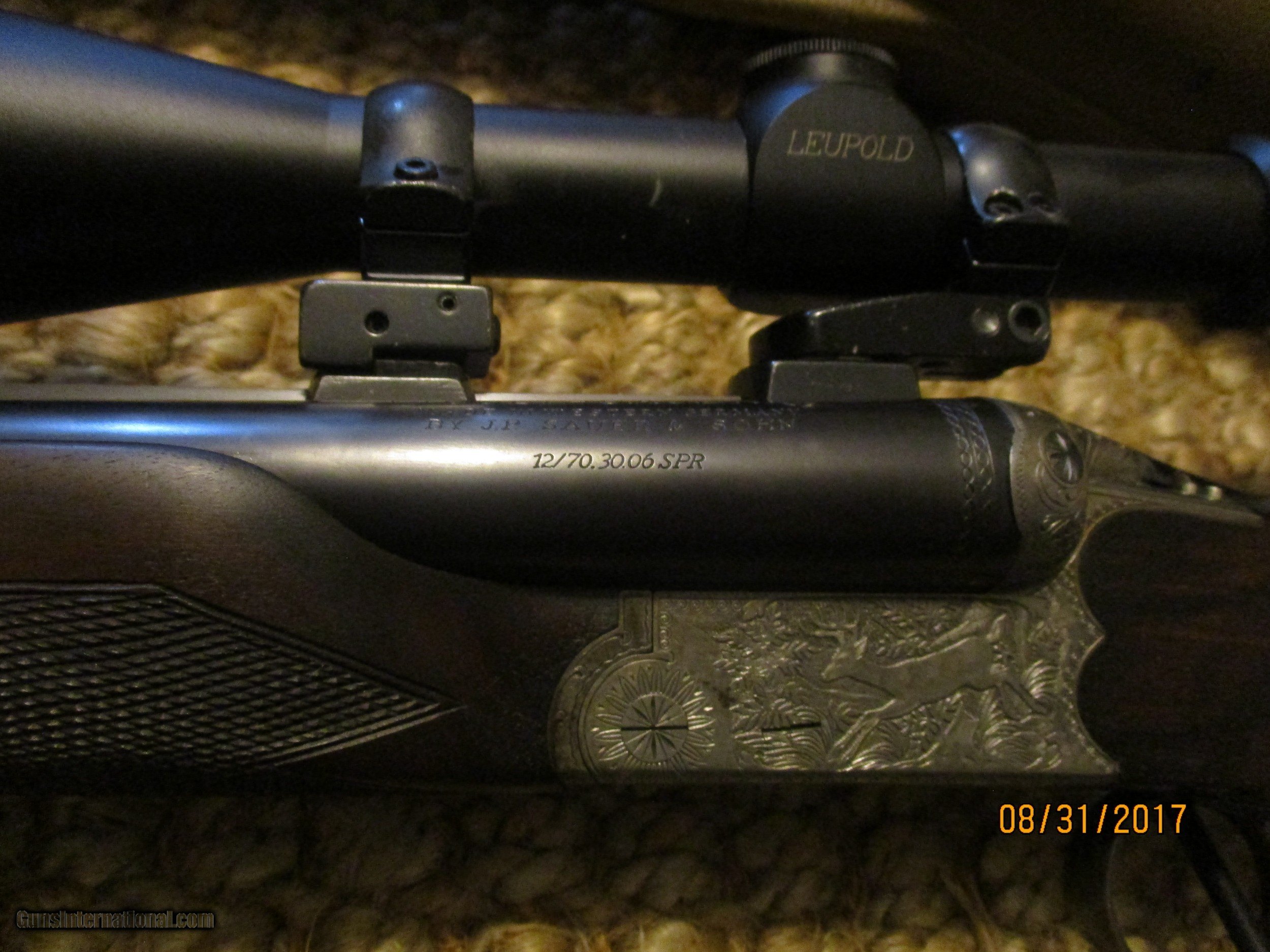 Description: 25" bbls, F/M 12ga/30-06 rifle, 2 3/4" chambers, safety activated pop-up rear sight, blade front, Greener crossbolt locking action,double underlugs, checkered tapered rib, barrel fences, sideclips, European EAW quick release mounts, Leupold Vari X 11 3 x 9 x 40 WA scope, twin cocking indicators, front set trigger, auto safety, deep relief Germanic engraving of deer featuring (Buck & Doe) surrounded in their natural habitat, European select checkered walnut, hogback PG stock, European. cheekpiece, beavertail forearm, 7/8" J.P. Sauer & Sohn vented pad, 95%-97% original condition & tight as new condition also fitted black canvas fleece lined takedown pocketed field case with carry strap !! SOLD |