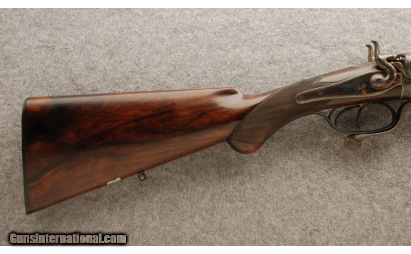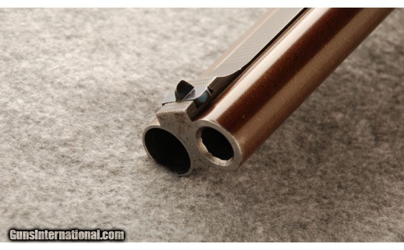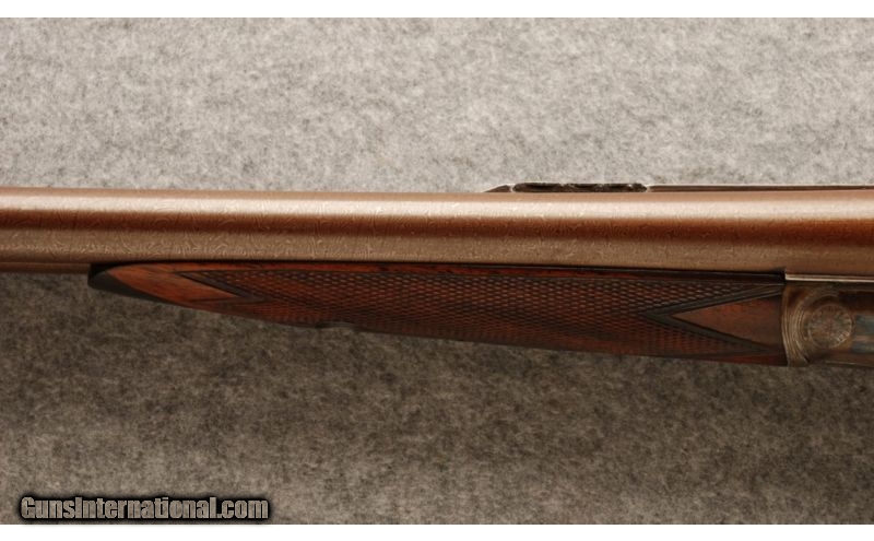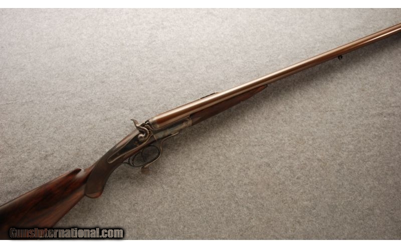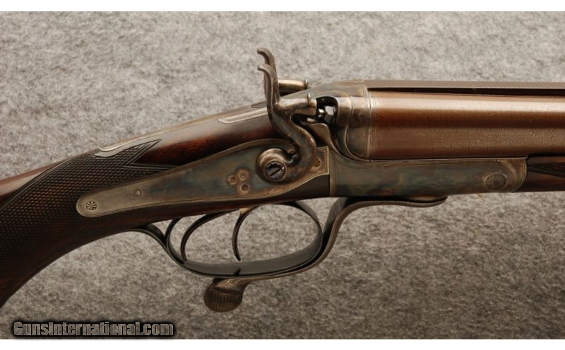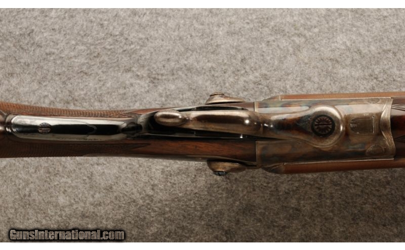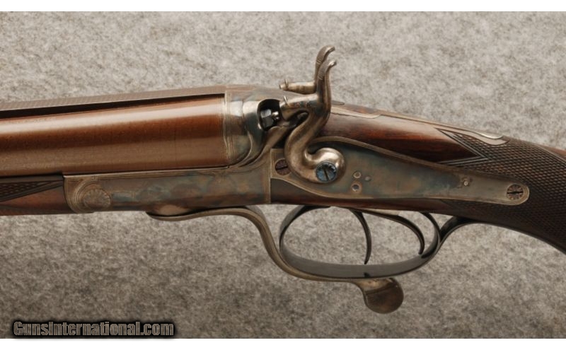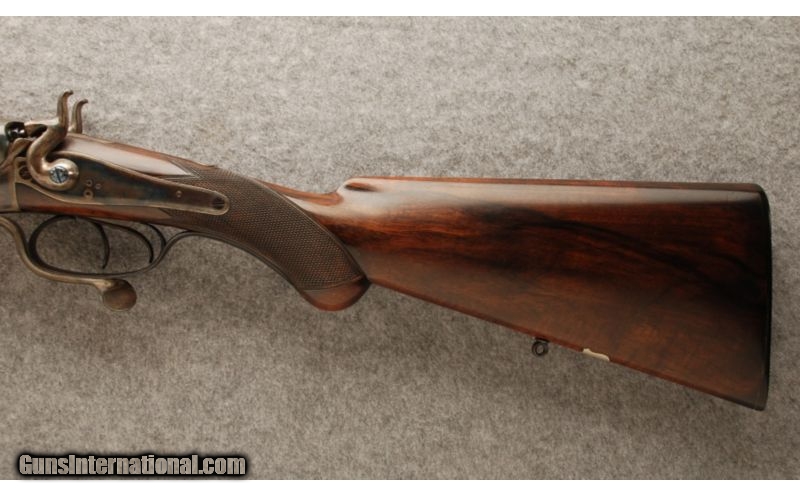 Description: This Daniel Leonard Double Hammer Cape Gun features a Henry Jones Underlever, back-action penisula locks with rebounding hammers, percussion-style fences, hand-matted rib with Doll's Head extension, russeted horseshoe damascus barrels with express sights, tight wood-to-metal fit, and a blank escutcheon. SOLD Caliber Info: 16 ga. x 500-450 No. 2 Musket Chambers: 16 ga. is 2 1/2 Metal Condition: Barrels have been refreshed. Case color appears to be original. Trigger guard has been hot blued. Wood Condition: Shows a moderate level of handling and use marks. Bore Condition: Both bores appear nice and clean. Rifle bore shows well-defined lands. Barrels: 26" Damascus in an attractive, traditional russet. Stock: Half Pistol Grip Stock Dimensions: 14" LOP; 1 5/8" DAC; 2" DAH Fore End: Splinter w/ Deeley Release and Buffalo Horn Tip Butt Pad: Buffalo Horn Weight: 8 lb. Sights: Express Sights marked 100, 200, and 300. Chokes: None Extras: Includes 12 pieces of empty brass for loading 500-450 No. 2 Musket. Item Location: Centerville, OH |