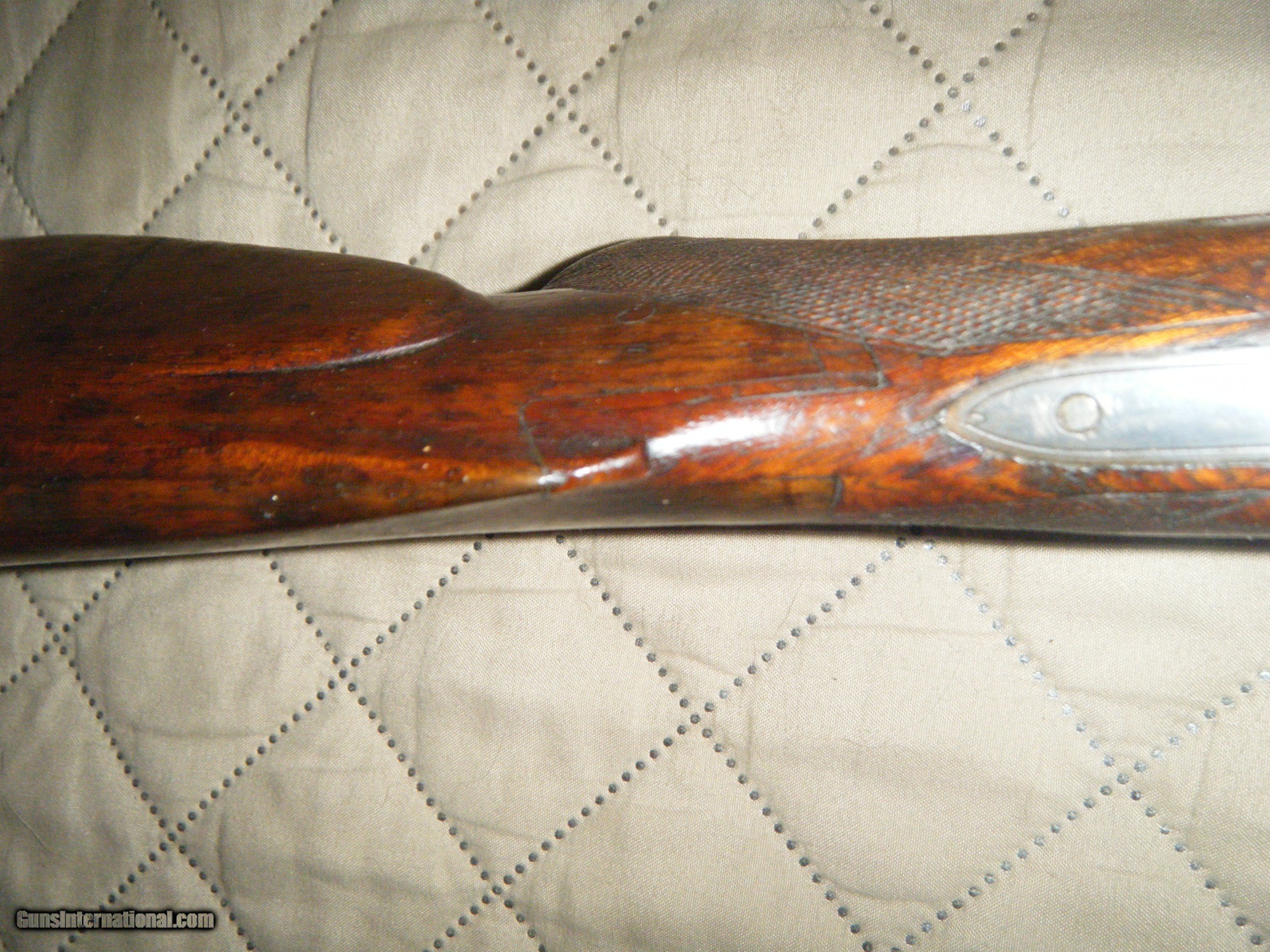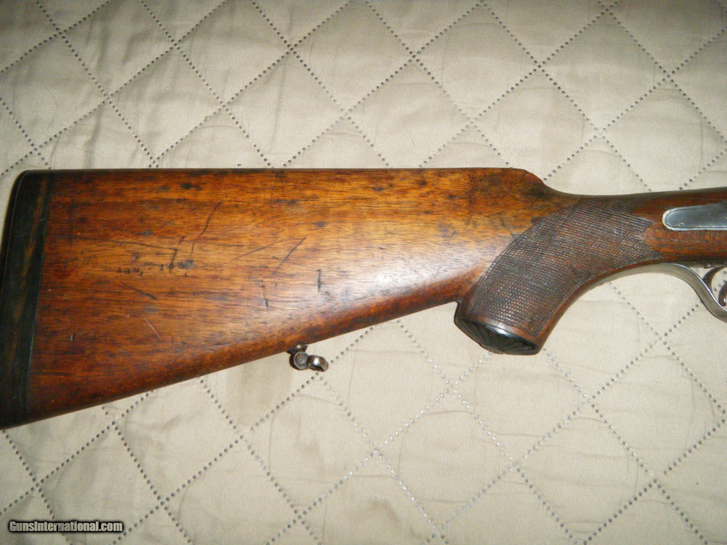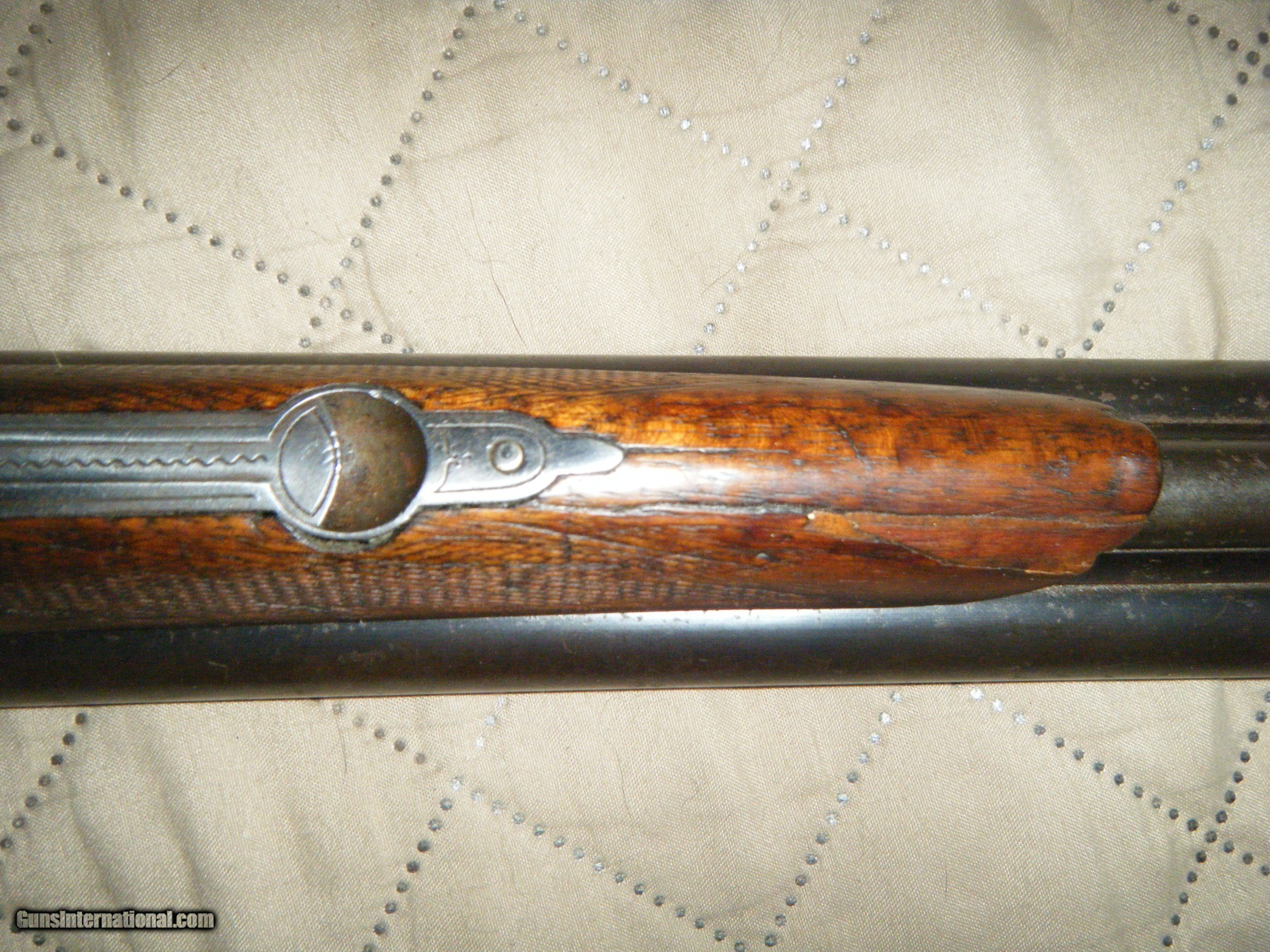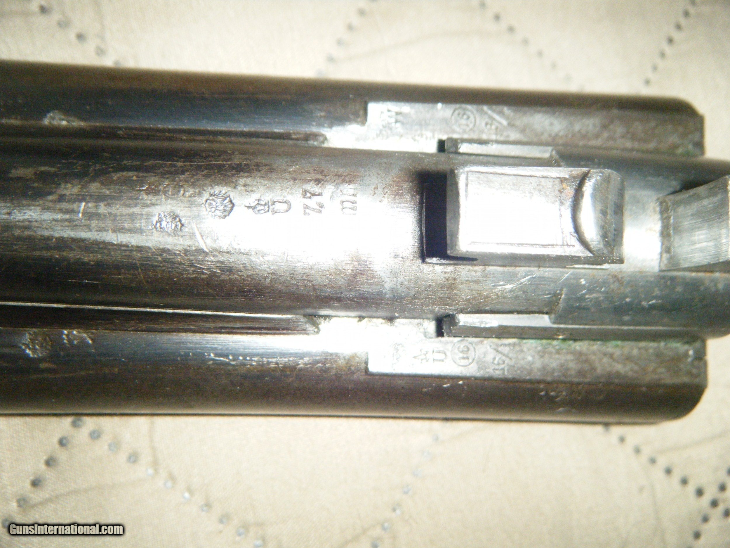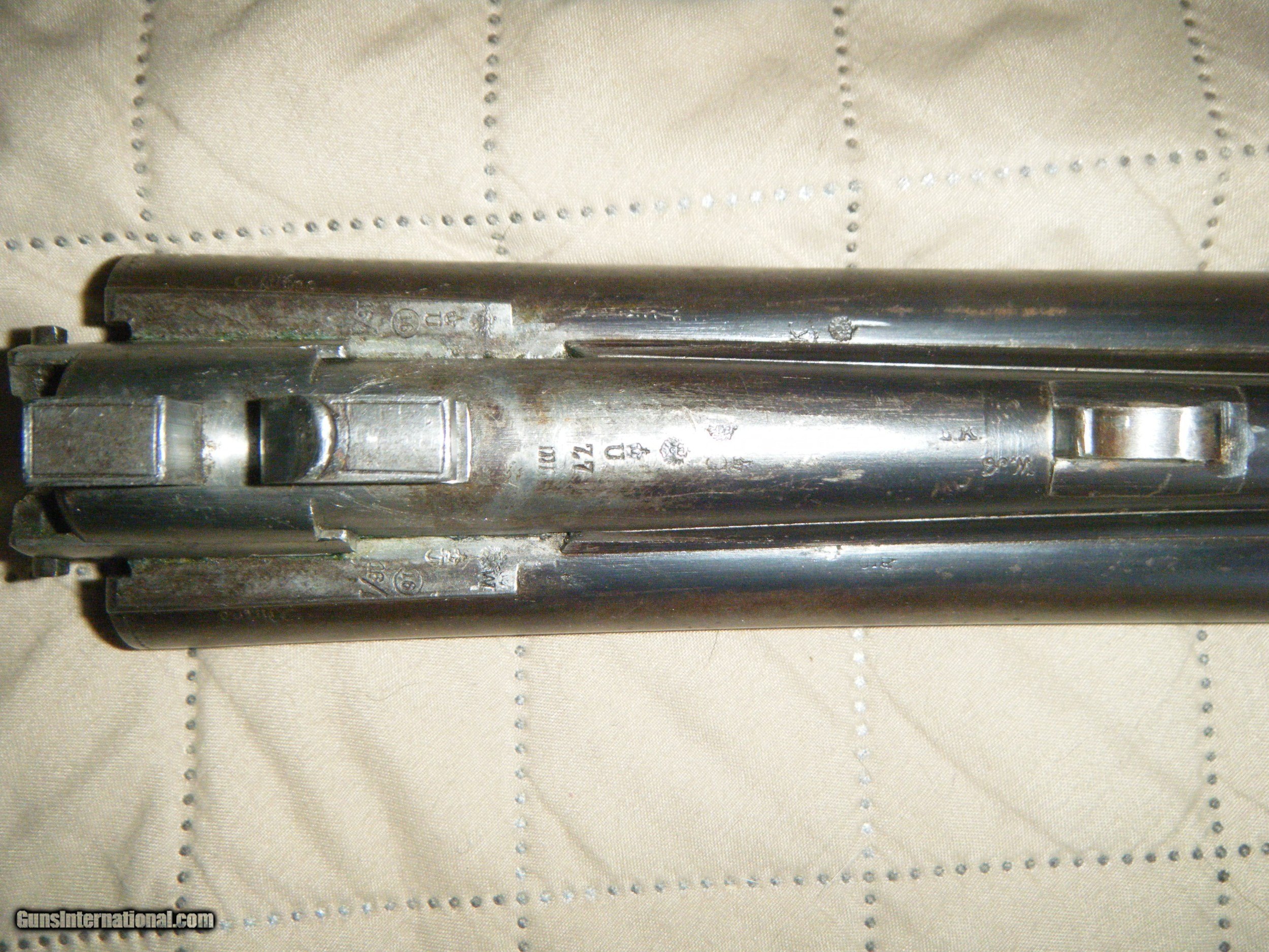 Description: Offered is drilling in what I believe is 16Ga. over 8MM x 48MM. No makers name and the caliber is my guess. Barrels are 27 1/2'. Blue is thinning and dulling with a few places of light freckling. There is a shallow dent in the right barrel that does not appear on the inside (see pictures). The shotgun bores are shiny with some very light erosion. I see no erosion in the rifle and the rifling is strong. The gun should shoot well. The wood has dings and scratches with a crack in the fore wood. I'm not sure what's going on at the top of the stock near receiver (see picture) but I don't think it's significant. It seems very good, mechanically. The right hammer fires the rifle when the top lever is moved to the left to select it. If you figure out the caliber, it should be a decent shooter. Antique so no paper work. $45 shipping. SOLD Antique: Yes Shotgun Gauge: 16 Gauge |