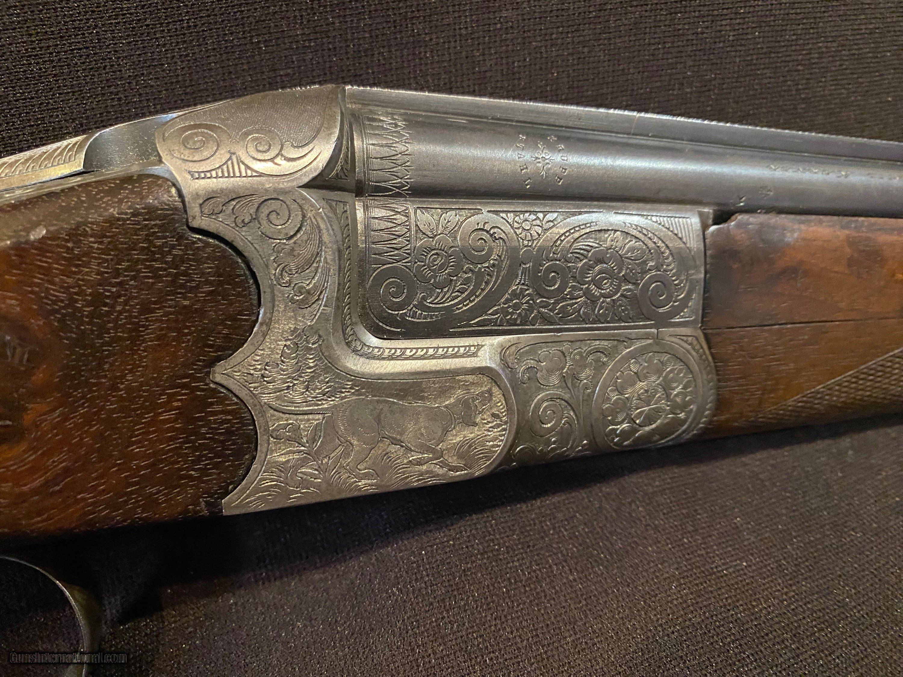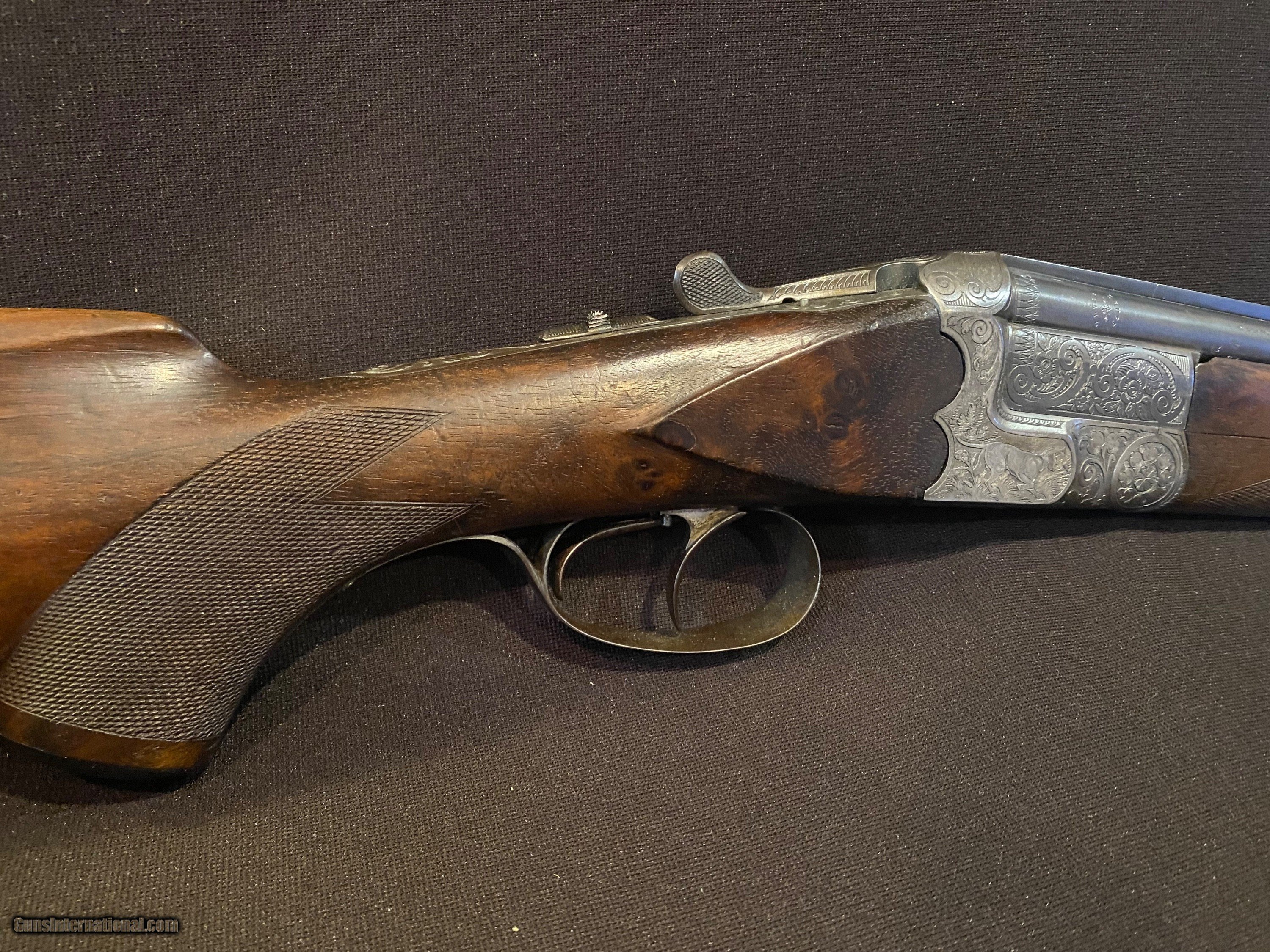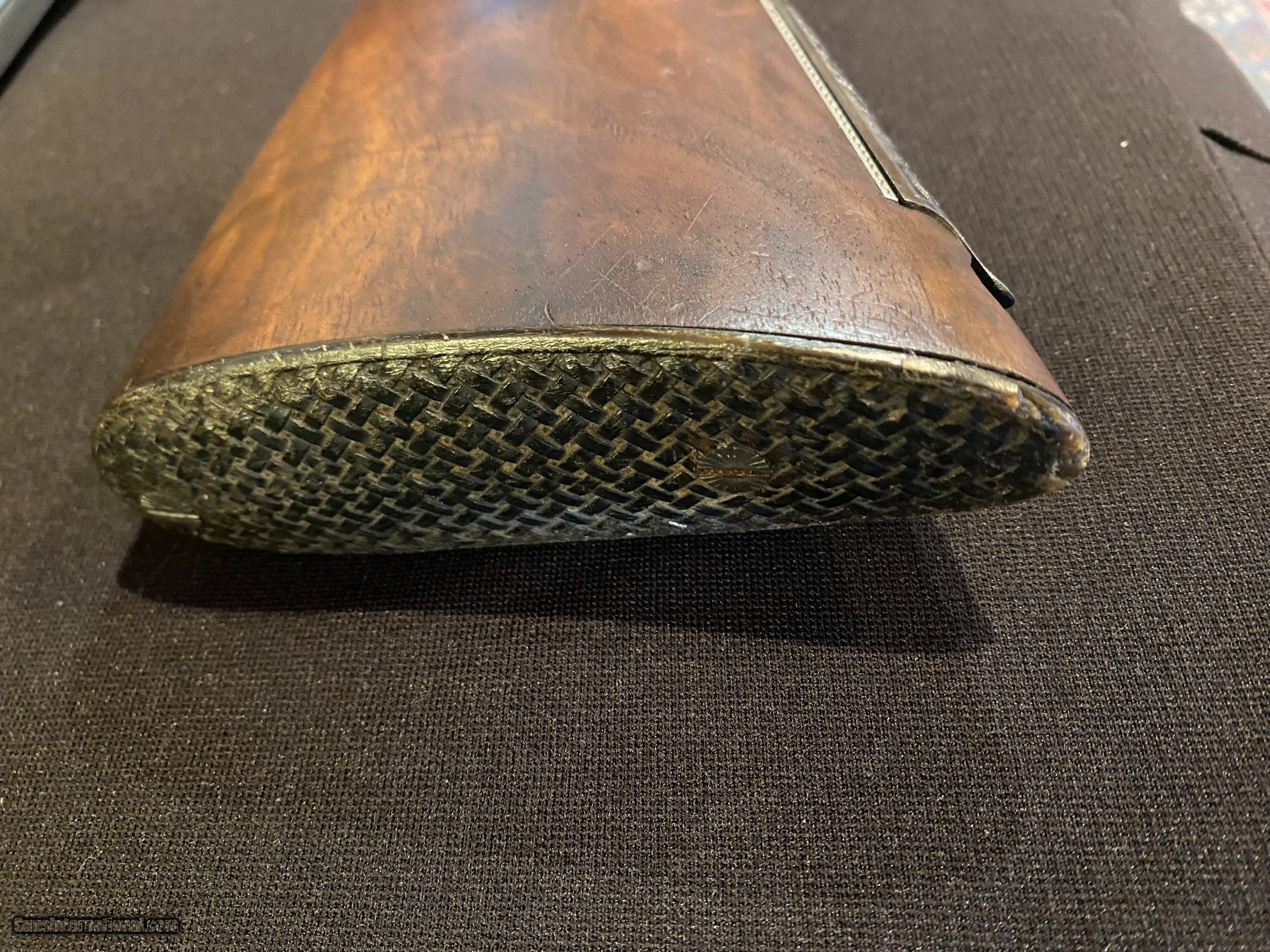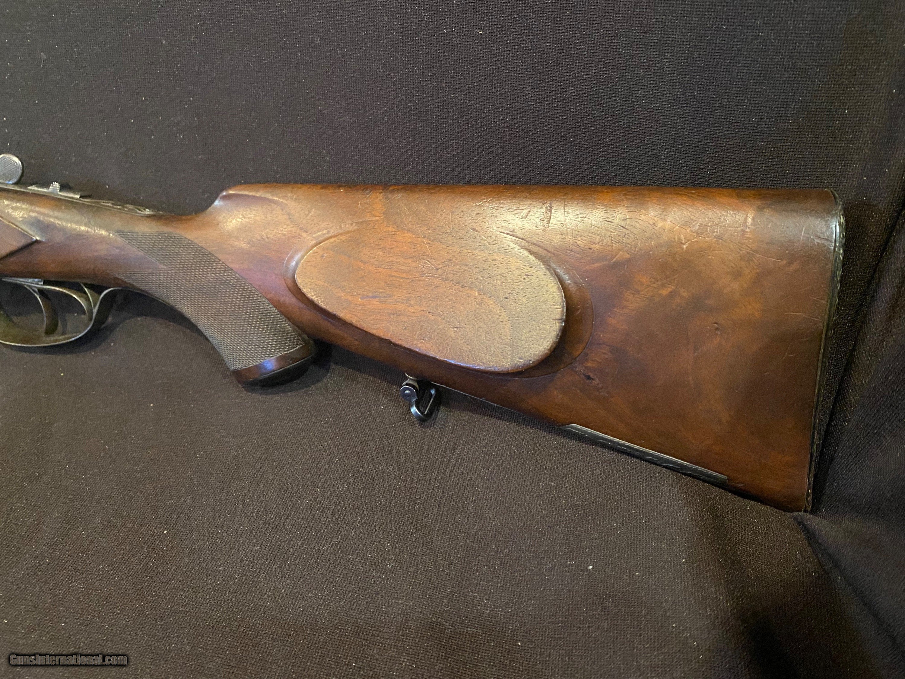 Description: Emil Kerner Suhl O/U Combination Gun. .28 Gauge/6.5X48R. 26 3/4" barrels (excellent bores) Full choke. 5 lbs 12 ounces. One standing one folding rear sight. Game Scene Engraved. Cartridge Trap. Cocking indicators. Steel TG. Checkered Walnut stock w/ shadow line cheek piece. 13.5" length of pull to horn butt plate and grip cap. Nitro proofed. Front set trigger. Extractors. Functions correctly. Very unusual action (refer to photos). Tight and on face. Shows numerous handling marks and several small chips to the fore end edge otherwise very good original condition. Includes reloading dies and 50 handloads. Very accurate. Rare small bore! SOLD Curio/Relic: Yes Rifle Caliber: 6.5x48mmR Shotgun Gauge: 28 Gauge Manufacturer: Emil Kerner Serial Number: 10197 Condition: VG |
