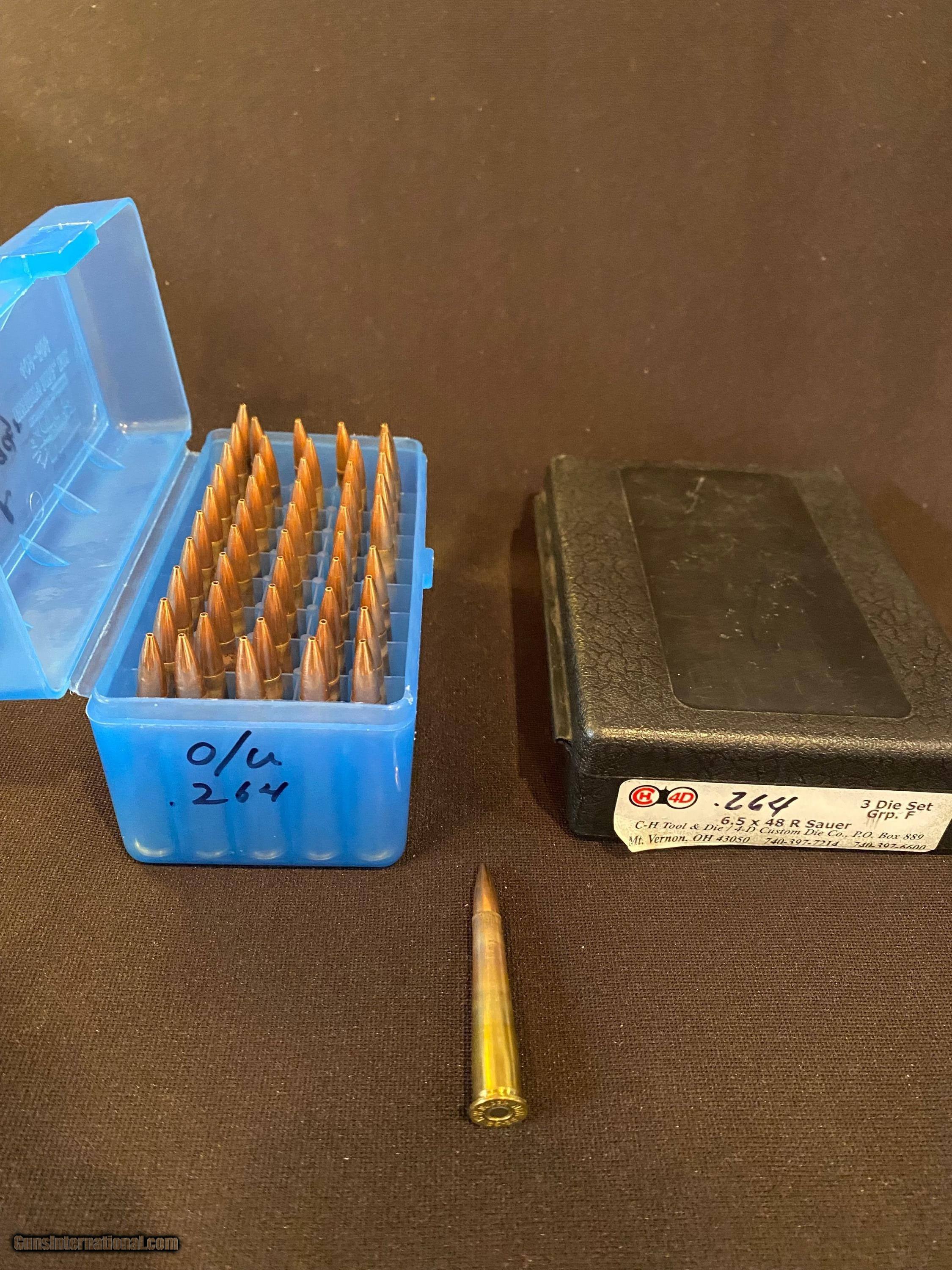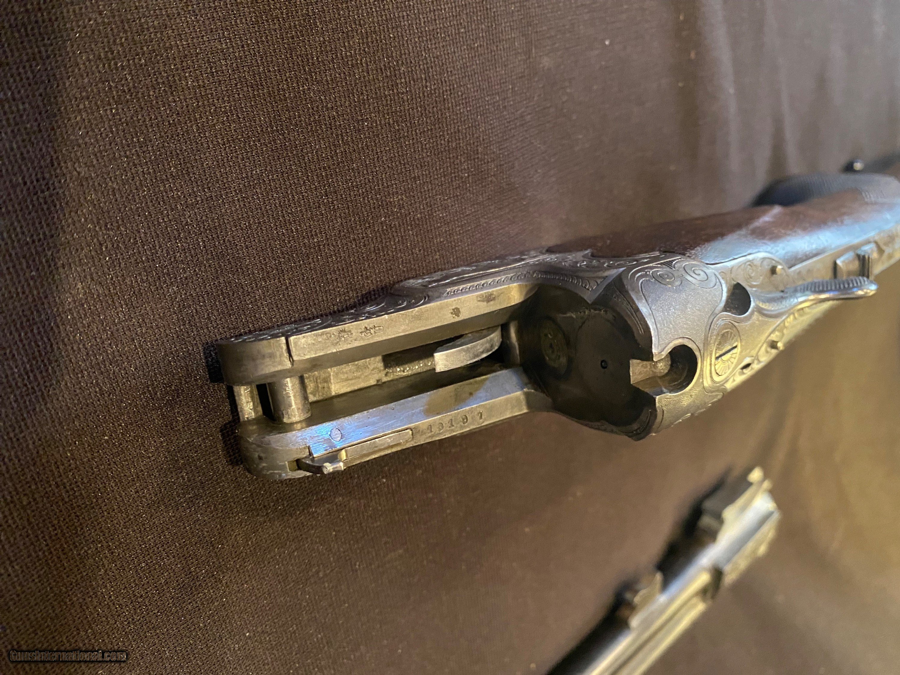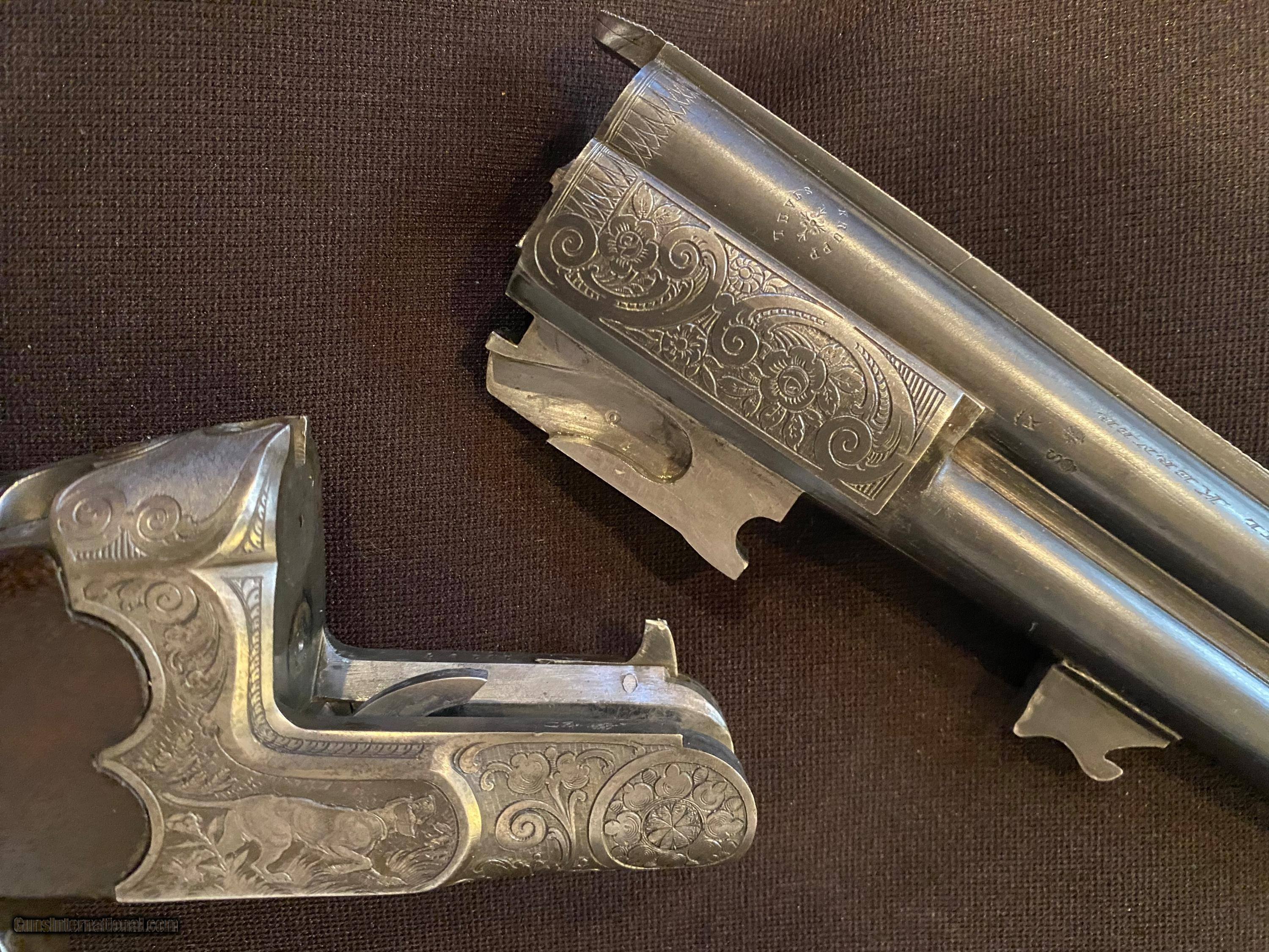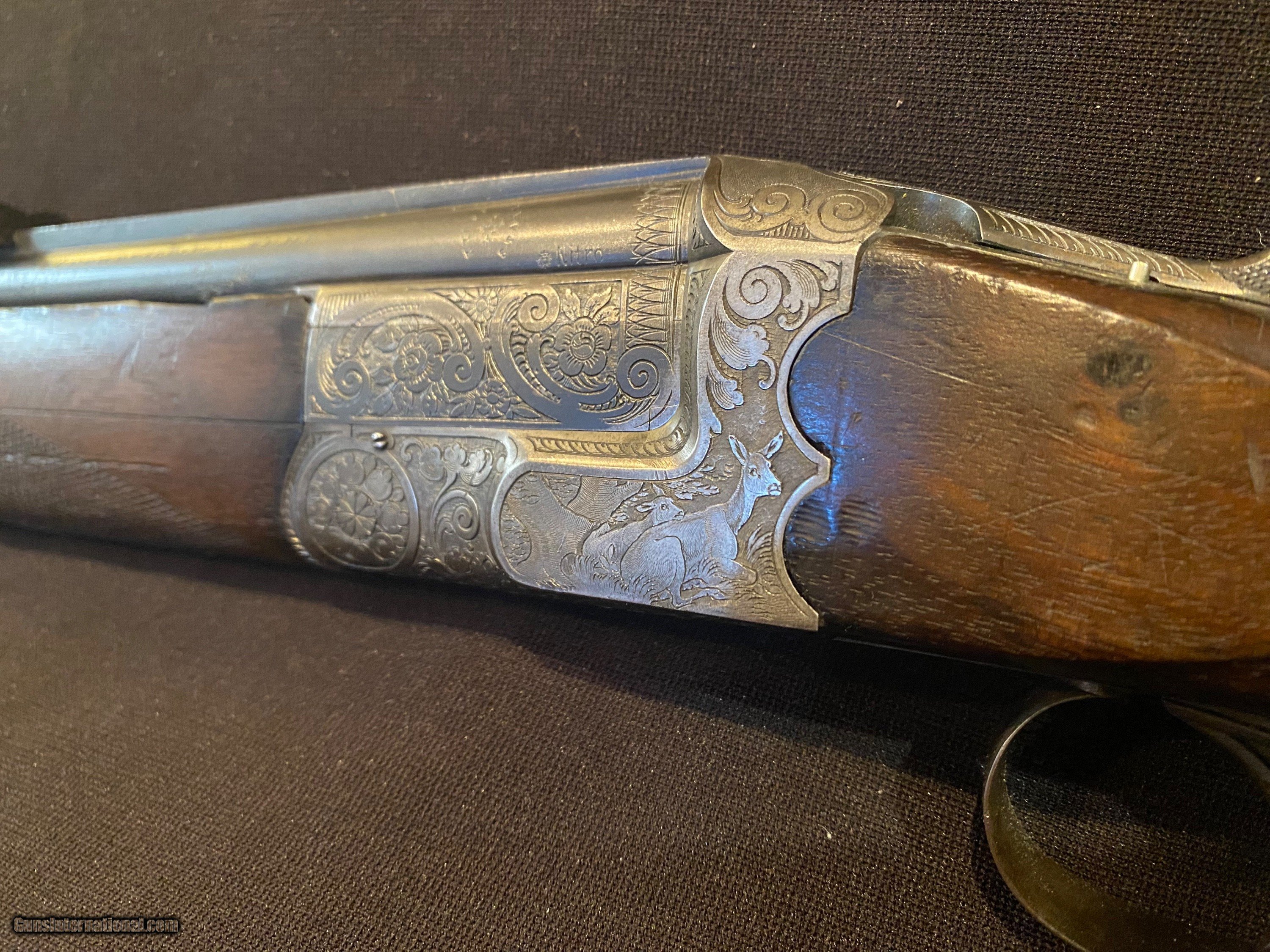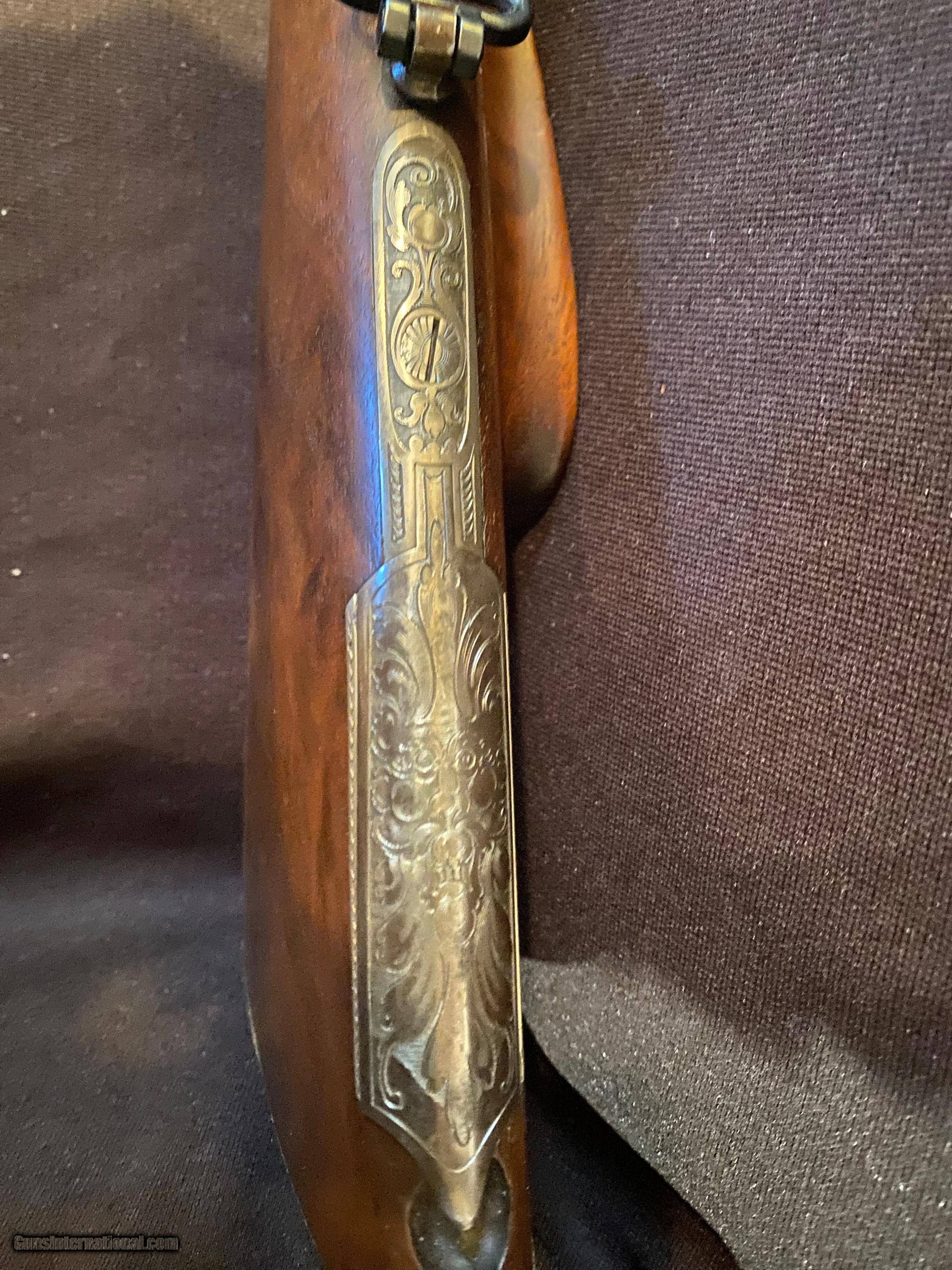 Description: Emil Kerner Suhl O/U Combination Gun. .28 Gauge/6.5X48R. 26 3/4" barrels (excellent bores) Full choke. 5 lbs 12 ounces. One standing one folding rear sight. Game Scene Engraved. Cartridge Trap. Cocking indicators. Steel TG. Checkered Walnut stock w/ shadow line cheek piece. 13.5" length of pull to horn butt plate and grip cap. Nitro proofed. Front set trigger. Extractors. Functions correctly. Very unusual action (refer to photos). Tight and on face. Shows numerous handling marks and several small chips to the fore end edge otherwise very good original condition. Includes reloading dies and 50 handloads. Very accurate. Rare small bore! SOLD Curio/Relic: Yes Rifle Caliber: 6.5x48mmR Shotgun Gauge: 28 Gauge Manufacturer: Emil Kerner Serial Number: 10197 Condition: VG |