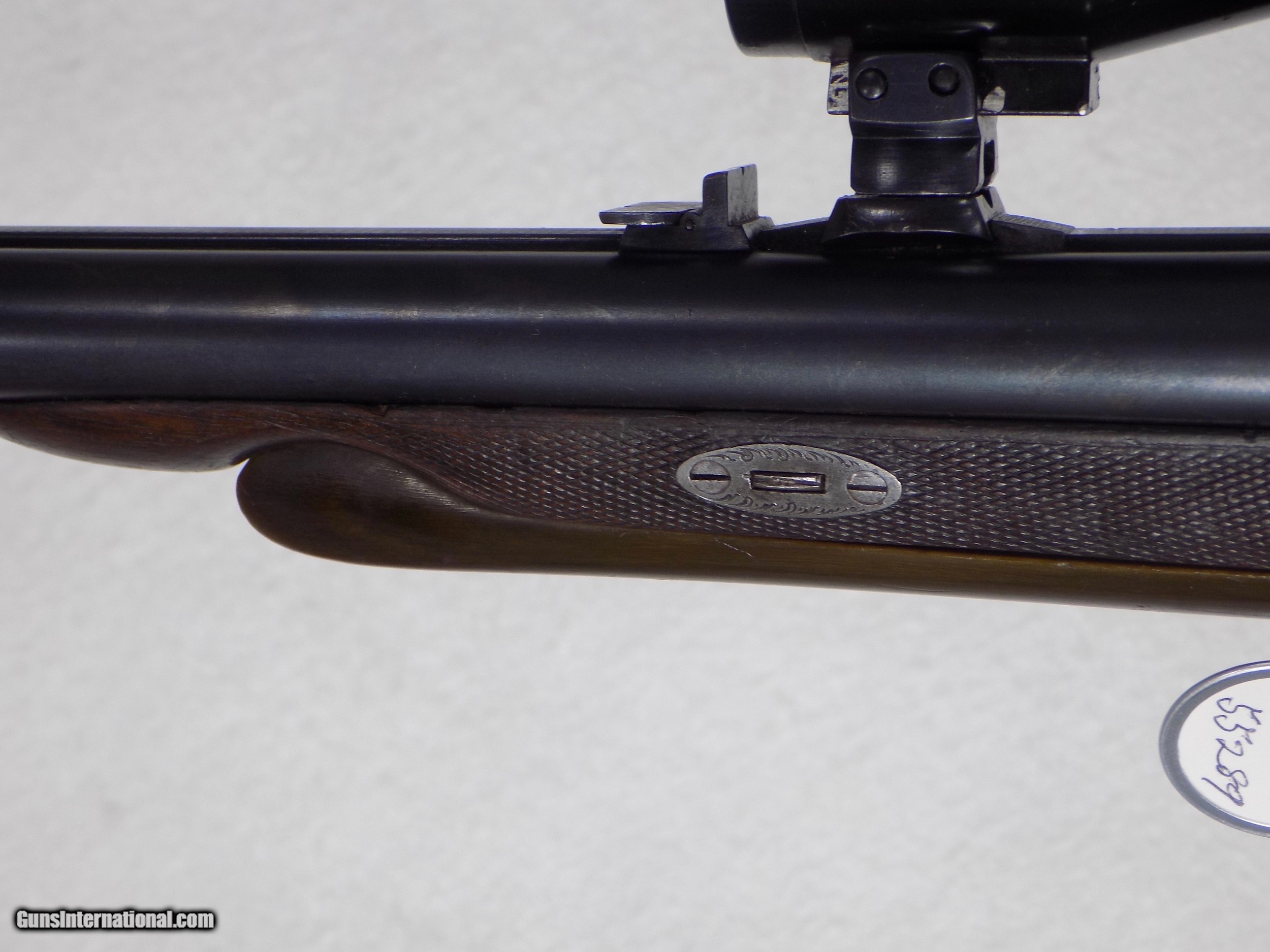 Description: #1081A ENGRAVED GERMAN DOUBLE COMBINATION GUN, 25-35 X 20 ga., 27” bbls., side by side rifle, shotgun action, buttplate, locks & cartridge trap all engraved in tight scroll pattern, set trigger, horn release lever & PG, sling swivels, checkered cheekrest stock & forend, cartridge trap in bottom of stock, folding 2 position rear sight, ramp front, 4X German scope, double claw mounts, exc. optics, fancy burl wood, exc. condition with 98% blue on bbls., faded casehardening on locks & action, exc. bores. $1750 SOLD Antique: Yes |