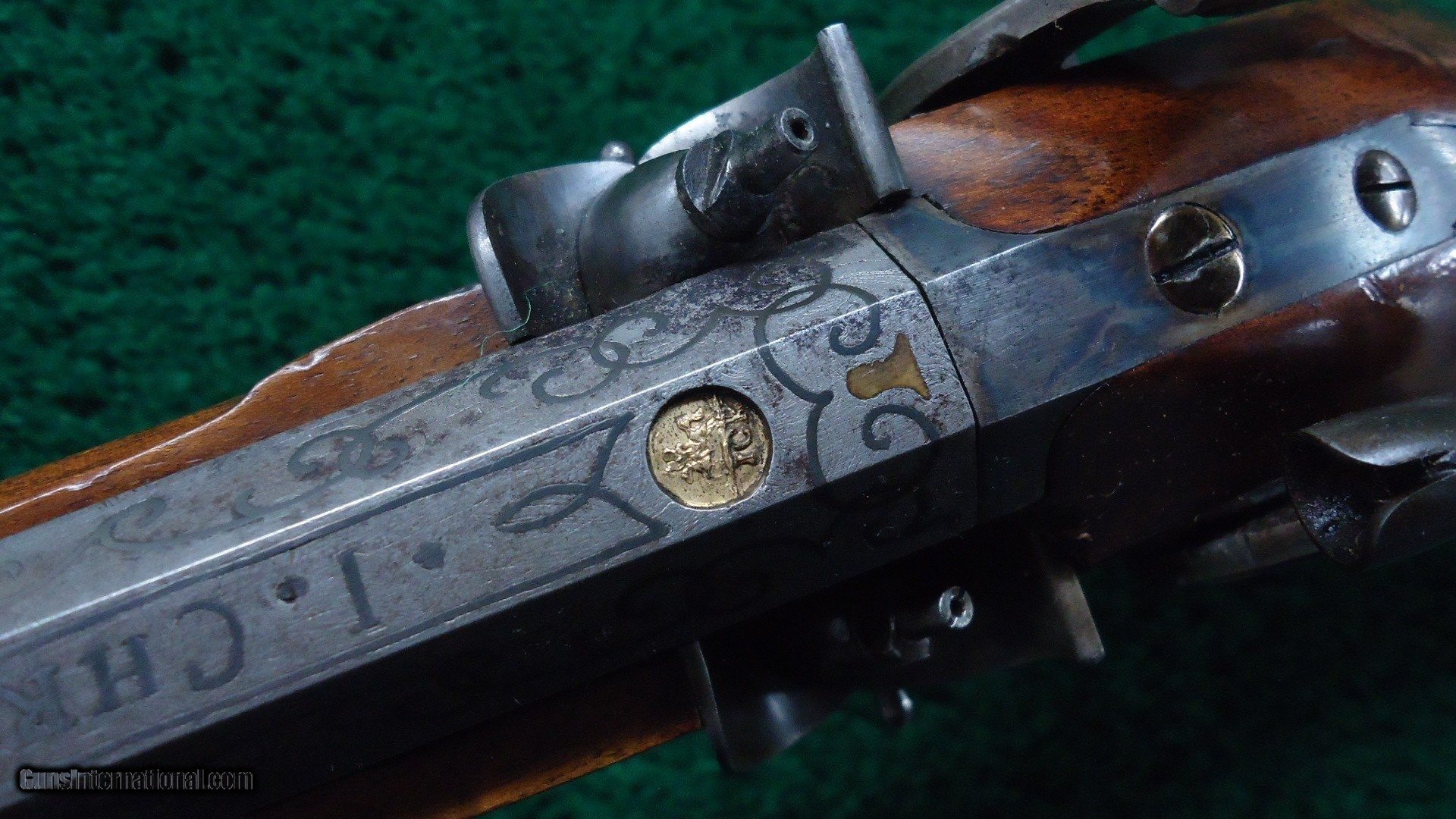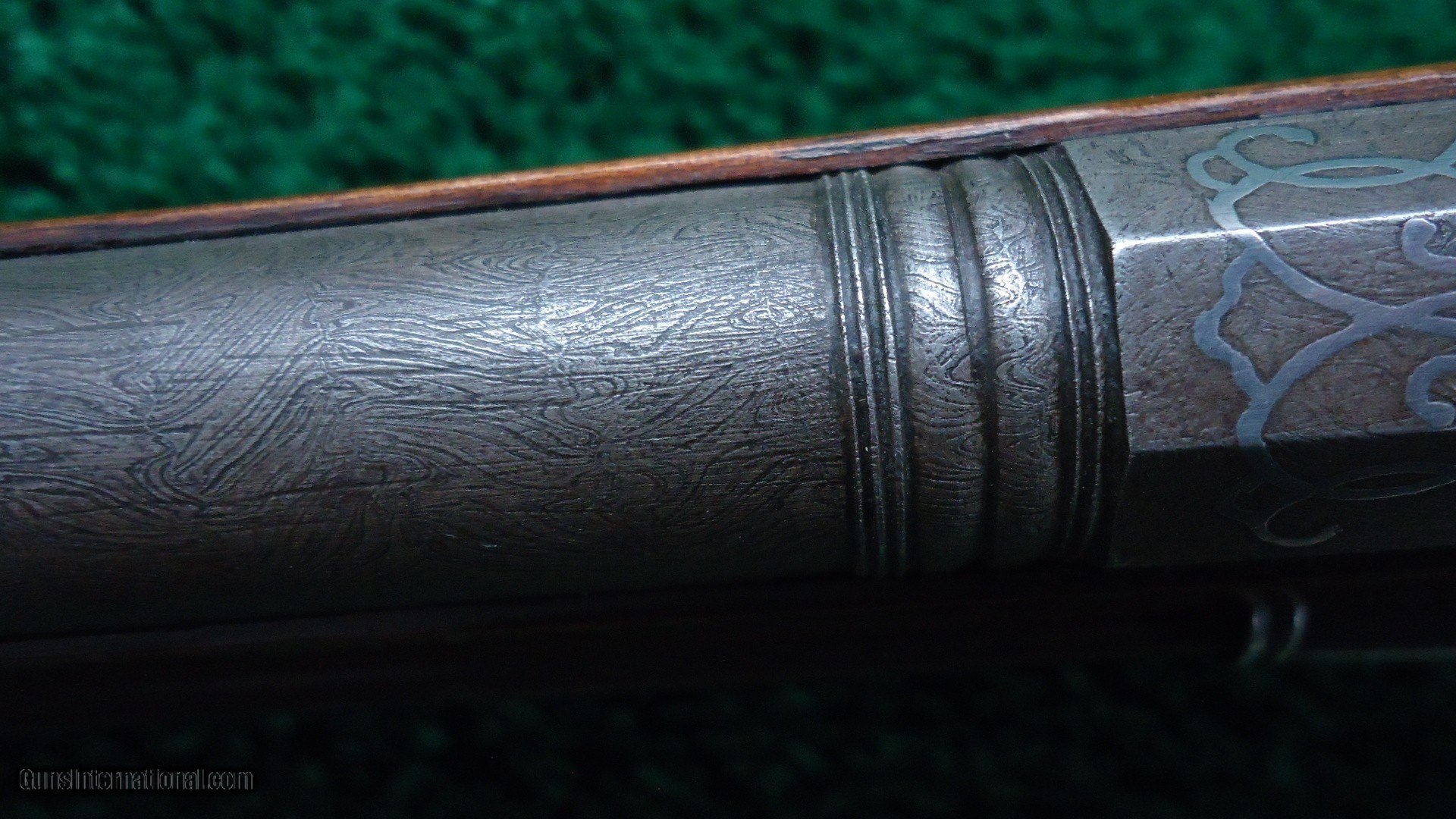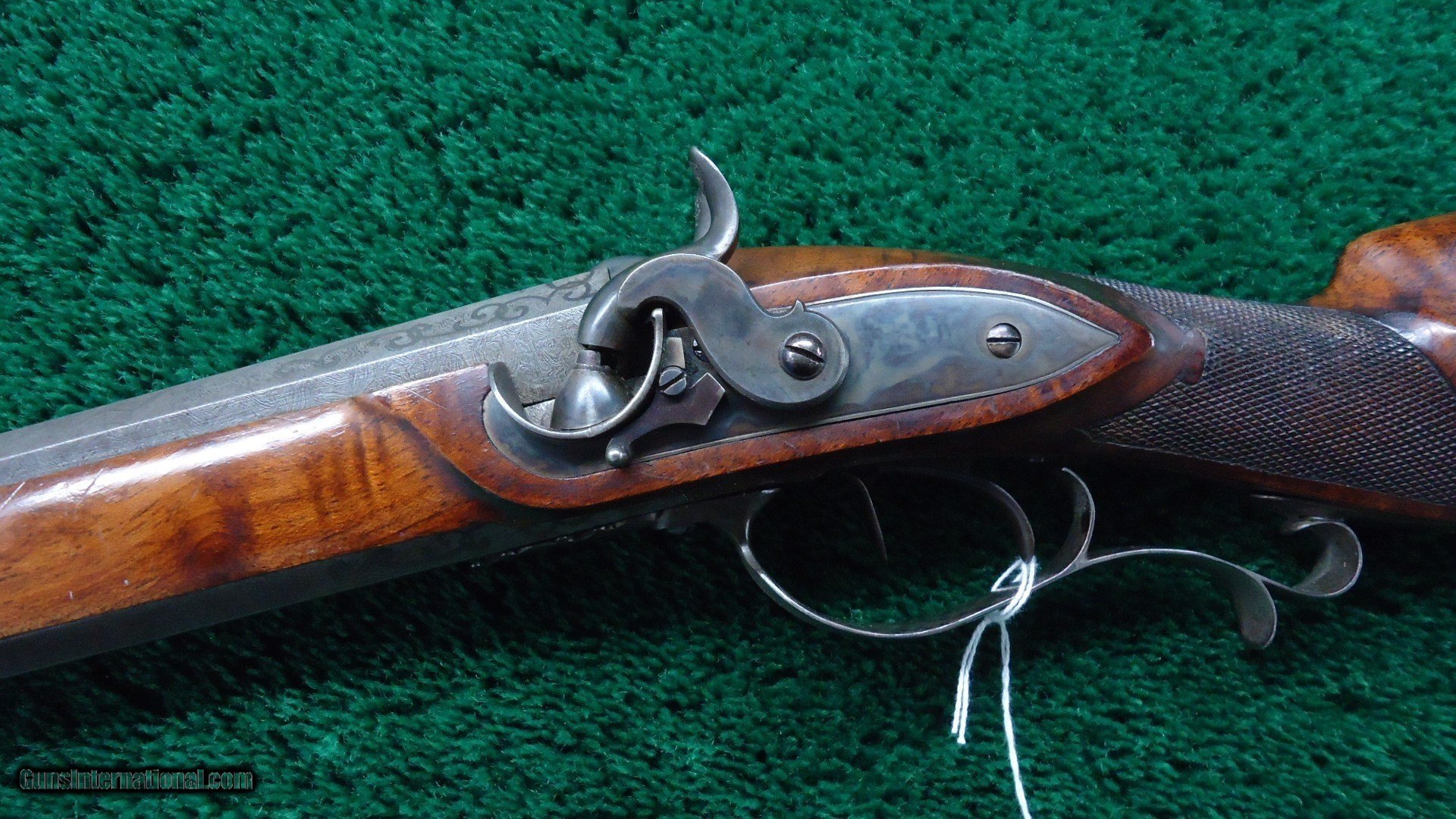 Description: FANTASTIC SILVER MOUNTED PERCUSSION COMBINATION GUN BY KUCHENREUTER PRICE REDUCED Description: This gun has a couple dozen silver inlays. Trigger guard is silver as is the buttplate. Both upper and lower barrels have silver inlays as well as the name "Kuchenreuter". Bores are 52 caliber rifle over 58 smoothbore. 30 inch Rifle barrel is full octagon and shotgun barrel is half octagon. Sights include silver blade front sight and flat top rear sight. Lock plates are super imposed over each other. Condition is great overall. Hammers have most all original case colors. Wood is excellent with most original varnish and sharp checkering. This is a very fancy ornate gun with a royal crown on the top of the wrist. You don't find craftsmen like this anymore. Just a fantastic gun! PRICE REDUCED!!!! SOLD |
