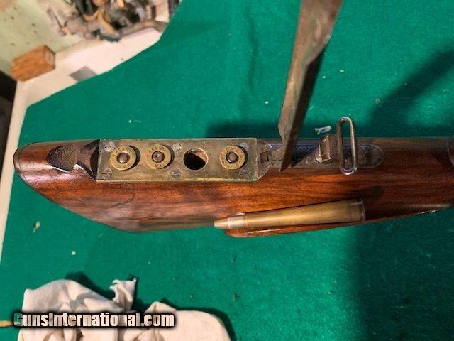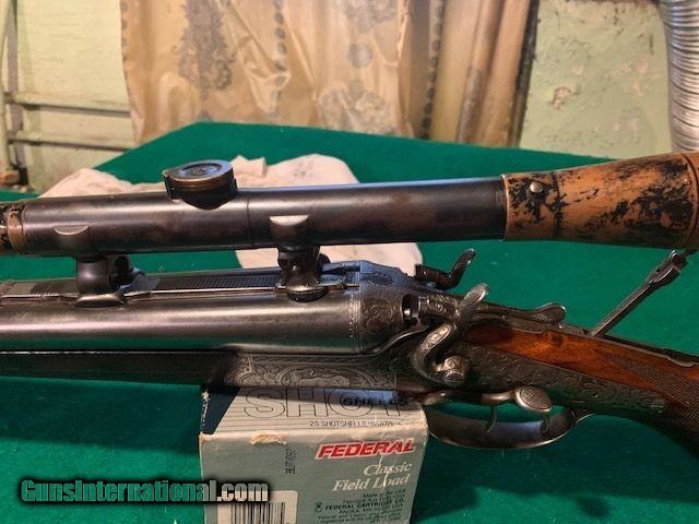 Description: German Drilling - German made by Sauer, Emil V. Nordheim, 16GA and 6.5 x58 Sauer. Chambers 2 9/16, 26.5 barrels, F&F. front set trigger rifle. LOP 13 1/4 to 14 to the toe. Original Sauer butt plate. Bores are in perfect condition for both rifle and shotgun. Tight action. Steel barrels with original scope. 70% blue. Very good condition. $1950.00 plus shipping. For more information call Rick at 973-478-5066. SOLD |