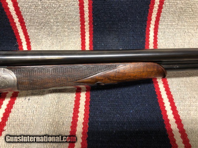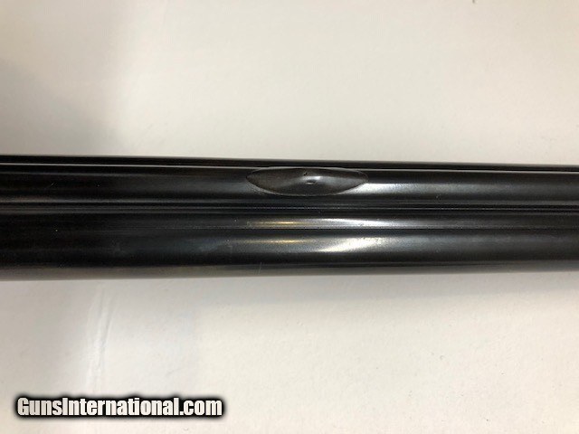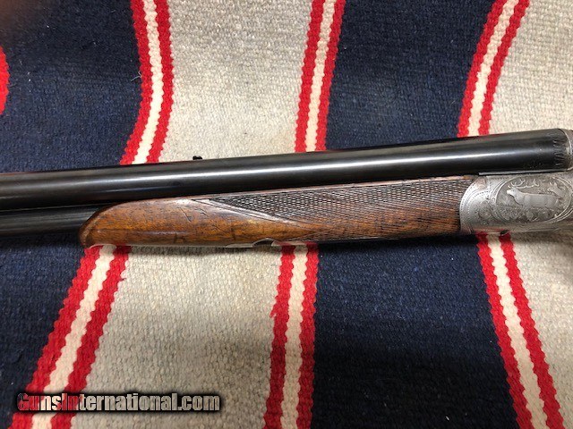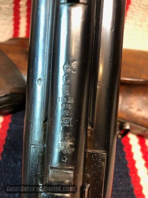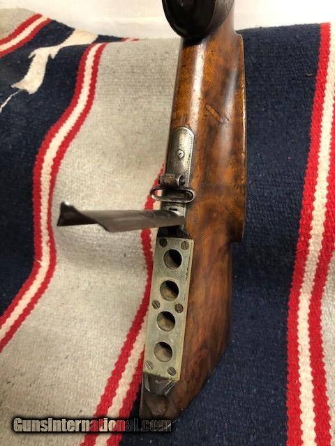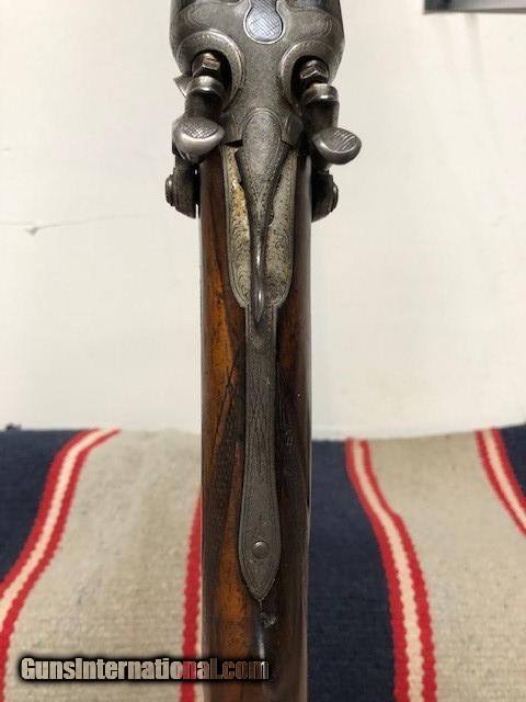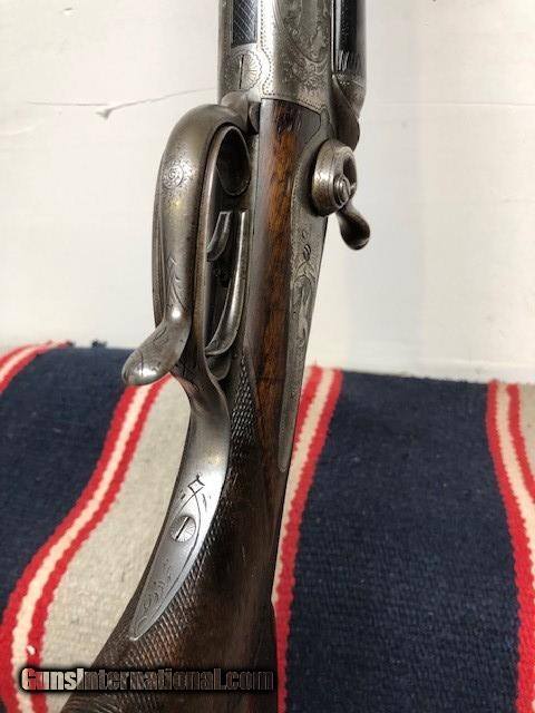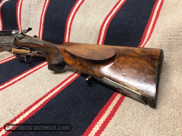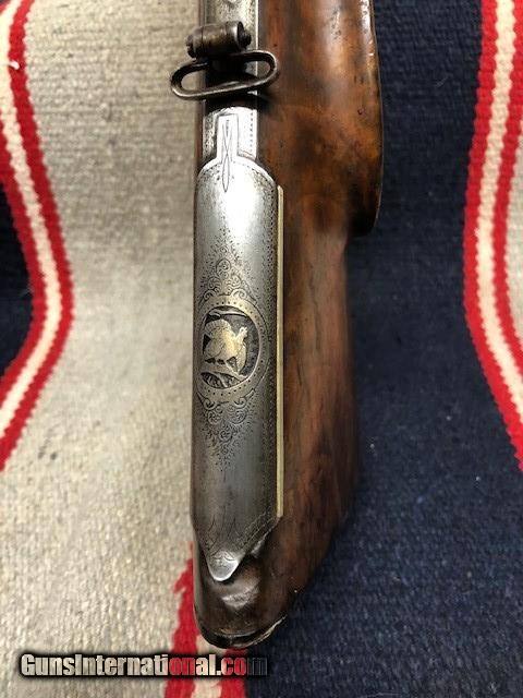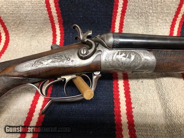 Description: Austrian/German (proofs from both) Guild Drilling hammer gun. (Circa 1900) Extensively engraved including game scenes. Gun is solid and tight. Wood is solid with no cracks. Pistol grip checkering shows considerable wear. Horn buttplate and grip cap. 271/2" Krupp Stahl nitro-proofed barrels which have been reblued. Shotgun bores are rough with some pitting while rifle bore is fairly bright with good crisp rifling. Front swivel base was plugged and rounded off I assume when reblued. Top tang lever raises rear sight . Barrel break lever under trigger guard. Extra shell carrier built into buttstock with engraved cover plate. Great looking solid gun. Thanks. SOLD |