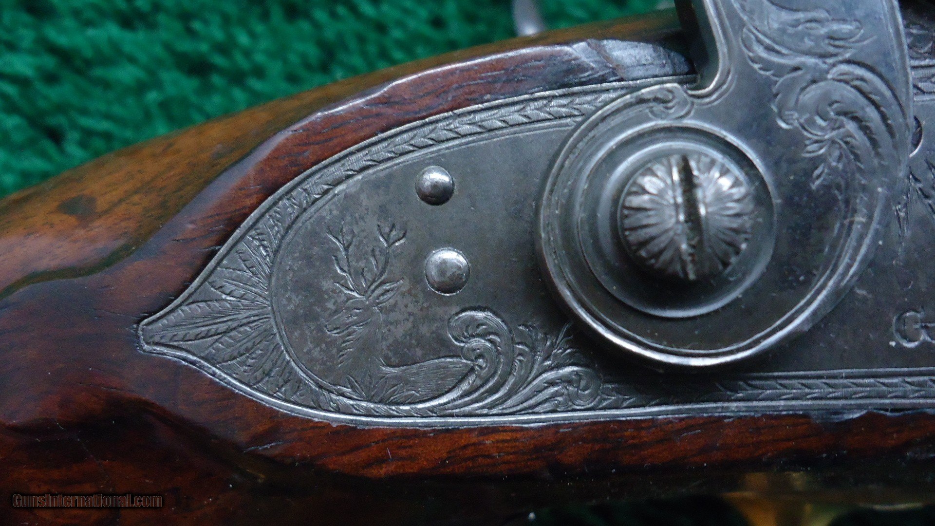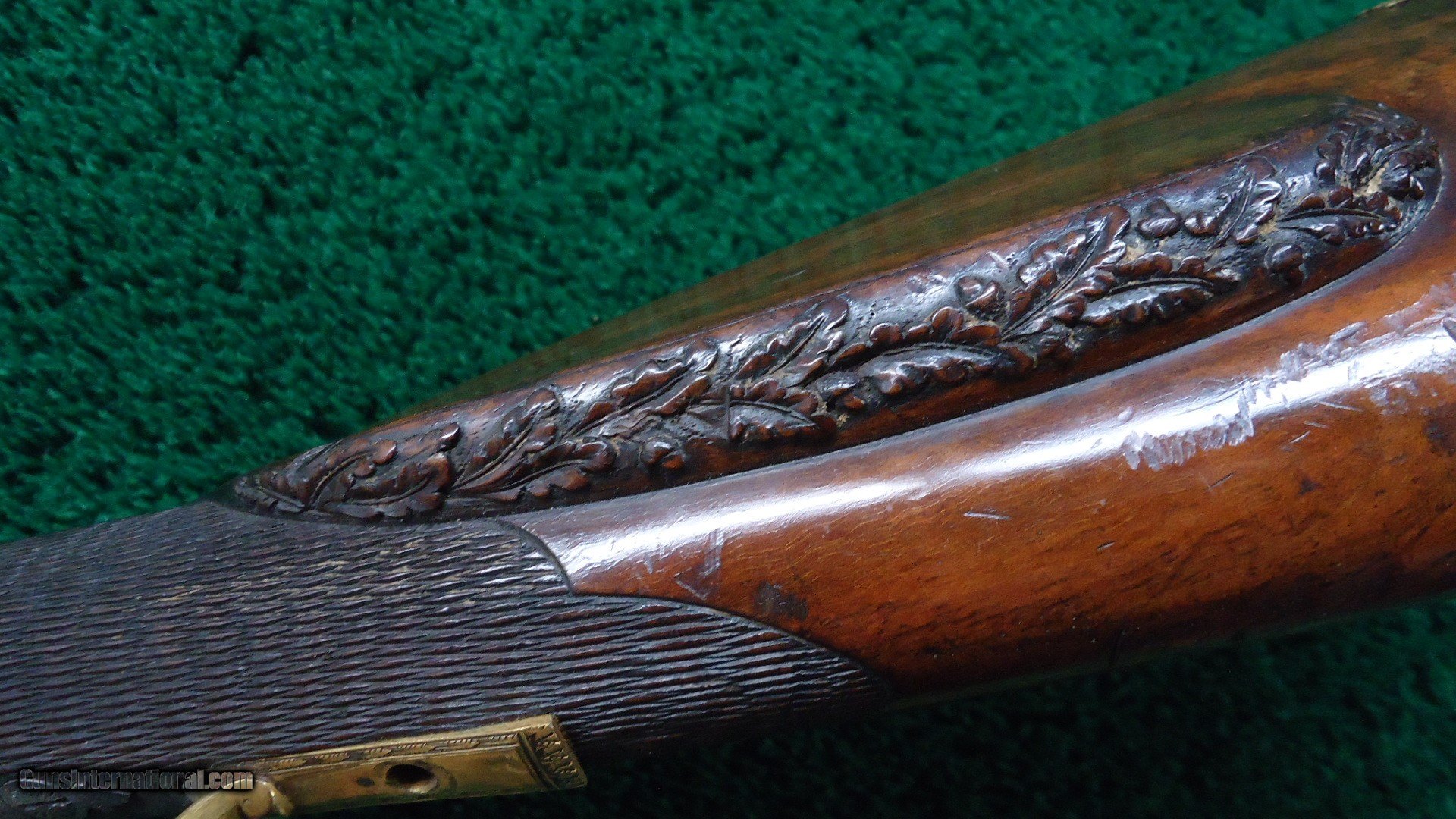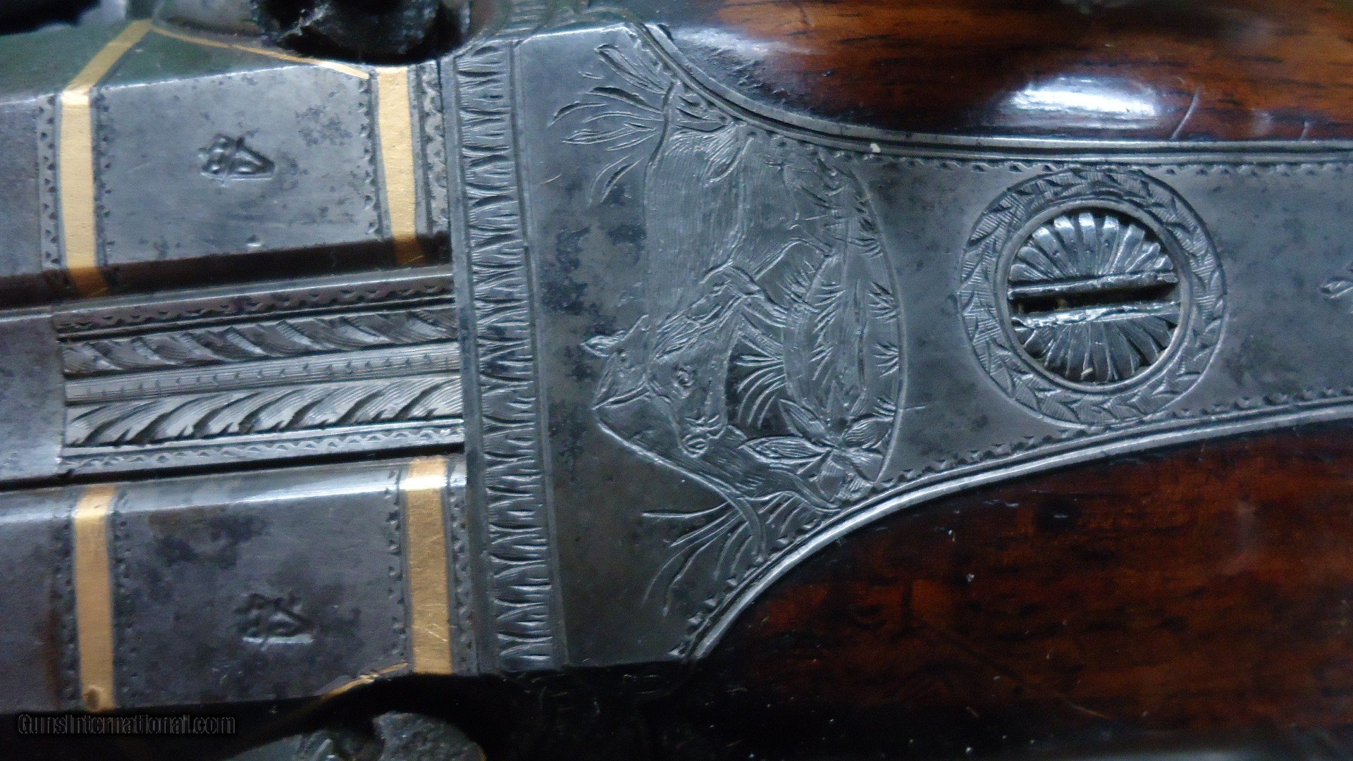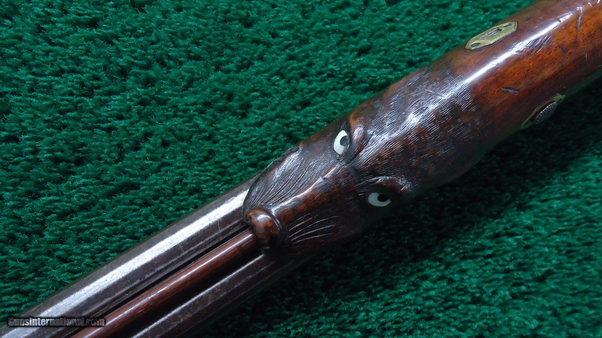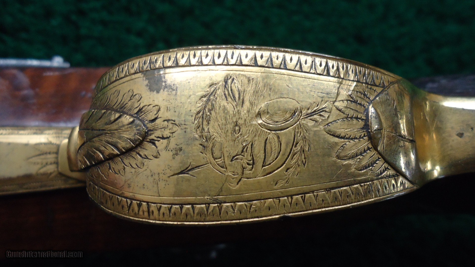 Description: An interesting gun. Wood has most original varnish with some dings and mars. Features a cheek piece that is elaborately carved all around it. Nicely checkered wrist. There is a wolf's head with Mother of Pearl eyes where the ram rod goes into the forearm. The buttplate and trigger guard are gold gilded brass. Side plates have turned a gray color. 30 inch part octagon barrels. Very good bores that are about 16 gauge. Action has a pivoting safety that slides over the nipples. Right lock has had some work done. This good looking gun would make quite the conversation piece. Leroy Merz Antique Firearms specializes in antique and vintage Winchesters and other fine American firearms. Since 1965 Mr. Merz has taken part in the world of firearms and has been a contributor to many well known reference books. We have hundreds of additional guns in every price range at our home online. Search for Merz Antiques in google. SOLD Antique: Yes |
