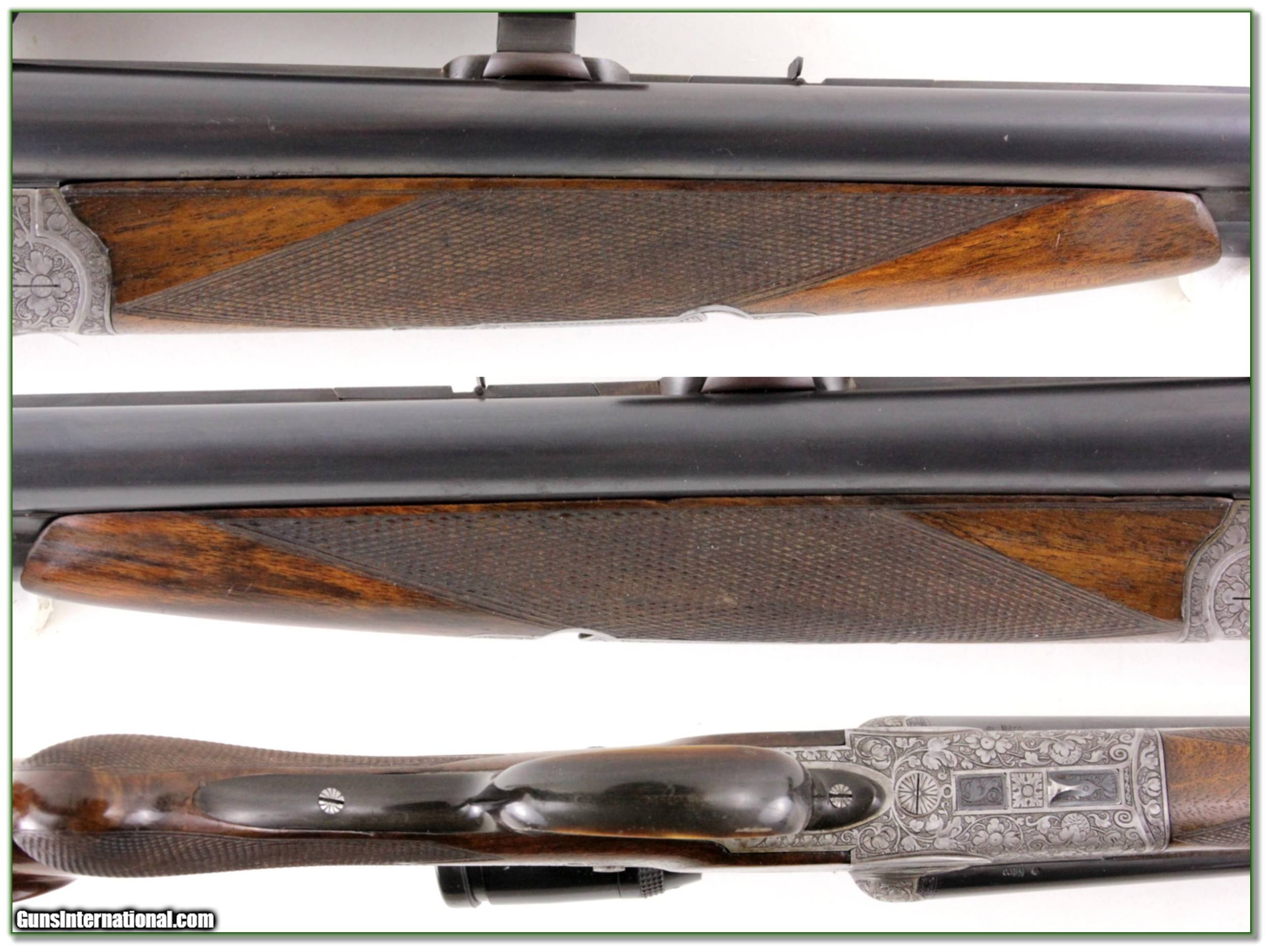 Description: Collectors, this is an excellent condition German Drilling in 16 x 16 x 8x57 caliber. It has full coverage hand engraved game scenes and comes with period German Zeiss scope. Dated to 1949 with beautiful wood and a 13.5 LOP over pad. I am selling this one on consignment and as such lay-a-way can’t be used. It does of course have the standard 3-day inspection. Shipping with insurance is $59. Please email me with any questions or larger pictures. (Consign your quality firearms with Shooting Investments for only 12%! Let me know if you have any you would like to sell!) 19-0068 Payment: Payment is by Money Order, Cashiers Check or Personal Check. I can now also accept MasterCard and Visa with a 3% convenience fee. PayPal can be used for some items but never firearms. Please let us know if you would like to pay via PayPal. Shipping: The shipping charge will be listed in each description. It is $39 for most long guns and $29 for most handguns. Some heavy guns or those insured for over $2000 will be higher. Shipments to Alaska and Hawaii are higher because air shipment is required. Most firearms are shipped on Tuesday and Thursday and usually in 5 days of receipt of payment. We package all shipments carefully and insure them. For long guns you can purchase a new Plano case for $19. They now cost us $22 when buying 100 at a time. Optics are shipped Priority Mail and most other non-firearm shipments are shipped First Class. Returns: Our return policy is simple. If for any reason you are not pleased with your purchase, you may return your item for a full refund of purchase price. Ammunition cannot be returned. It is important to us that you are happy. Guns cannot be fired or dissembled before returning them and they must be returned in the same condition as received. Notification of a return must occur with-in 3 days of receipt at your dealer. Shipping, convenience and dealer fees are not refundable and are the responsibility of the buyer. Lay-a-way: If needed, we offer a 60 day lay-a-way option on most firearms. It is 1/3 now, 1/3 in 30 days and 1/3 in 60 days. Lay-a-way firearm sales are final and if not completed the first payment cannot be returned. Consigning your firearms with Shooting Investments: We will help you get top dollar for your firearms. While most local guns shops charge 20% or more, our fee is only 12% with a minimum of $75. At your local gun shop it might take months to sell. Selling on-line provides instant access to thousands of interested buyers. You won’t find any other on-line dealer willing to sell your firearms for only 12% or listing every gun on 3 separate s. Selling through an House typically costs the seller 15% and the buyer an addition 15% (so 30%) and you have to wait several months to sell and longer to receive funds. If properly priced, we will sell your firearms in a few weeks. Send us an email or give us a call and we’ll explain how easy it is for you to get top dollar. Trading: Trading for use is really just buying your gun to re-sell. If you have a gun you want to trade, please email a picture and we will let you know what we can give or it. You will always get more if we sell it for you on consignment. Help for California Buyers: We are happy to ship to California. It is the buyer’s responsibility to make sure any item you buy is legal in your state. We are also happy to help with your purchase of a firearm from someone other than us. If you see a gun you would like to buy but the seller can’t or won’t ship to California they can ship to use and we’ll then ship it to your California dealer. The cost for this service is only $30 + shipping. Let us know if we can help! SOLD |