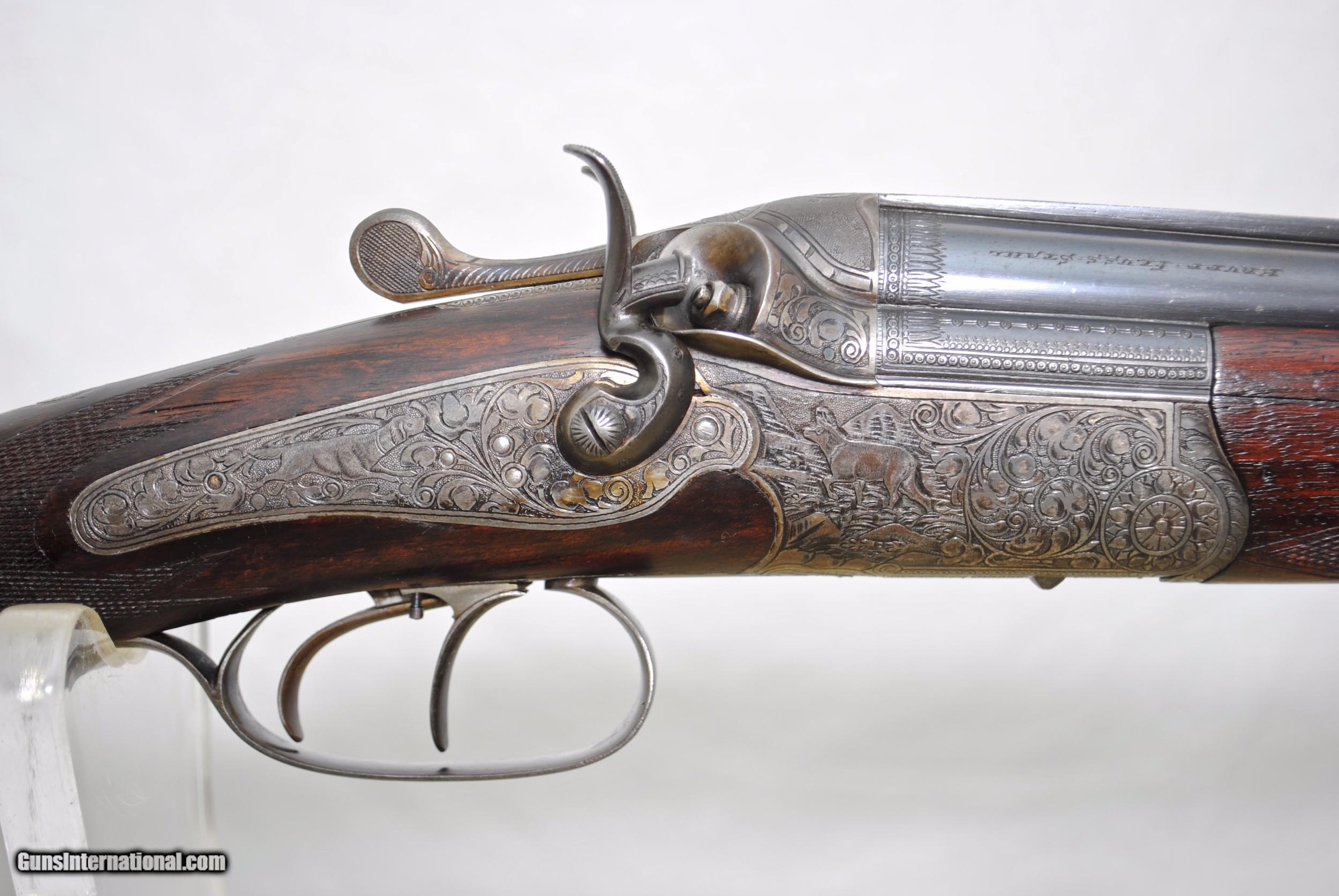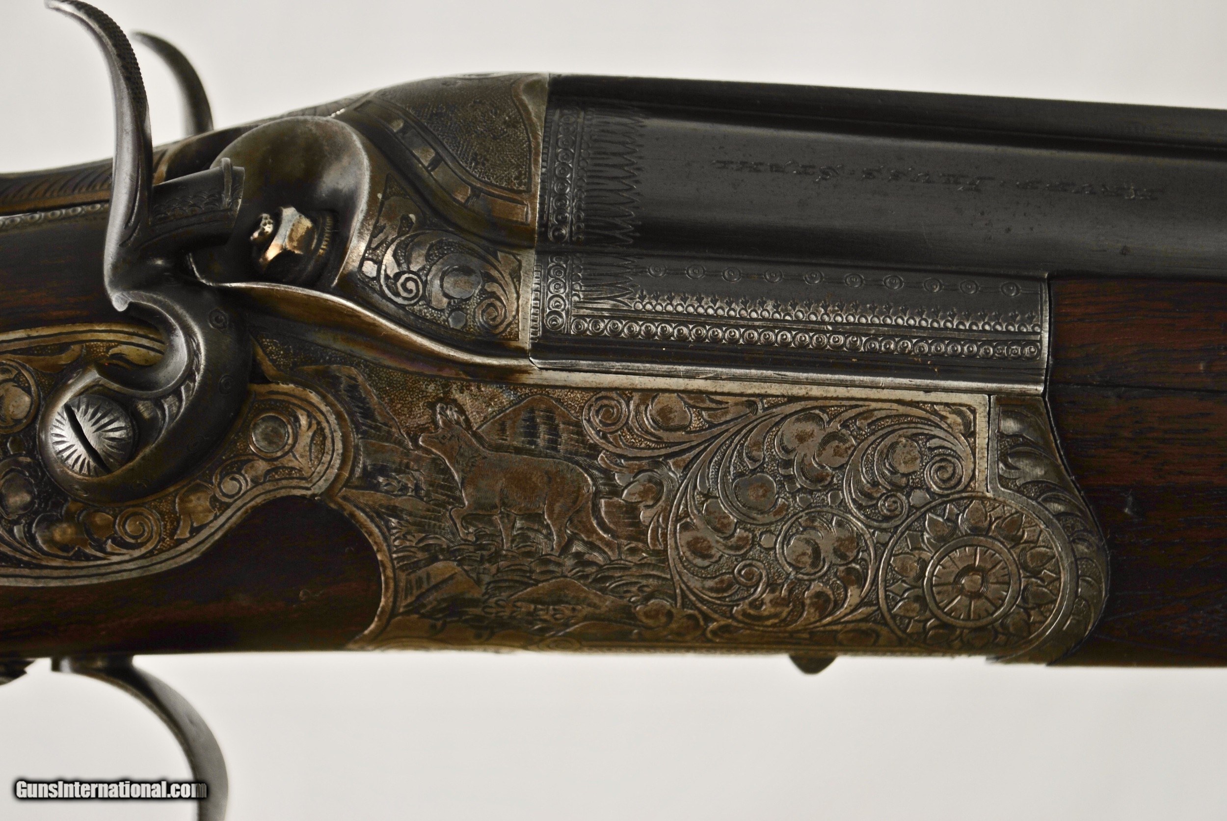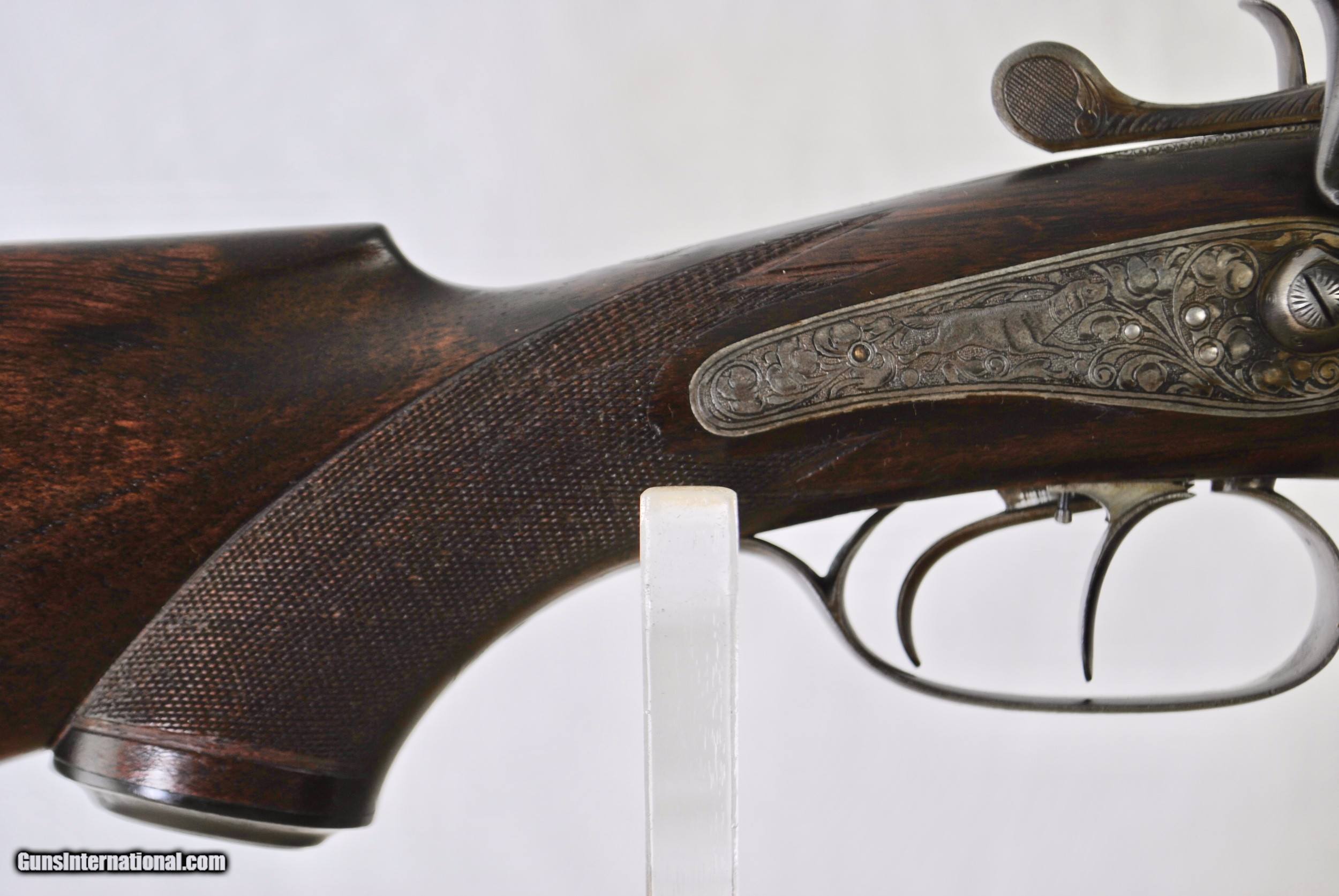 Description: Here is an high art Austrian OU Hammer Cape Gun in 16 Gauge over 6.5 x 70R Sauer. Highly game scene engraved - deep chiseled with scroll. No makers name (typically identified by two digit code). Perfect bores. Tight on face / no loose ribs / No cracks to wood. Rebounding hammers. Set trigger for rifle barrel. Excellent quality lock work on inside - mirror polished. Pop up rear tang peep sight. Two flip up rear sights - finely checkered and stamped 100 and 300. Chamber on shotgun measures slightly less than 2 3/4". Bore is .661 on shotgun with 38/1000 choke (Full). Barrels are 26 3/4". Weight is 6 LBS 3 3/8 OZ. Shipping is $50. For inquiries please call Guy - 407-721-3748 SOLD Curio/Relic: Yes |