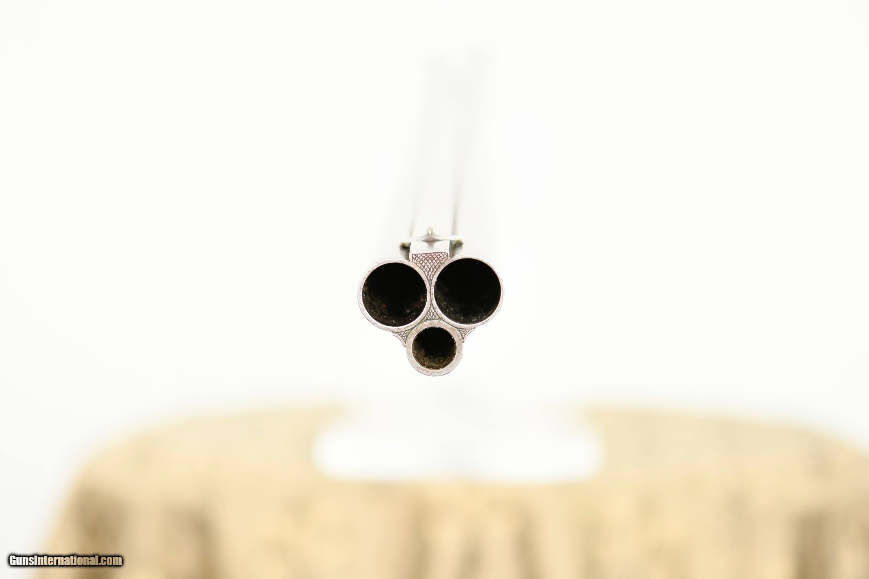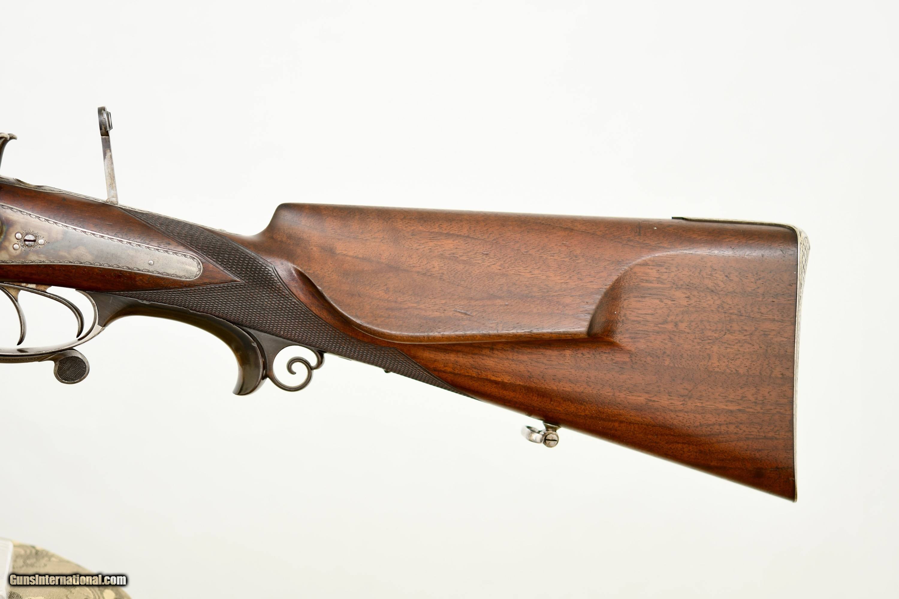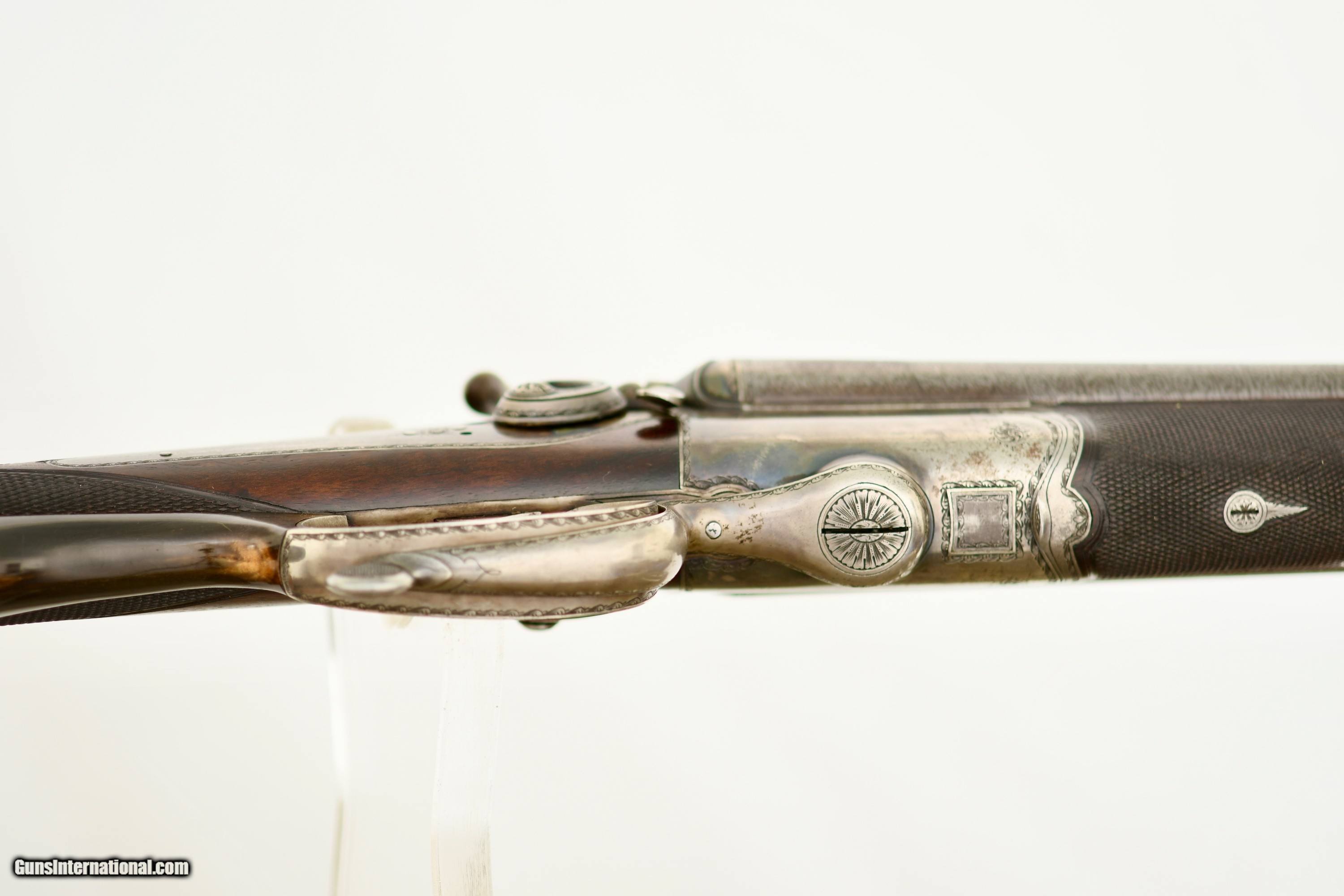 Description: Imperial German Hammer Drilling with Heraldic Crest Offered is a high-quality Oscar Sauer hammer drilling, manufactured in Strasburg (Imperial German, Alsace) circa the late 19th century. This is a bespoke, ordered sporting arm, retaining strong original finishes. This drilling is distinguished by the personal heraldic crest and initials of its original owner, engraved on the top tang. The drilling features Damascus shotgun barrels paired with a fluid steel rifle barrel, reflecting the period of German gun making when the best materials of each discipline were combined. The action is secured by a Jones underlever bolting system and fitted with rebounding hammers, offering both strength and refined handling. Notably, the top tang is engraved with a Germanic crowned crest depicting an armored arm holding a mason’s trowel, accompanied by gold-inlaid initials. This is a legitimate personal crest, not decorative engraving. This consistent with The German Empire ennobling families of technical or civil origin, particularly those associated with engineering or state commissioned construction. Such owner-specific heraldic engraving was commonly reserved for custom embellishments by upper-class sportsmen and adds meaningful historical and collector interest. An interesting lever-actuated rifle barrel selector is fitted, along with dual opposing flip-up rear sights for the rifle barrel. The front trigger is a set trigger, fully functional, allowing for precise rifle shooting. Specifications & Features