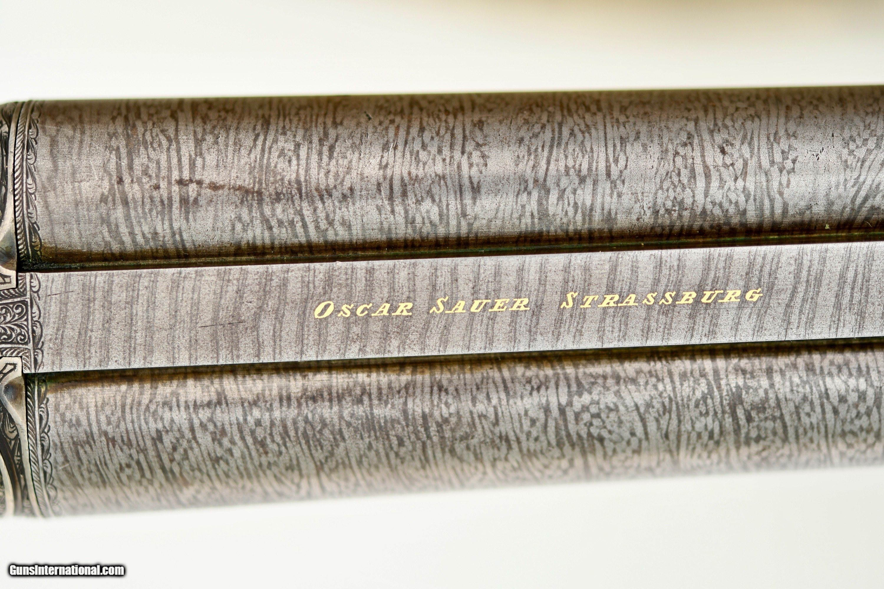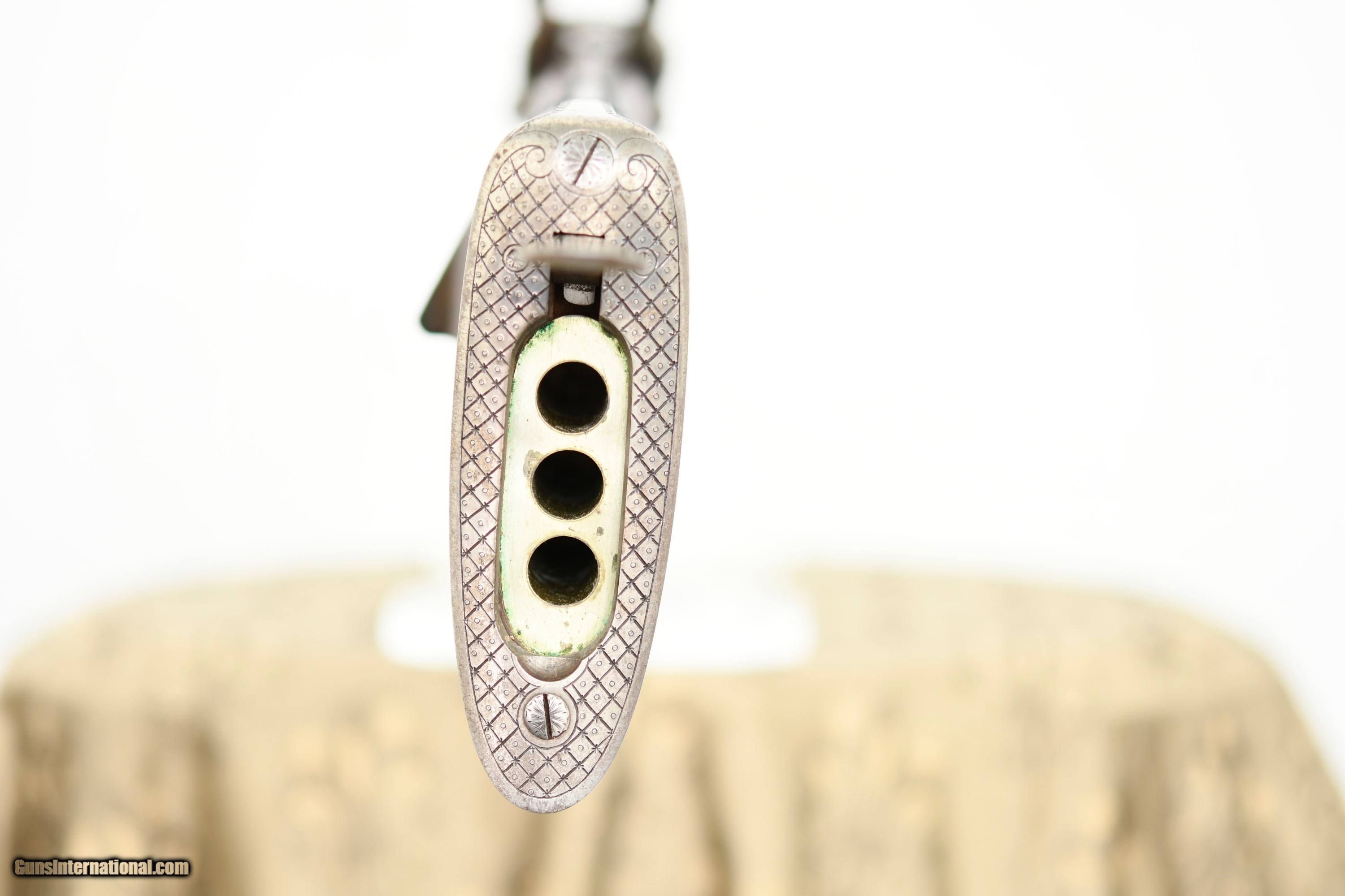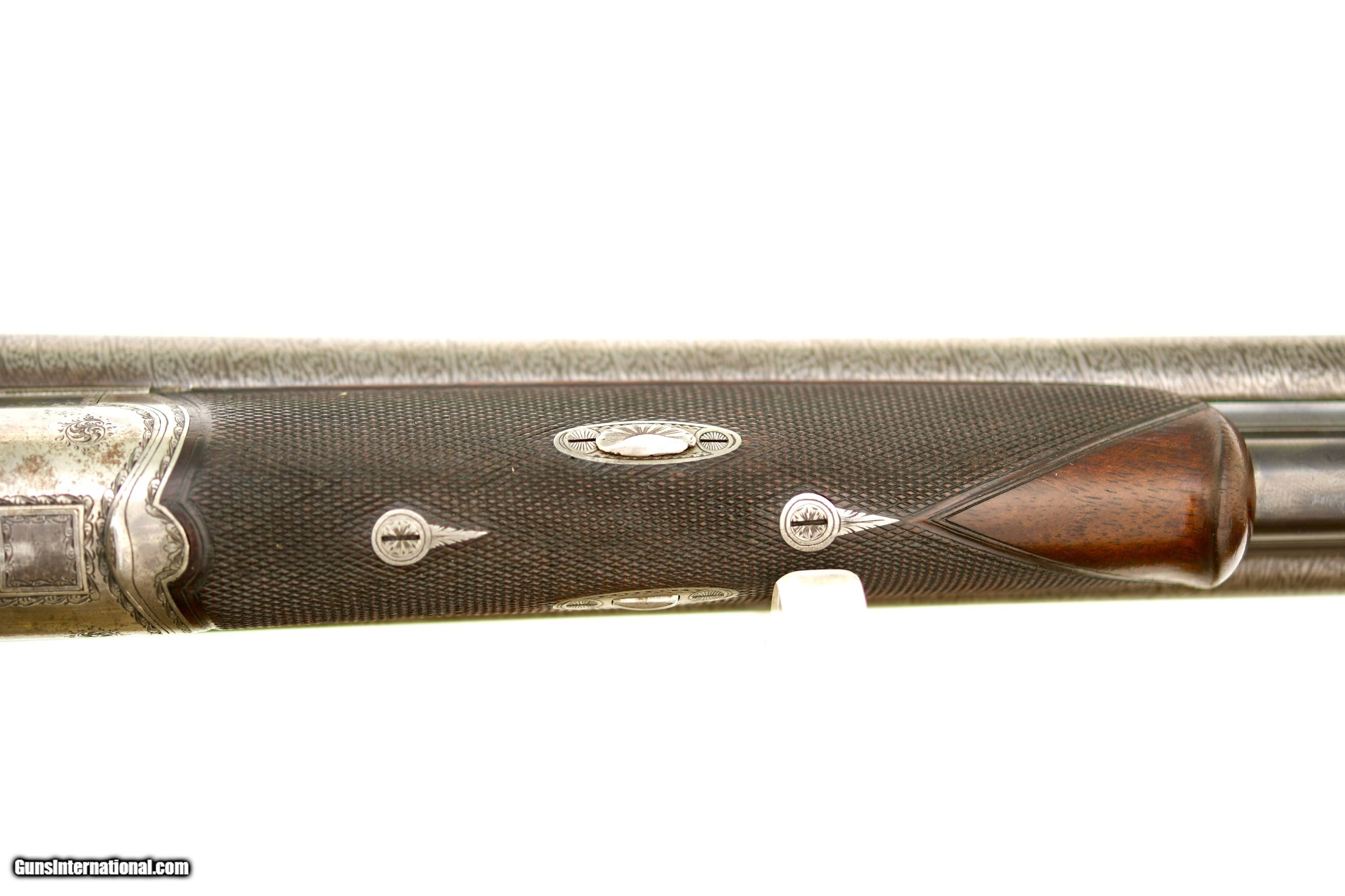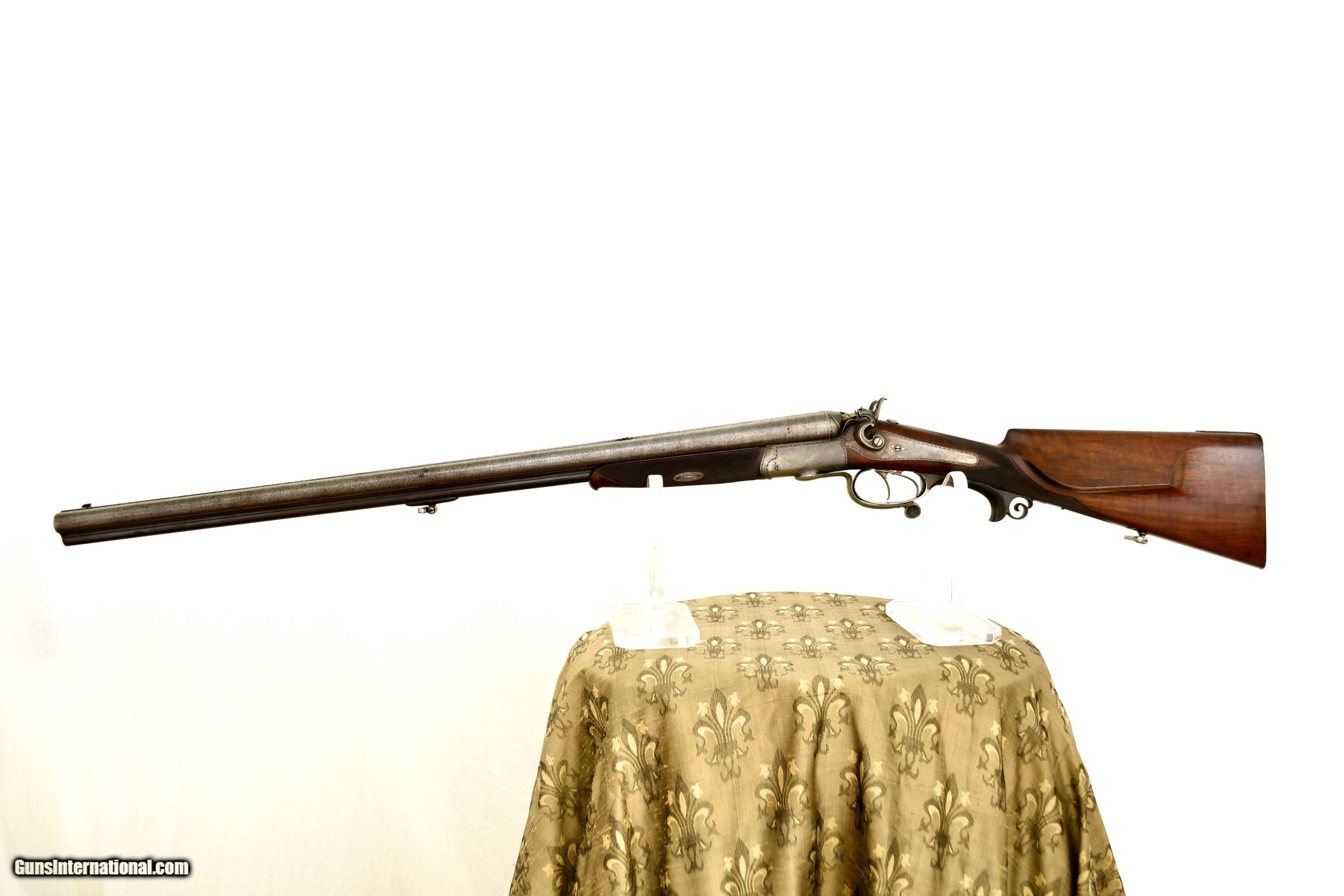 Description: Imperial German Hammer Drilling with Heraldic Crest Offered is a high-quality Oscar Sauer hammer drilling, manufactured in Strasburg (Imperial German, Alsace) circa the late 19th century. This is a bespoke, ordered sporting arm, retaining strong original finishes. This drilling is distinguished by the personal heraldic crest and initials of its original owner, engraved on the top tang. The drilling features Damascus shotgun barrels paired with a fluid steel rifle barrel, reflecting the period of German gun making when the best materials of each discipline were combined. The action is secured by a Jones underlever bolting system and fitted with rebounding hammers, offering both strength and refined handling. Notably, the top tang is engraved with a Germanic crowned crest depicting an armored arm holding a mason’s trowel, accompanied by gold-inlaid initials. This is a legitimate personal crest, not decorative engraving. This consistent with The German Empire ennobling families of technical or civil origin, particularly those associated with engineering or state commissioned construction. Such owner-specific heraldic engraving was commonly reserved for custom embellishments by upper-class sportsmen and adds meaningful historical and collector interest. An interesting lever-actuated rifle barrel selector is fitted, along with dual opposing flip-up rear sights for the rifle barrel. The front trigger is a set trigger, fully functional, allowing for precise rifle shooting. Specifications & Features