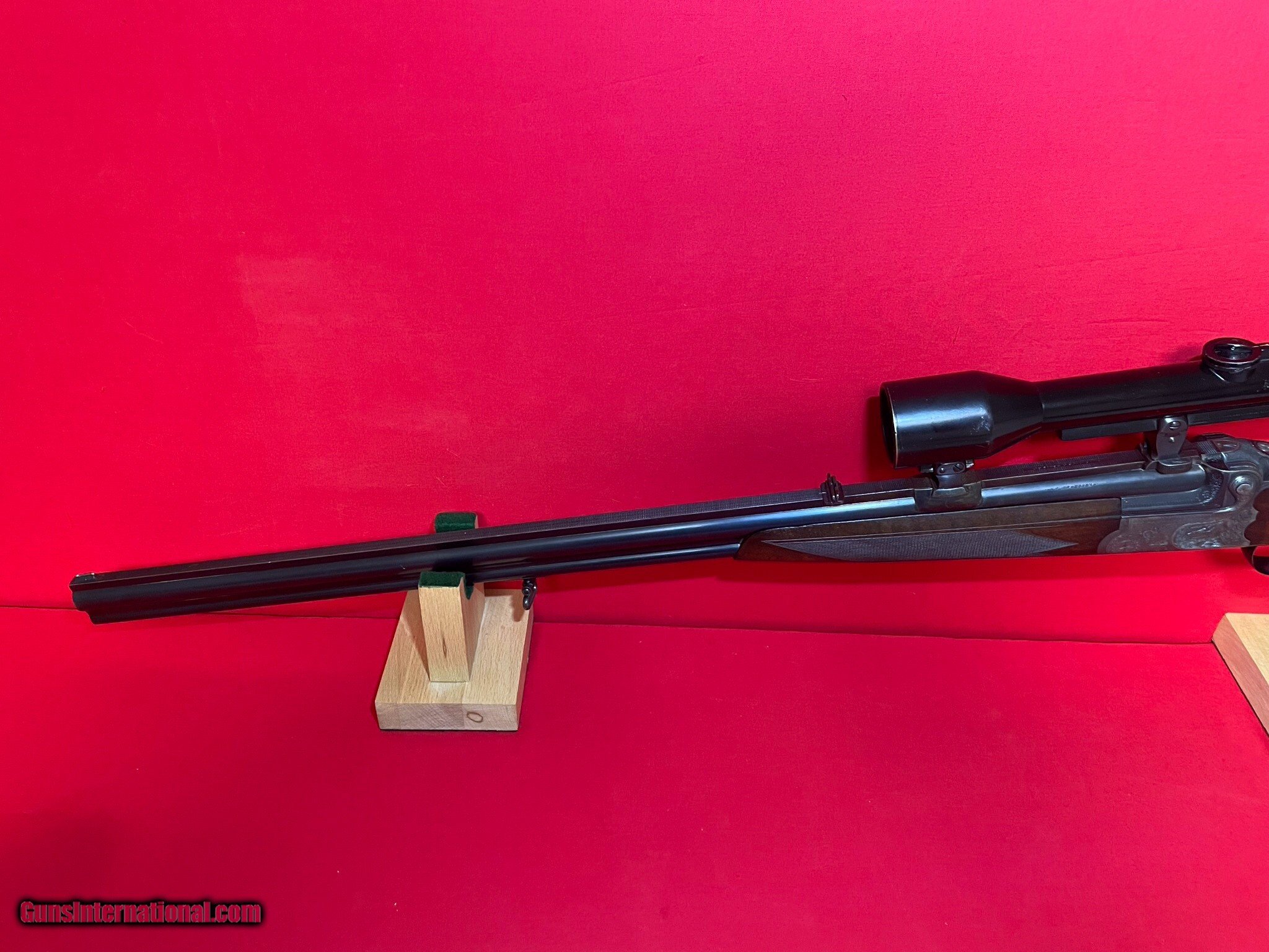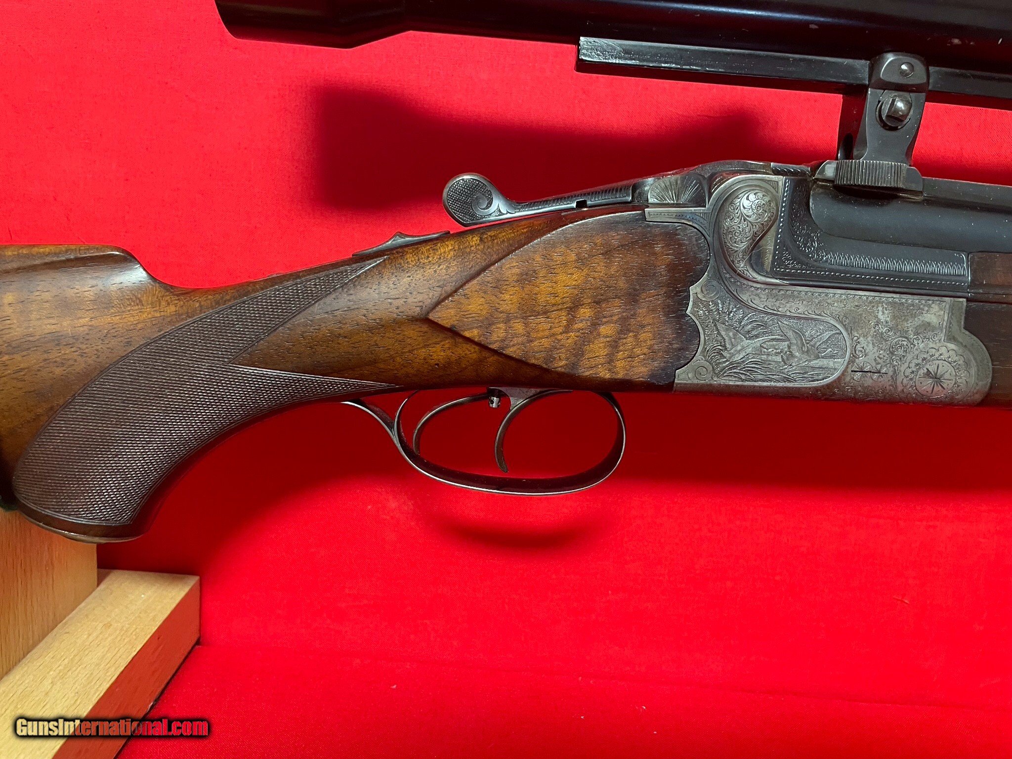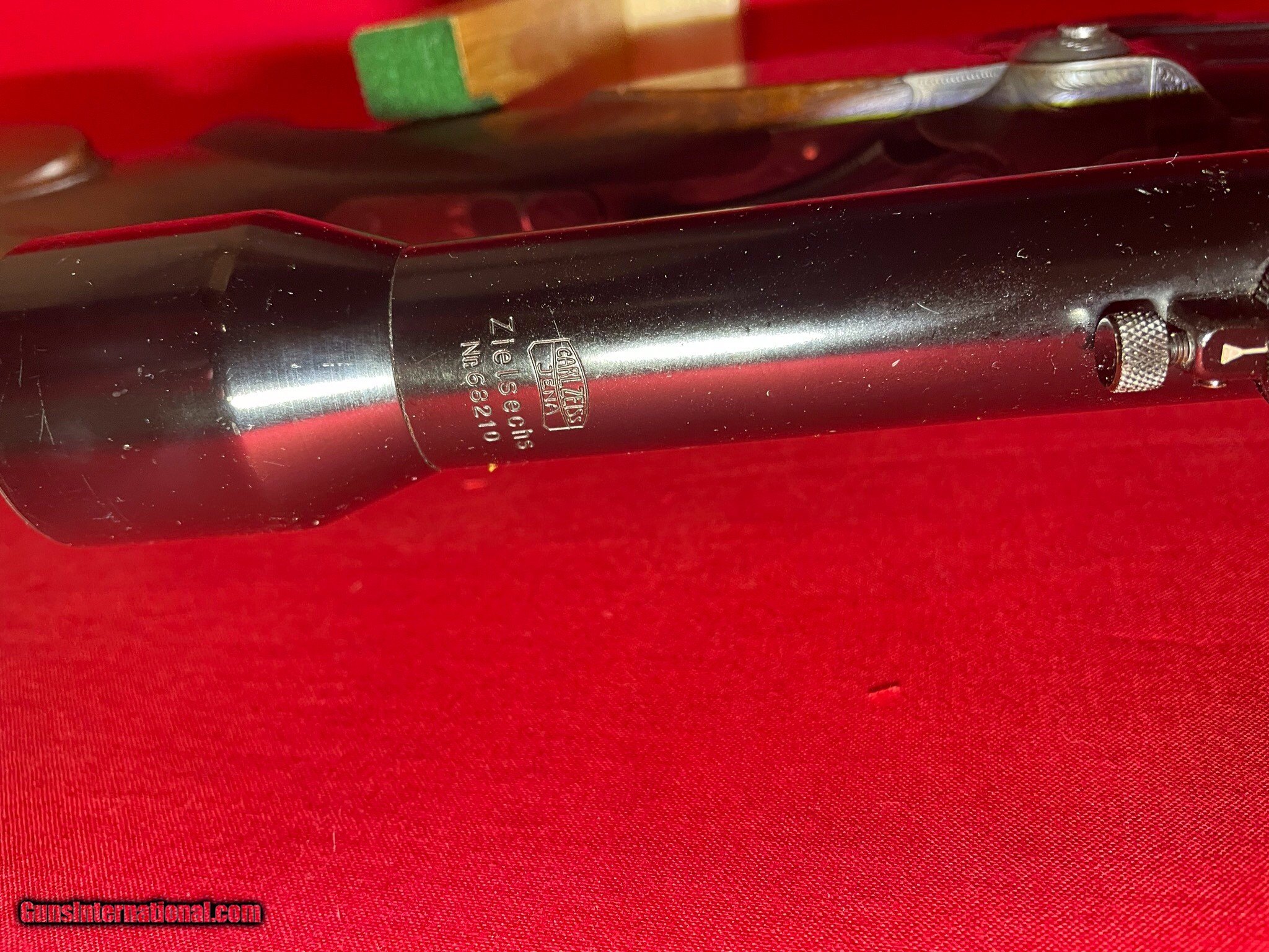 Description: Outstanding J.P. Sauer 16 gauge over 8x57 JR two barrel combination gun, (not a drilling) with empecable engravied game scenes on both sides and on the bottom of the receiver and has nice classic engraved scroll work as well, with a noice European Walnut figured stock. An all original 6 power Zeiss scope that snaps in the mounts with ease and a leather carrying case with a scope sock. The bluing is outstanding and the riffing is sharp and shiny. SOLD PENDING FUNDS. SOLD |