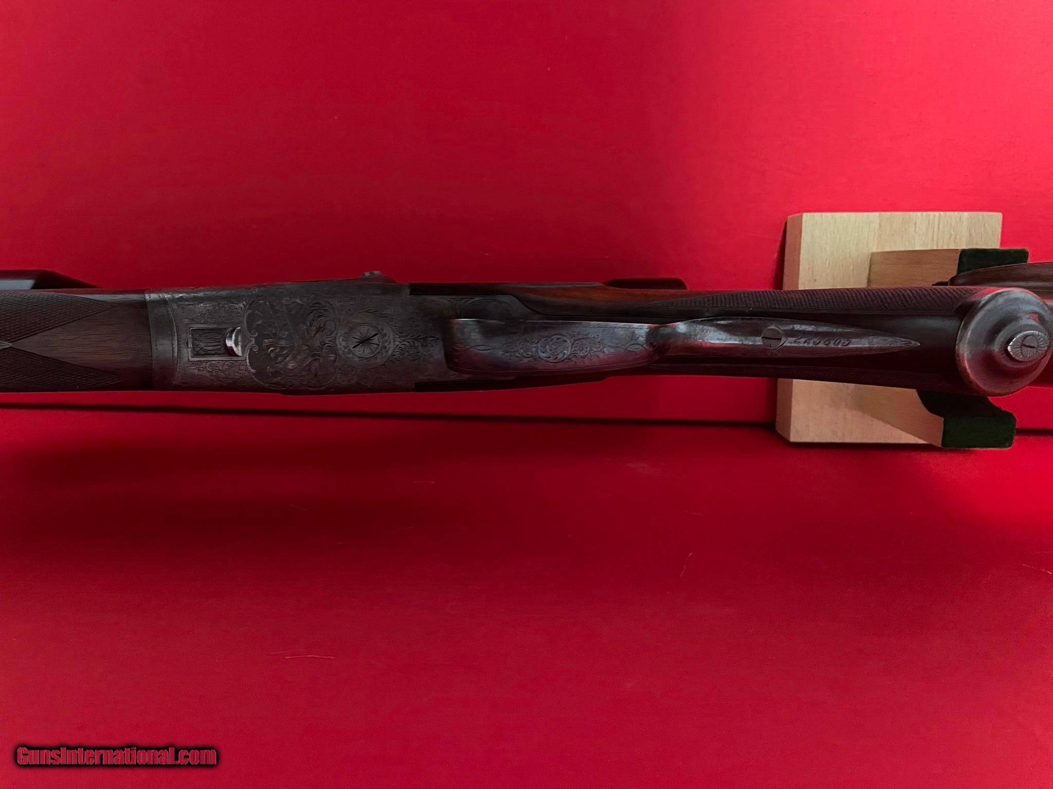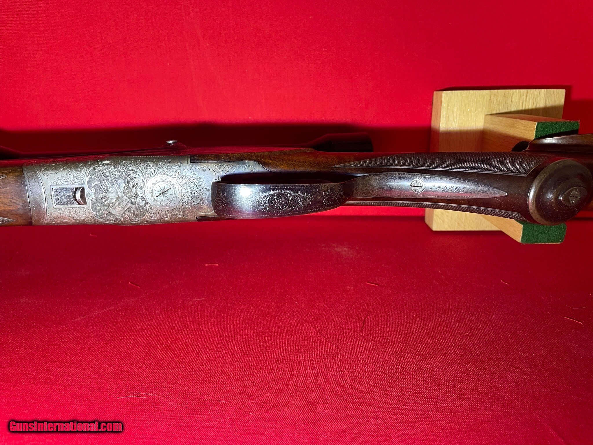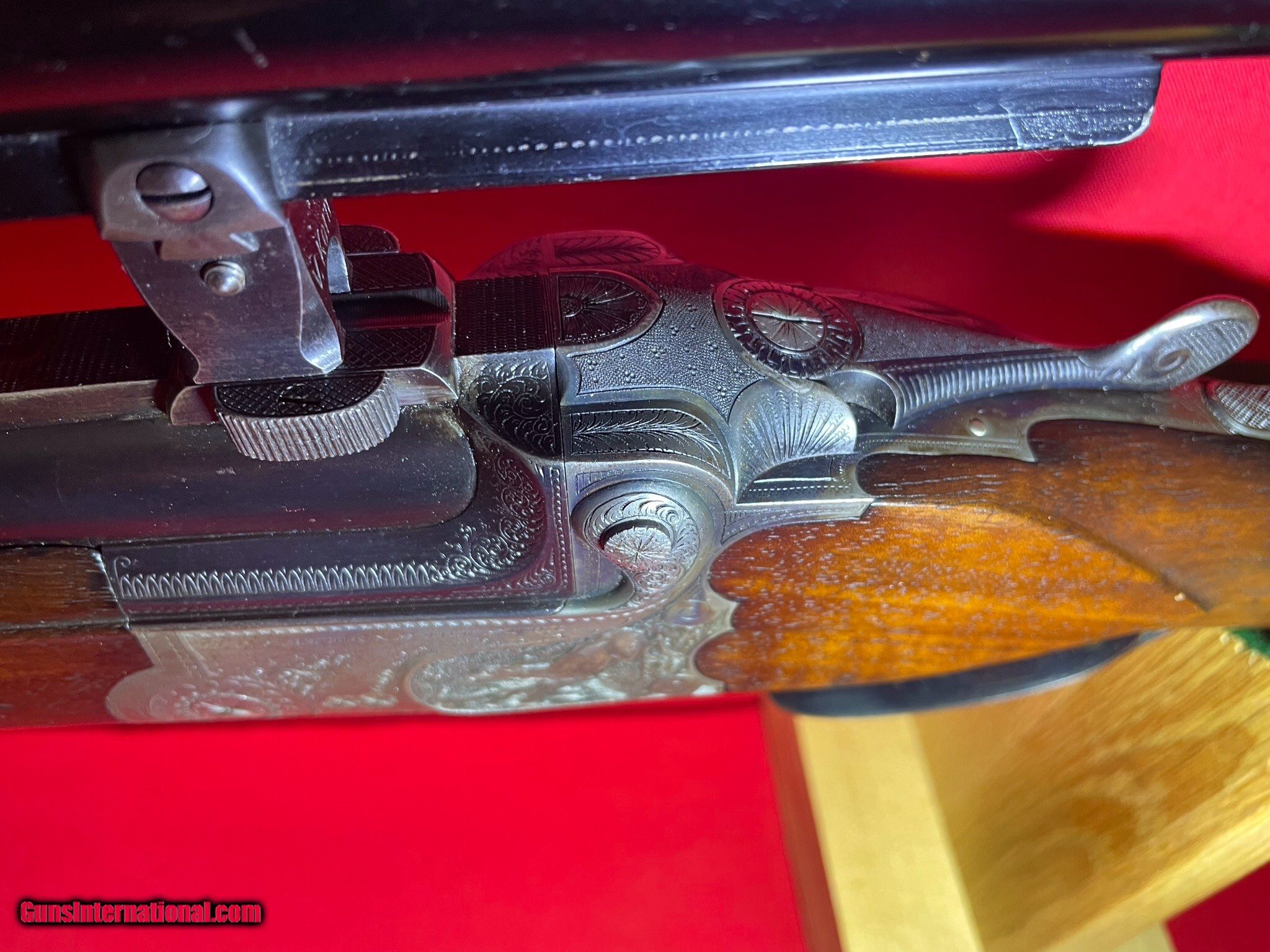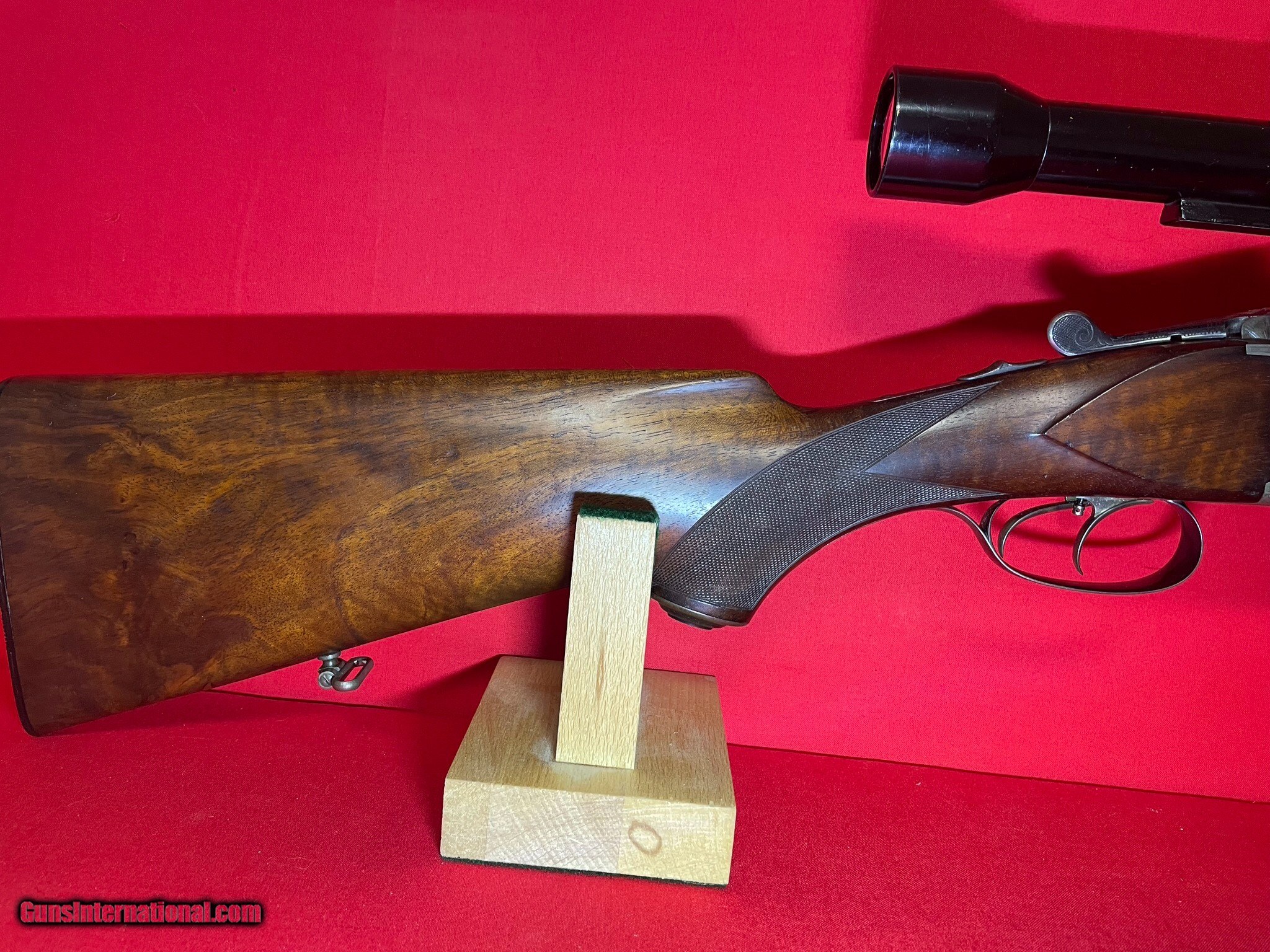 Description: Outstanding J.P. Sauer 16 gauge over 8x57 JR two barrel combination gun, (not a drilling) with empecable engravied game scenes on both sides and on the bottom of the receiver and has nice classic engraved scroll work as well, with a noice European Walnut figured stock. An all original 6 power Zeiss scope that snaps in the mounts with ease and a leather carrying case with a scope sock. The bluing is outstanding and the riffing is sharp and shiny. SOLD PENDING FUNDS. SOLD |