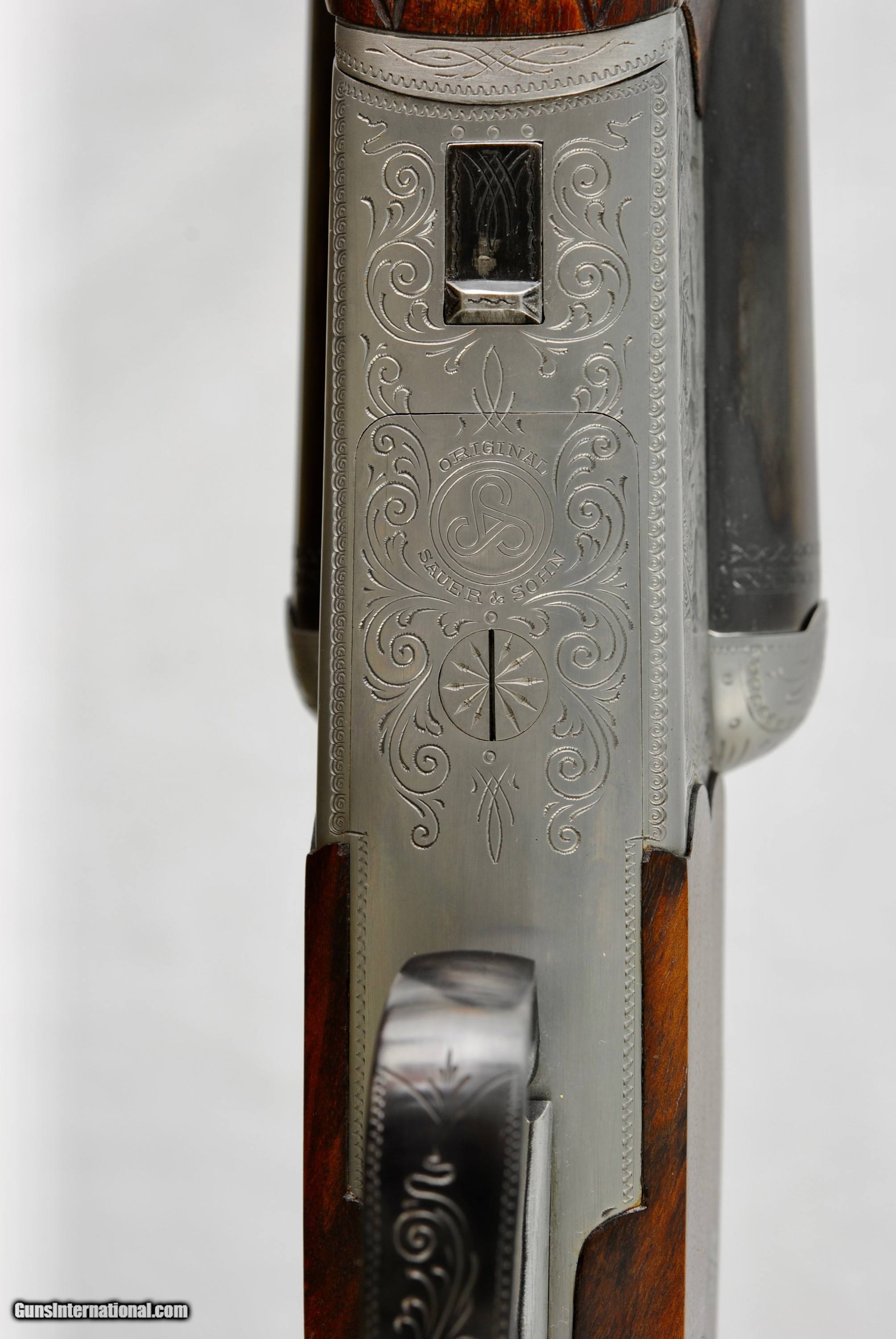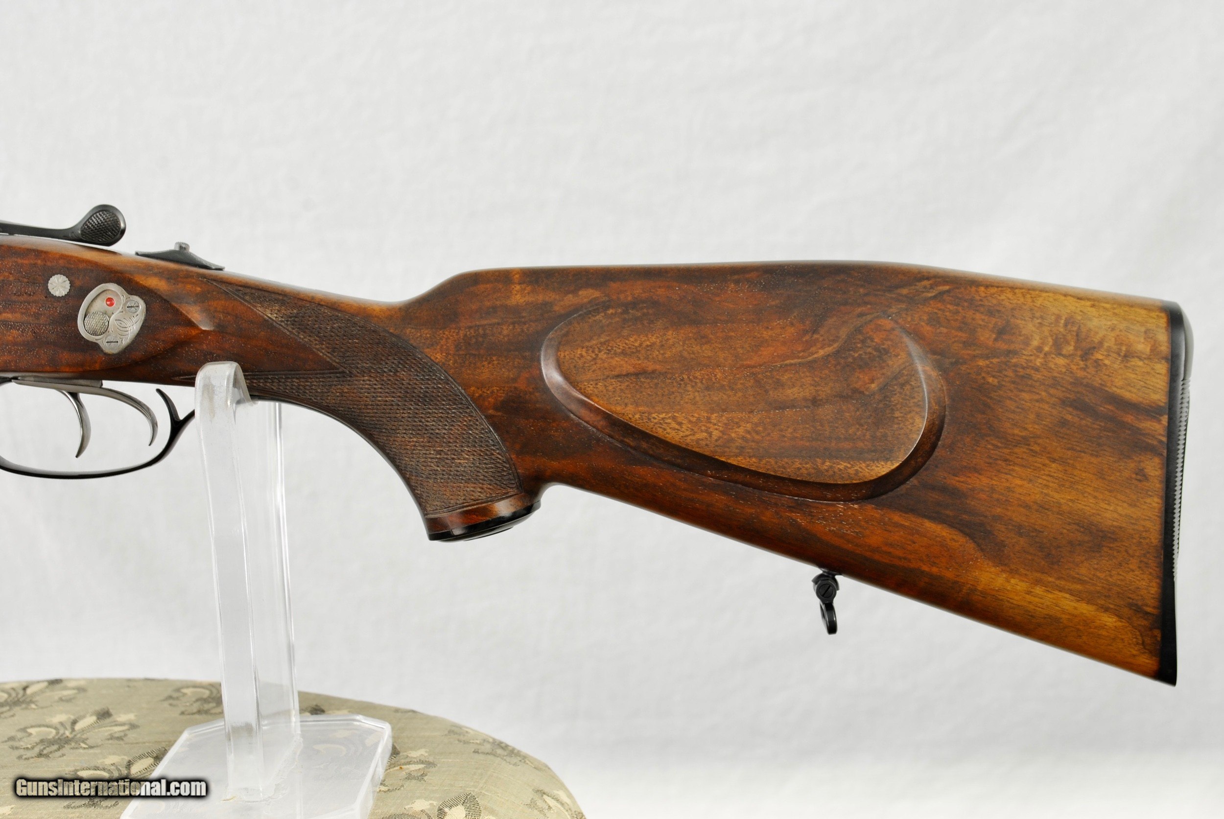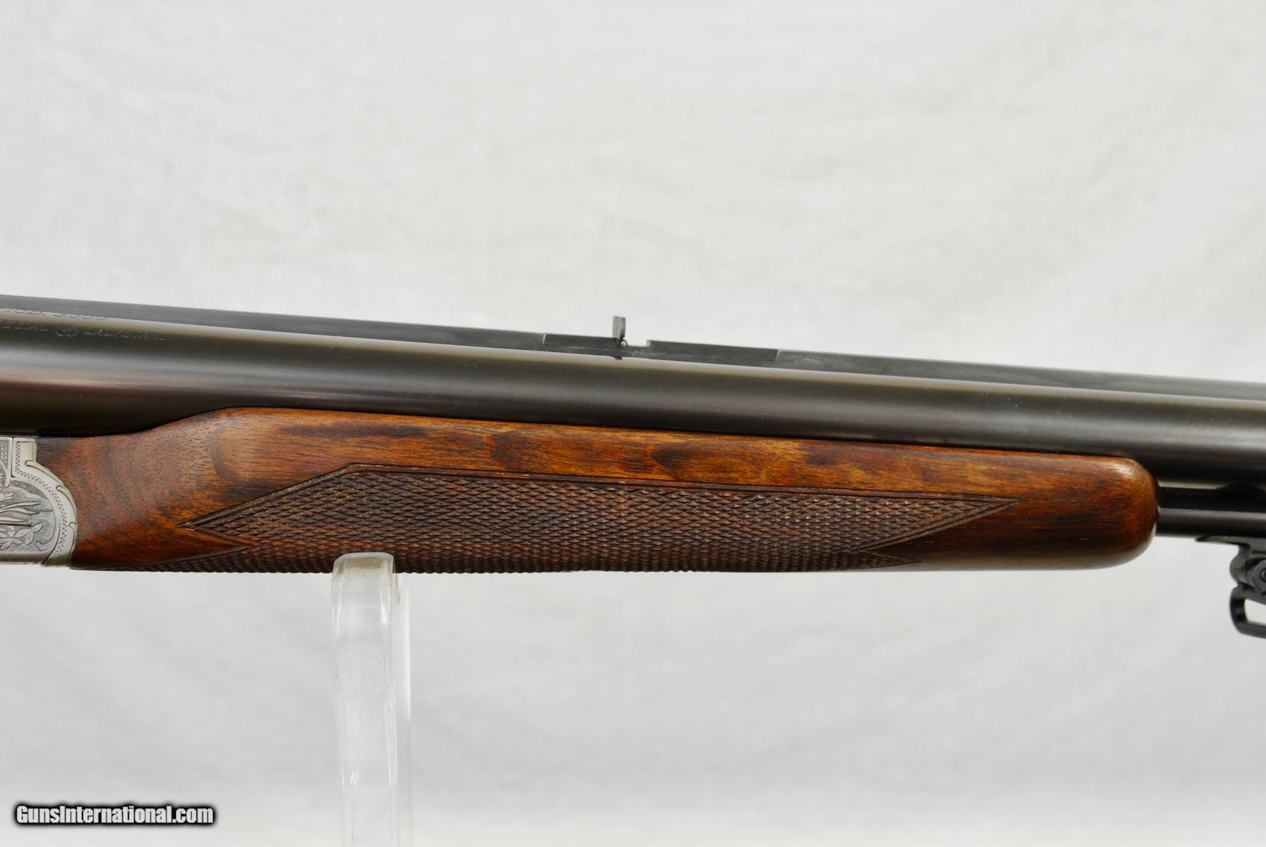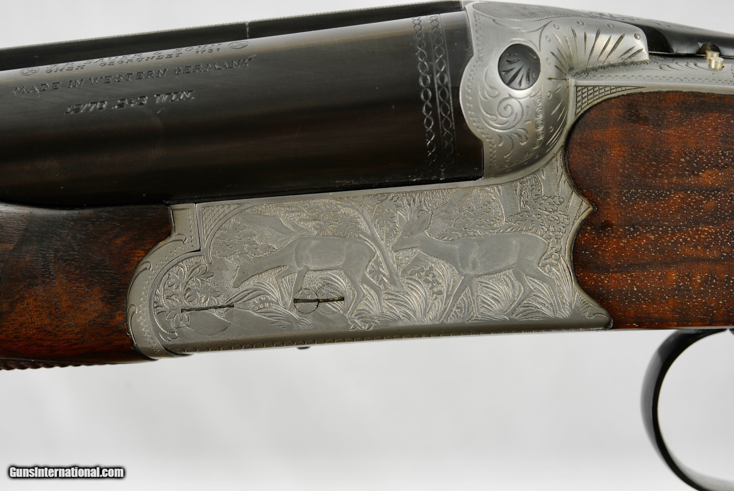 Description: JP Sauer Model 3000 Luxus Drilling in 12/12/.243. Deep relief engraved receiver wih high quality game scenes. New in Box. No paperwork. Gun was made in West Germany. Features include; sideclips, cocking indicators, side safety and extractors. Barrel is 25" with Mod and Full chokes. Shotgun chambers are 2 3/4". Rifle is actuated by sliding lever on top tang which also flips up the rear sight. Double underbite with Greener style cross bolt. Weight of gun is 7 LBS 13 1/4 OZ. LOP is 14 5/16". Drop at comb - 1 5/8". Drop at heel - 2 3/4". Shipping is $50. SOLD Rifle Caliber: .243 Winchester Shotgun Gauge: 12 Gauge |