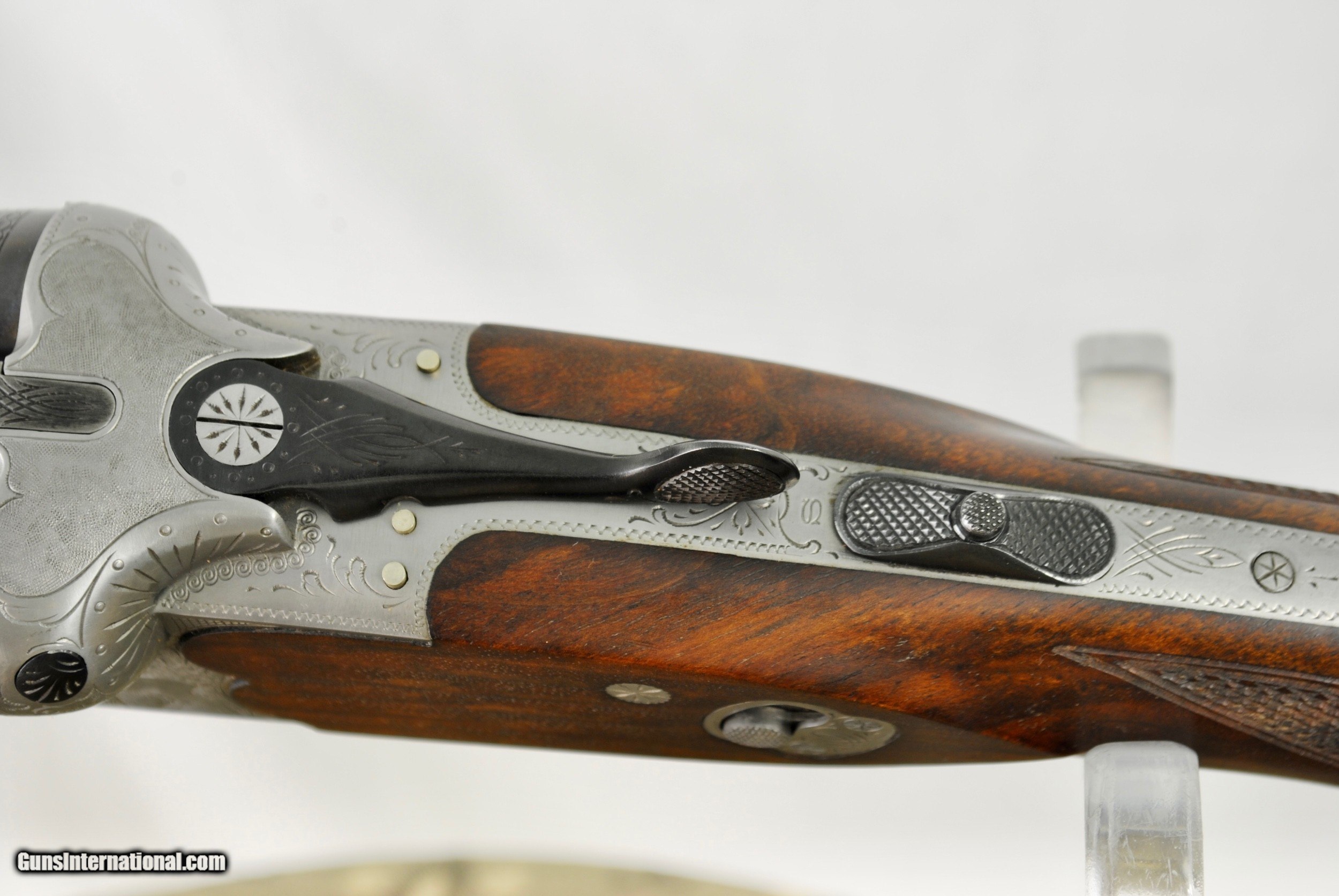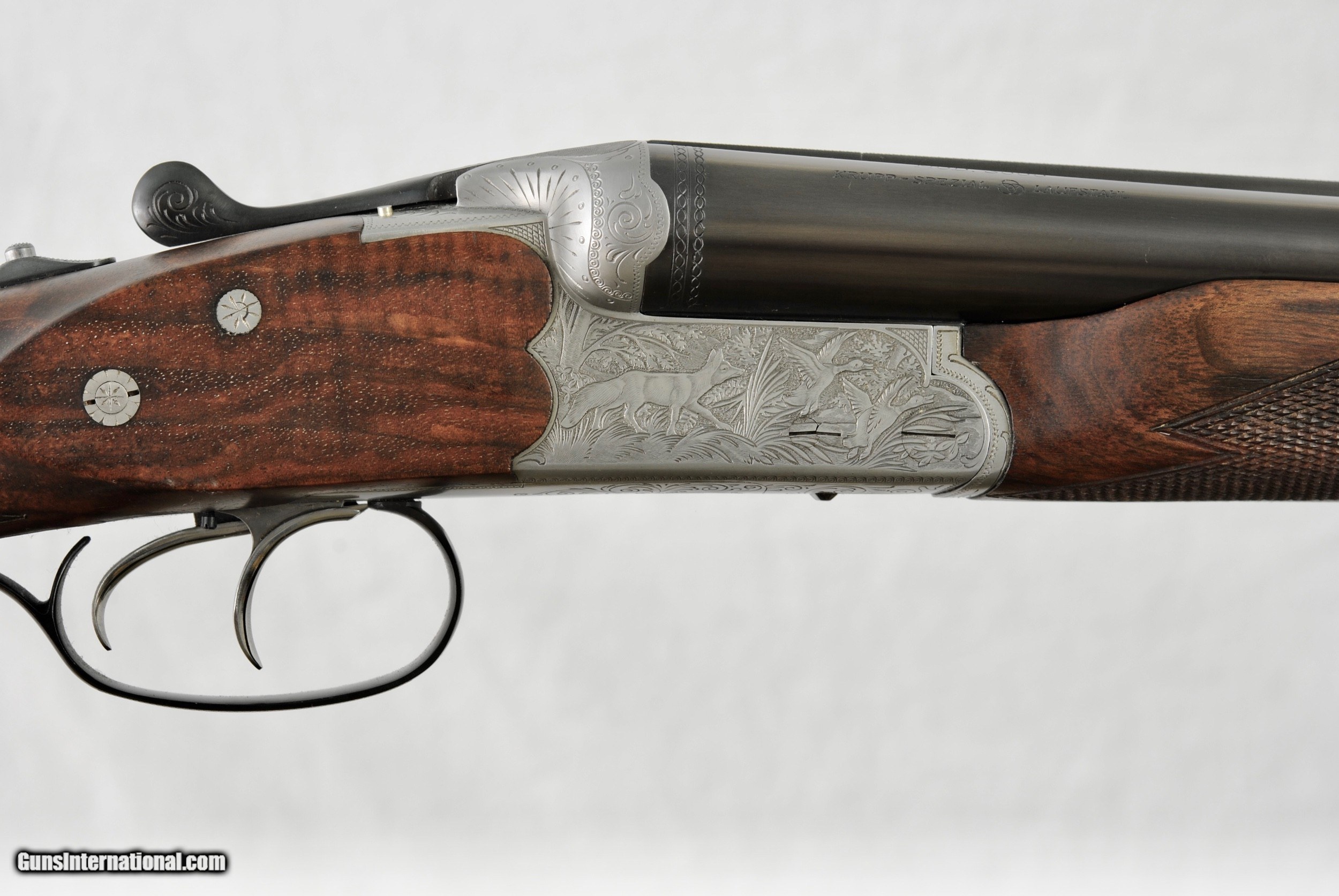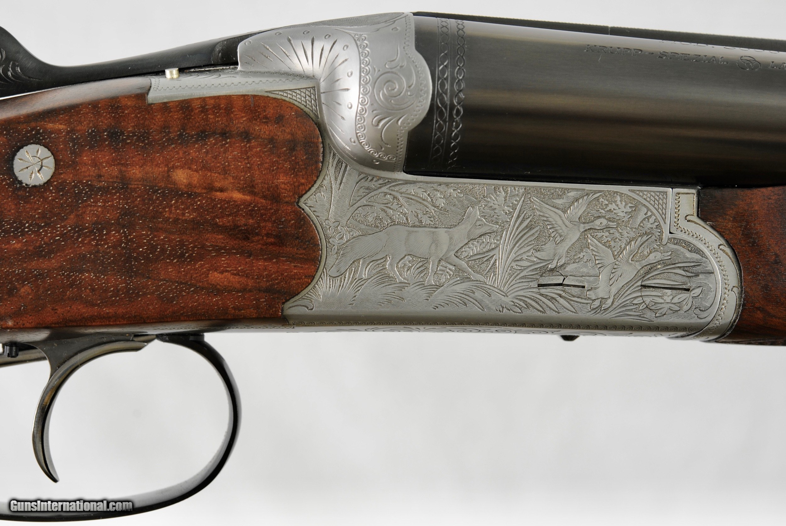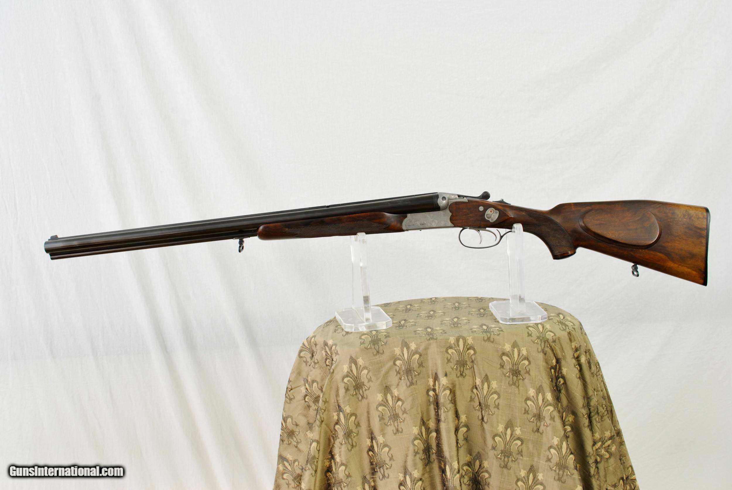 Description: JP Sauer Model 3000 Luxus Drilling in 12/12/.243. Deep relief engraved receiver wih high quality game scenes. New in Box. No paperwork. Gun was made in West Germany. Features include; sideclips, cocking indicators, side safety and extractors. Barrel is 25" with Mod and Full chokes. Shotgun chambers are 2 3/4". Rifle is actuated by sliding lever on top tang which also flips up the rear sight. Double underbite with Greener style cross bolt. Weight of gun is 7 LBS 13 1/4 OZ. LOP is 14 5/16". Drop at comb - 1 5/8". Drop at heel - 2 3/4". Shipping is $50. SOLD Rifle Caliber: .243 Winchester Shotgun Gauge: 12 Gauge |