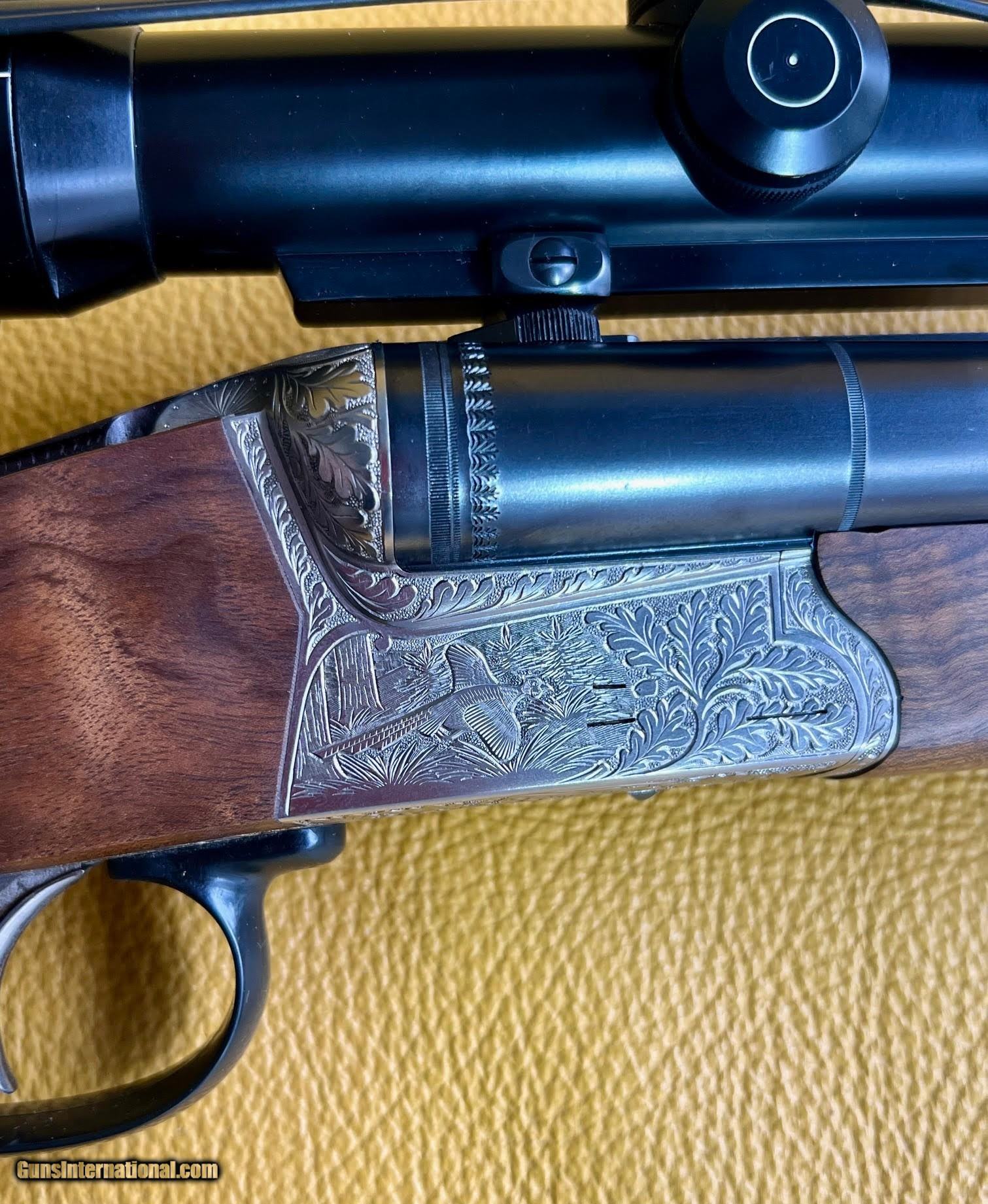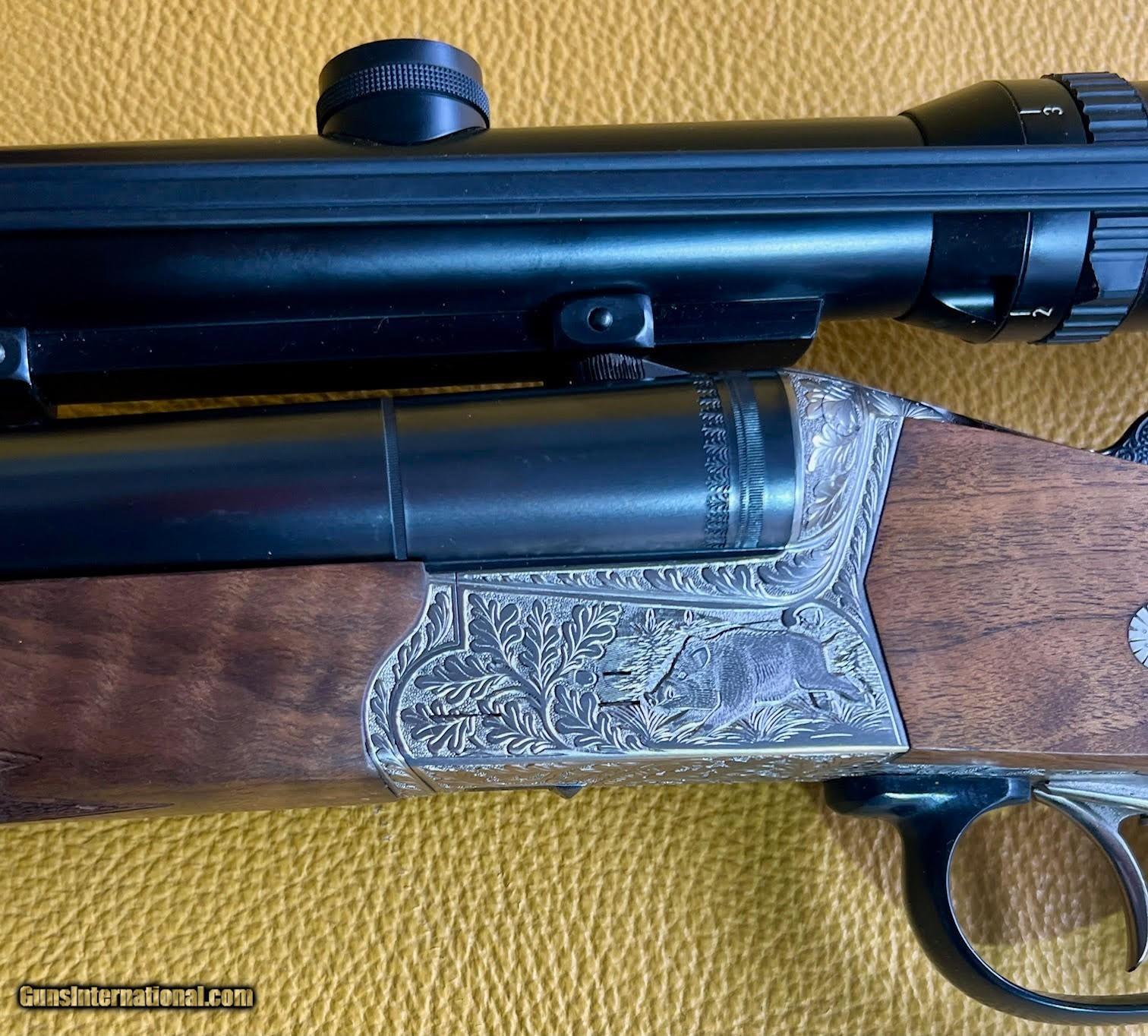 Description: Serial #91203, Made in 1991, 25” Boelher steel barrels, like-new bores and chambers (2 3/4” ) .723” ID with .014” loose Mod and .024” Imp Mod chokes. Blacking is in 95% plus condition. Claw mount with a Schmidt and Bender 1 1/4 to 4 x20 rail scope. Independent cocking and automatic rear sight. Tang safety, Set trigger. Tight on face with an action in top condition both mechanically and cosmetically. Weight is 7lbs 10 oz without the scope , 8lbs 13oz with. LOP is 14 3/8” over a 1/4” factory plastic plate. The wood shows some faint handling marks. This piece had a most sheltered life. Rifle Caliber: 7x65mmR Shotgun Gauge: 12 Gauge Manufacturer: Krieghoff Model: Trumpf Drilling 12 x 12 x 7x65R Serial Number: 91203 Barrel Length: 25” Boelher steel barrel Chambers: 2 3/4" like new Condition: Great condition Bore Condition: Like new LOP: 14 3/8 Weight: 7Lbs 10 Oz without the scope, 8 Lbs. 13 oz. with it Manufacture Date: 1991 Chokes: .723” ID with .014” loose Mod and .024” Imp Mod chokes Optic: Claw mount with a Schmidt & Bender 1 1/4 to 4 x20 rail scope Price: $6,200.00 Contact Seller |