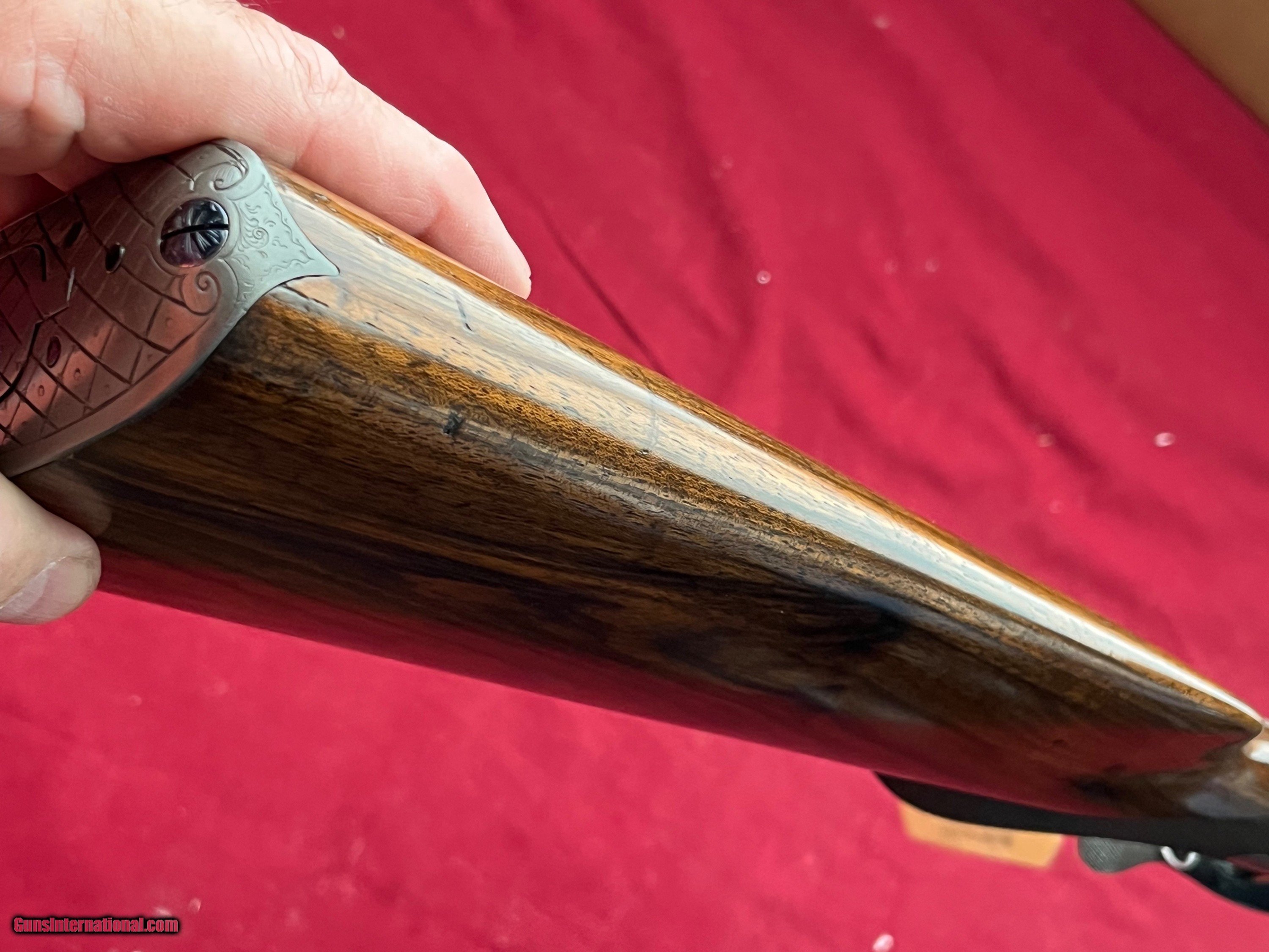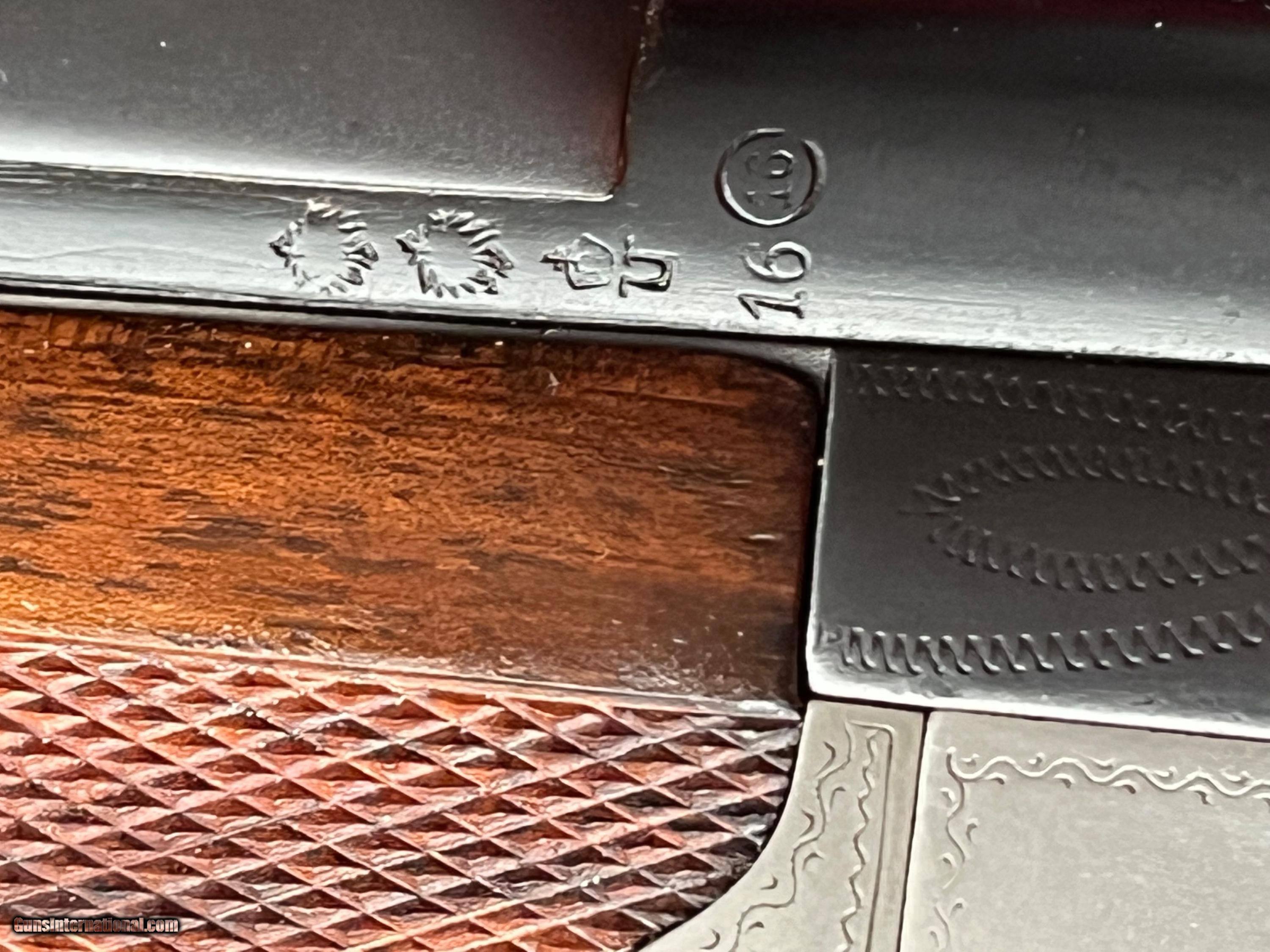 Description: Miller & Val Greiss Underlever Double Hammer Bockbuchsflinte combo rifle / shotgun serial #22486, 8x57JR by 16 ga., 25 3/4” barrels with very good to perhaps near fine bores, the top choked a light full. The rifle barrel shows good strong rifling, the shotgunbarrel is bright . The barrels retain about 98% plus restored rust blue, with some very light geometric engraving on the barrel flares. The frame, lockplates, underlever and forend iron hardware are all a pewter-tone gray. There is nice quality tight flowing scroll in perhaps 30% coverage, all of the screws and flip-up lollipop peepsight showing nice pale fire temper, the triggers with some pale straw. The checkered round knob European walnut buttstock and splinter style forend rate excellent as very lightly and professionally refinished,nice shape checkering. The length of pull to the checkered steel trapdoor buttplate is 13 7/8”. The barrels lockup tight on face with dual underbites and the rebounding locks seem to work properly with strong hammer springs, and the arm features double set triggers which function properly. Front sight is a simple silver bead and two leaf rear, and the aforementioned flip-up lollipop peepsight recessed into the tang. Dual claw mounts have been fitted to the rib which mount a Hensoldt Wetzlar Ziel-Dialyt 2 3/4X scope with crosshair reticle and cler optics. EASTERN BRANCH FIREARMS ADD 40.00 SHIPPING – NEXT DAY AIR SHIPPING ADD 50.00 SHIPPING – LONG GUNS GROUND OPTIONAL INSURANCE IS AVAILABLE AT 1.25 PER 100.00 Questions e-mail or call Glen at Eastern Branch Firearms 207-215-5021 TERMS – PLEASE READ BEFORE I DO NOT HAVE A LAYAWAY OPTION ( WE ACCEPT CREDIT CARDS ) -- I GET ALOT OF REQUEST FOR TRADES, I WOULD PERFER NOT TO DO TRADES ON MY INTERNET LISTINGS PAYMENT OPTIONS- We accept money orders, cashier’s checks , bank checks. sorry no personal checks. We accept all major credit cards please add 3% to the ’s cash discount price.(Shipping within the state of Florida - Florida Residents must pay sales tax) .Handguns and long guns do need to be shipped separate. PLEASE do not send payment via FED EX . USPS & UPS are fine. Thank you. We include a signed copy of our FFL with each firearm shipped. SAFTY NOTICE- Buyer is solely responsible for determining that a used gun is safe to shoot. The firearms offered have not been test fired but have been given a visual inspection only for purposes. It is a requirement that every used firearm is inspected by a qualified gunsmith before firing. By , the buyer agrees to hold seller harmless against damages, injury, or death caused by defective merchandise. RETURN POLICY- All firearms come with a 3-day non firing , non messing with ( turning srews ,taking apart,removing parts, scoping. firing, cleaning or messing with in anyway) inspection/return privilege.Inspection is based on a visual review of the gun to confirm the gun is in the condition stated. In the case of a return, buyer pays all shipping charges & if paid for with a credit card buyer absorbs the 3% credit card charges . So please ask questions BEFORE you bid. Thanks for Looking and Good Luck!! U.S. sales only, no exports…this includes antiques. I will ship to third party for exporting SOLD Curio/Relic: Yes |