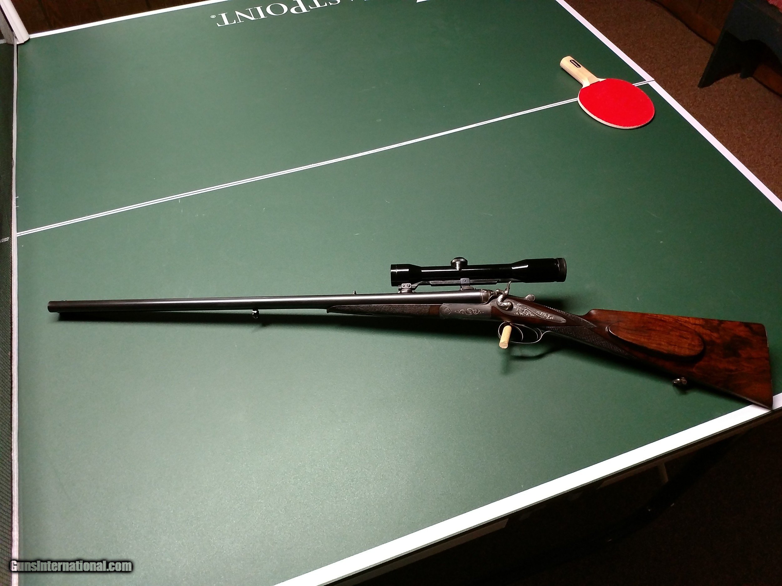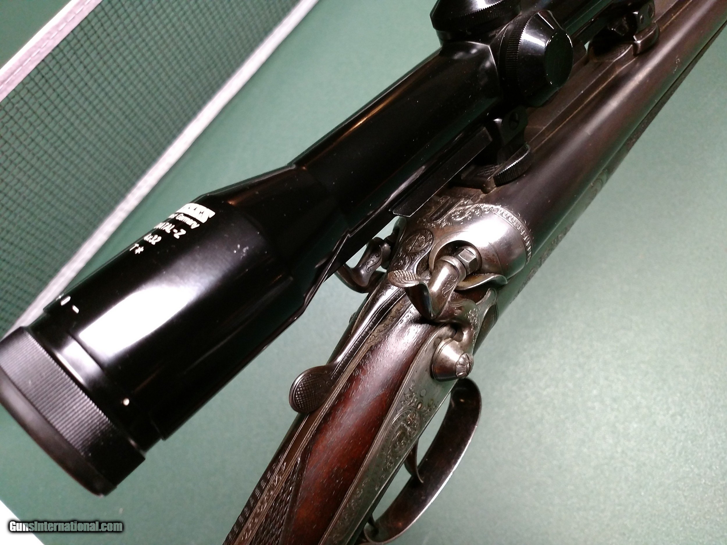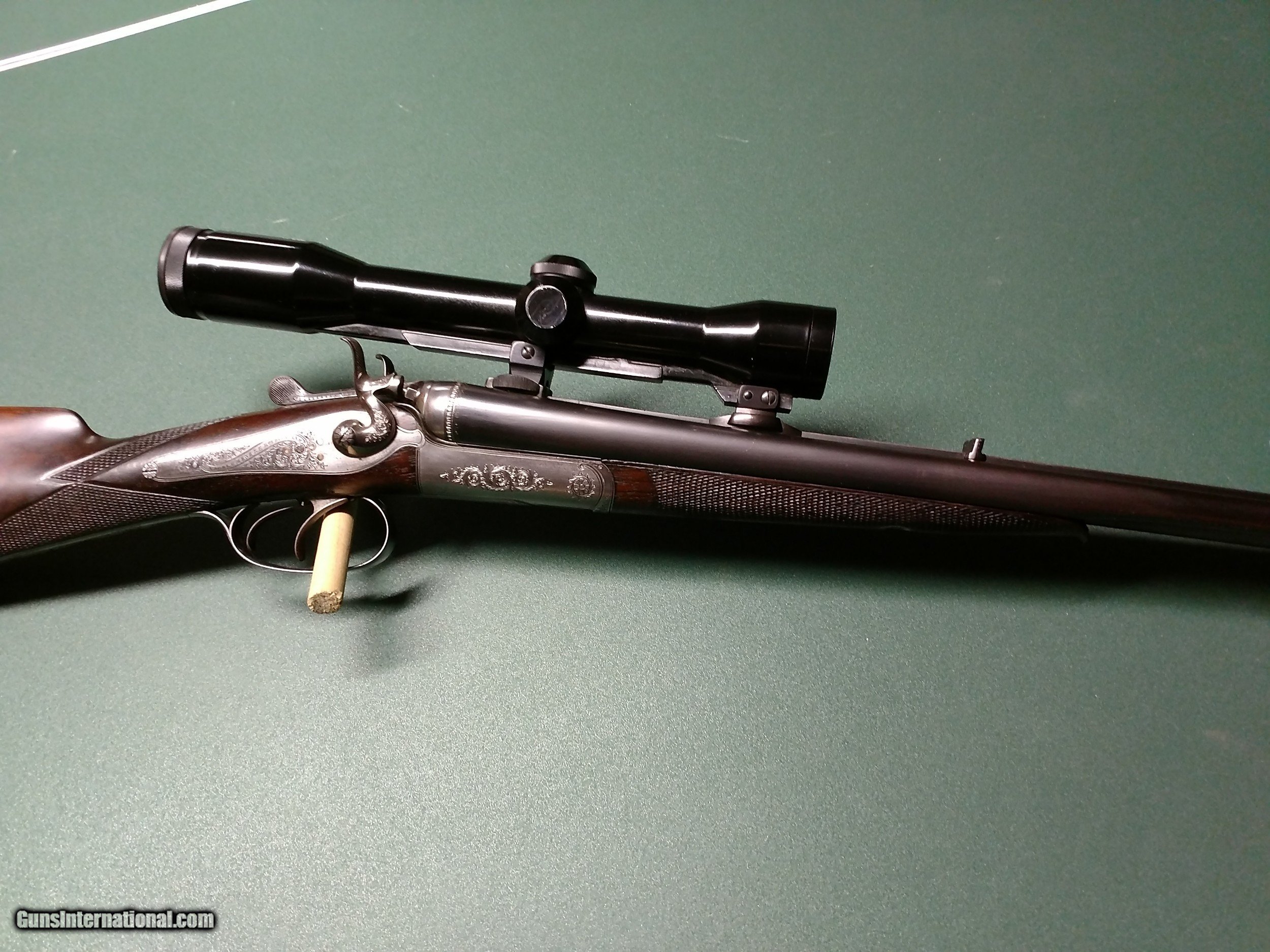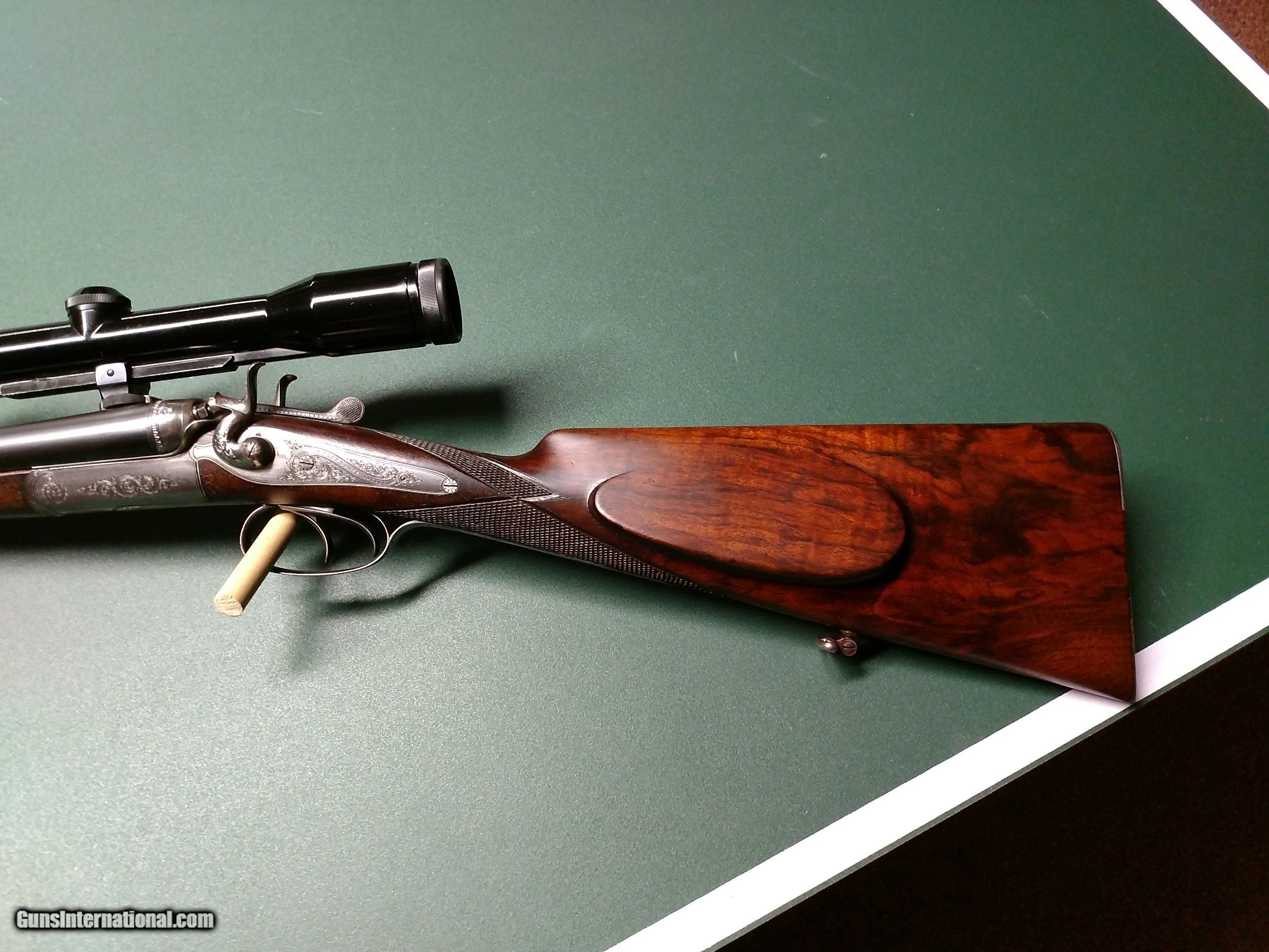 Description: SOLD PENDING FUNDS Extremely fine cape gun 16 x 9.3/72R. Glorious wood, fantastic engraving Claw bases and mounts for rail scope included. Fully engraved toe and heel Plates. Throws slug in shotgun barrel to same point of aim as rifle at 40 yards. Check out the engraving on this gun, awesome! Both Bores very good. SOLD |